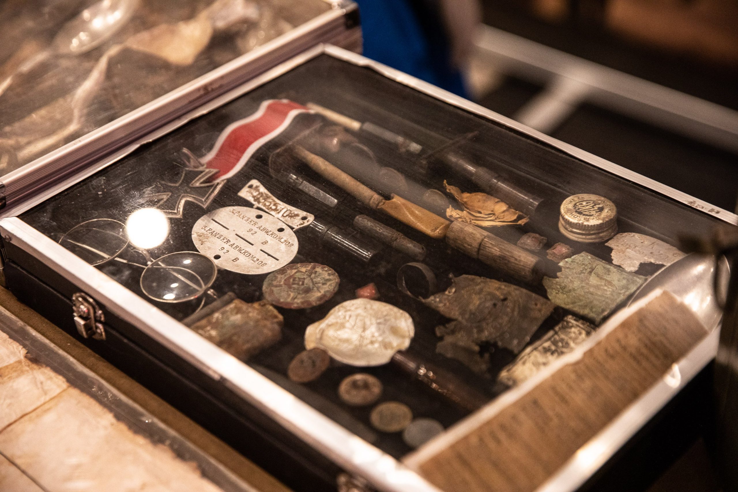 "Сегодня мы показываем на выставке уникальные предметы. Это большой массив документов, найденный в Карелии. Поисковикам удалось обнаружить сейф, принадлежавший саперной роте ленинградского народного ополчения. В этом сейфе хранились списки личного состава, приказы, карты, текст военной присяги и т.д. Часть этих материалов была передана в архив Министерства обороны, а остальные раритеты посетители могут увидеть в нашей экспозиции", - рассказал руководитель отряда Кирилл Долинский.