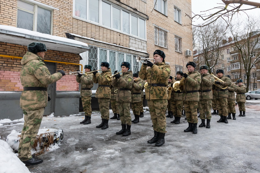 В квартире именинника артисты Росгвардии исполнили фронтовые песни, а у дома играл военный оркестр.