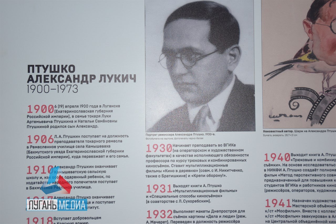 Экспозиция включает 10 планшетов, рассказывающих о жизни и творчестве одного из главных сказочников советского кинематографа, уроженца города Луганска Александра Лукича Птушко (1900‒1973). Также гости смогут пересмотреть отрывок из фильма знаменитого режиссера «Сказка о потерянном времени» в качестве примера комбинированных съемок, технику которых Александр Лукич тщательно и кропотливо придумывал и разрабатывал сам.