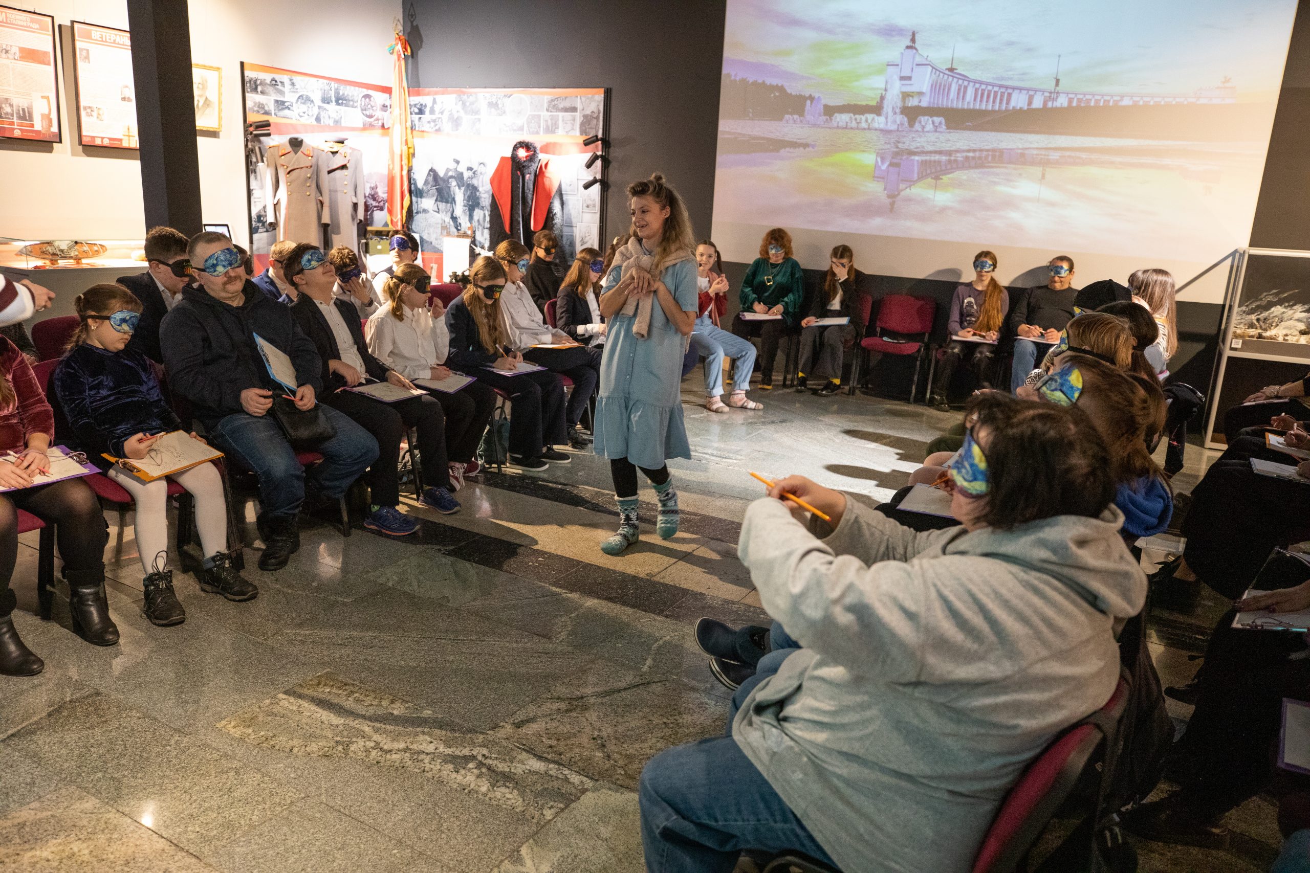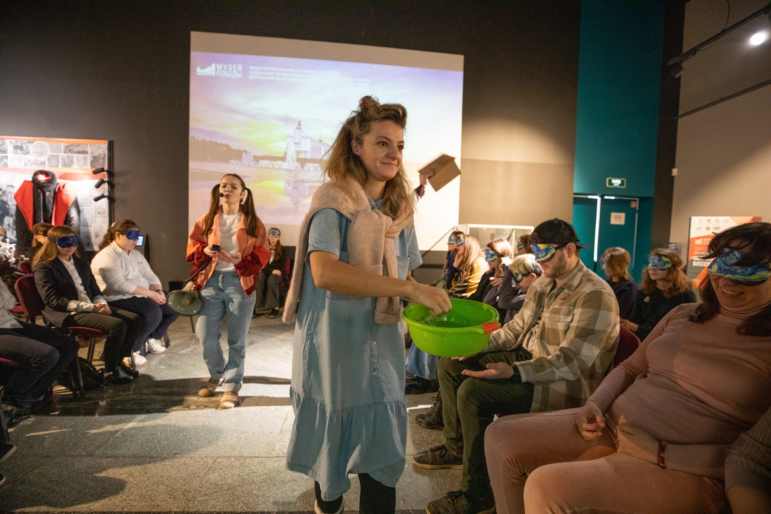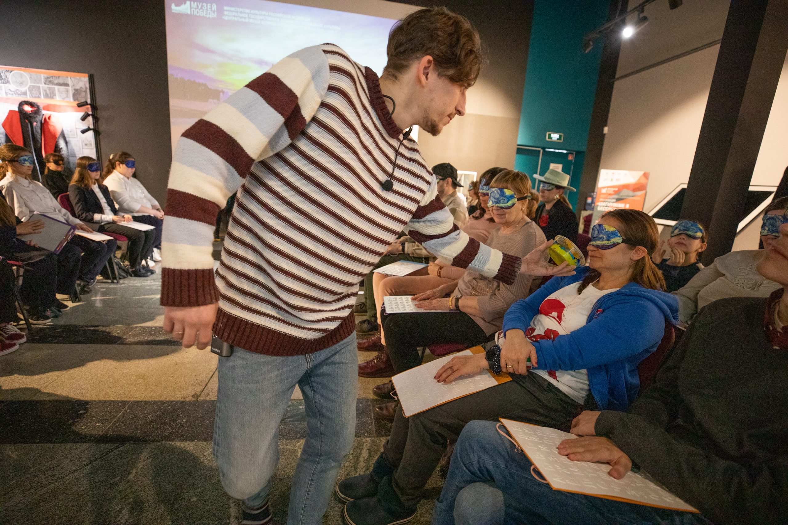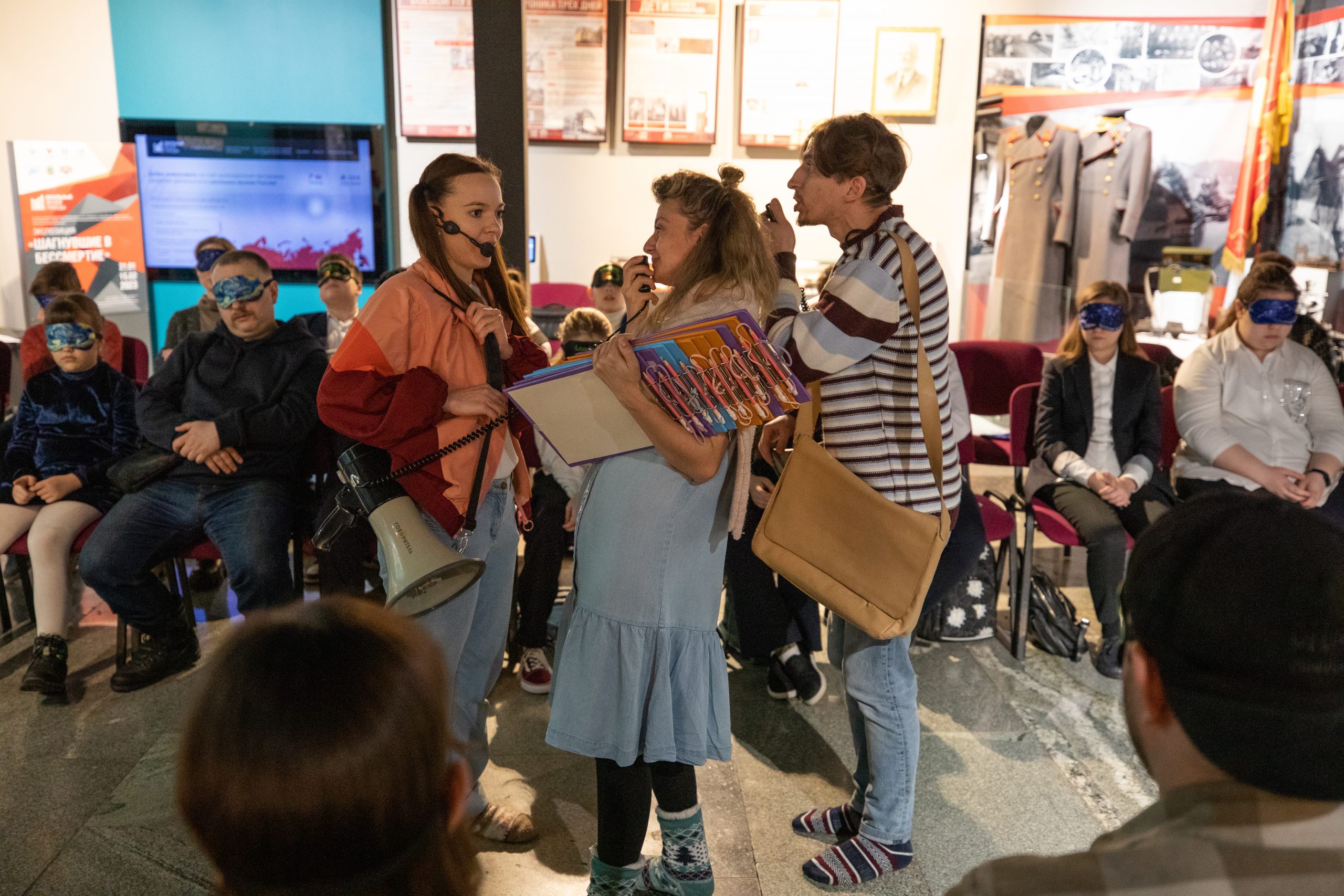 Профессиональный независимый театр для всей семьи «Мамин театр» показал в Музее Победы интерактивный спектакль «Дорогой дневник», который зрители «смотрят» в масках на глазах. В постановке рассказывается о великих людях, которые, вопреки проблемам со зрением, добились успеха в культуре и спорте.