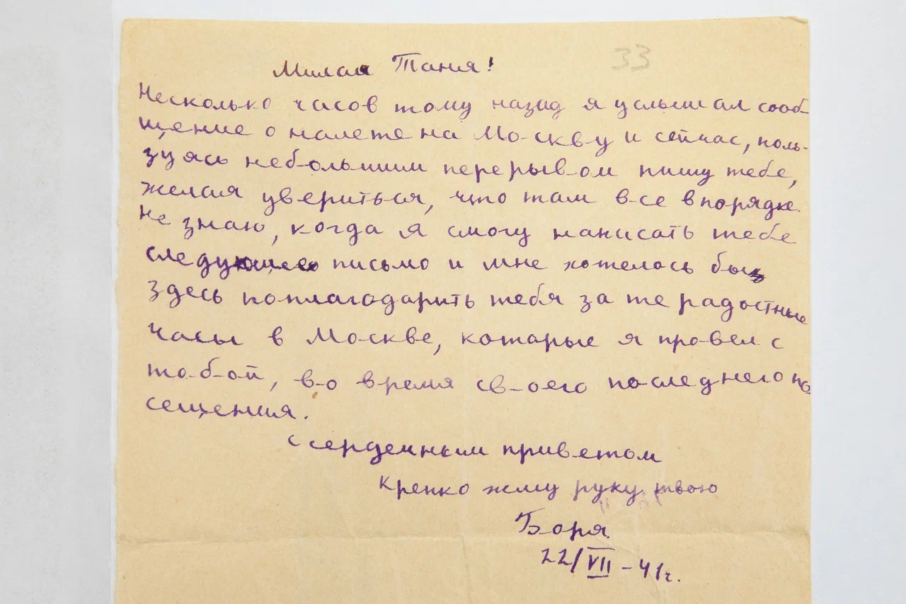 Самое короткое письмо Бориса Зибель-Вайсмана к Татьяне Крестовниковой было отправлено 22 июля 1941 года: