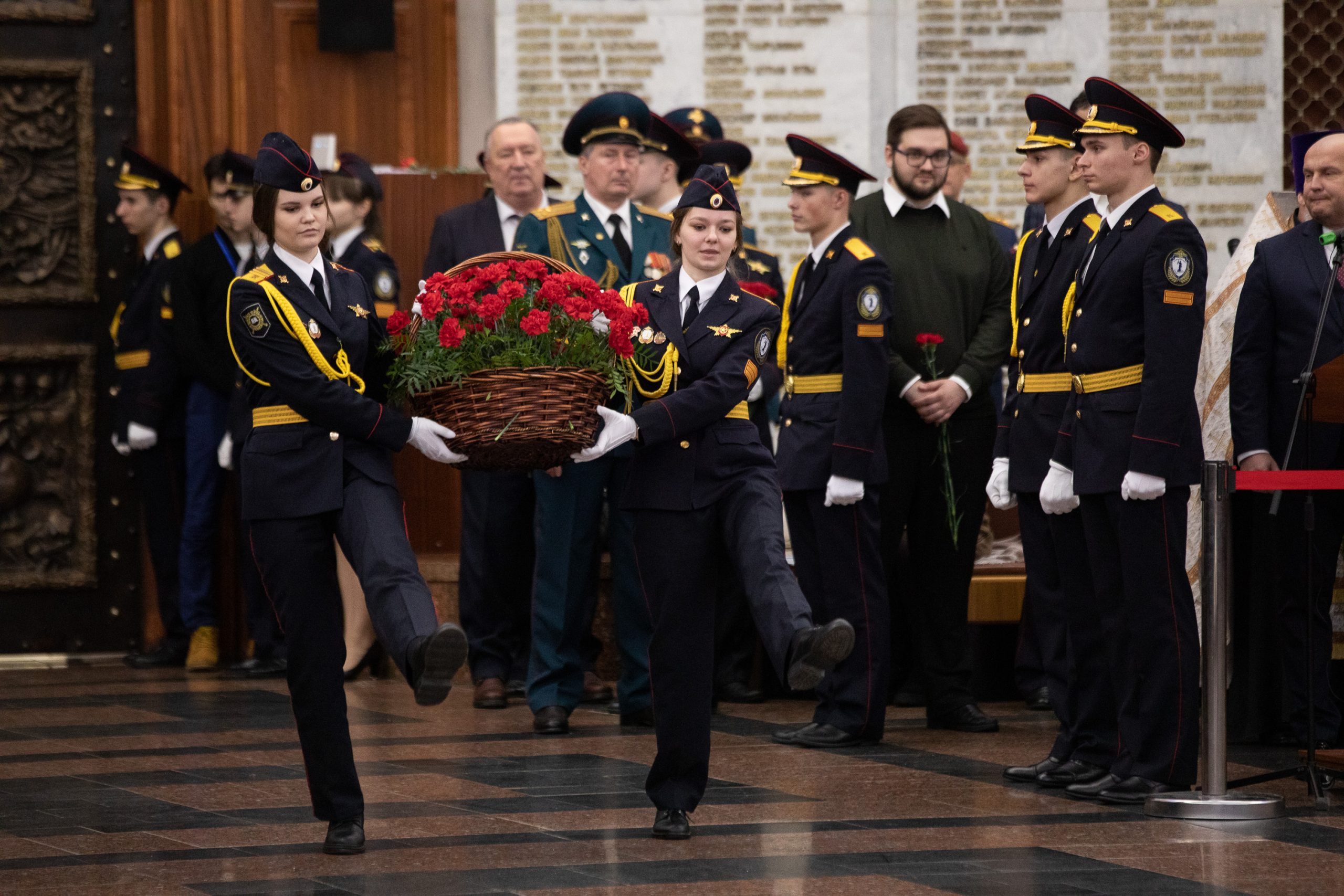 Курсанты возложили цветы к мемориалу в Зале Памяти и Скорби. Затем в Зале Славы состоялось вручение дипломов и торжественная церемония прощания со знаменем колледжа.