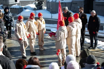 Во время митинга у памятника погибшим морякам гостям мероприятия торжественно представили символы IX этапа патриотической эстафеты – копию Знамени Победы, медаль «За оборону Советского Заполярья» и морскую офицерскую фуражку времен Великой Отечественной войны.