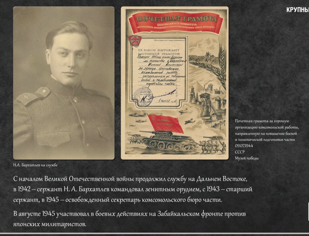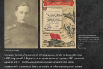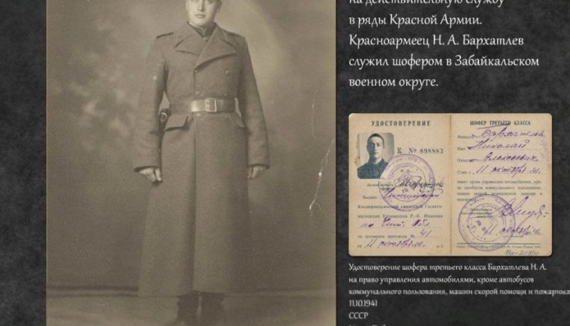«Во время форсирования Большого Хингана Николай Бархатлев управлял грузовым автомобилем, в кузове которого находилась группа бойцов. Из-за отсутствия дороги и плохих погодных условий колонна двигалась по руслу горного ручья. На одном из участков автомашина начала сползать в обрыв. Старший сержант Бархатлев приказал бойцам срочно покинуть автомашину и, находясь в кабине, удерживал ее, пока кузов не покинул последний боец», – рассказала куратор выставки, сотрудник экспозиционно-выставочного отдела Музея Победы Елена Ремизова.