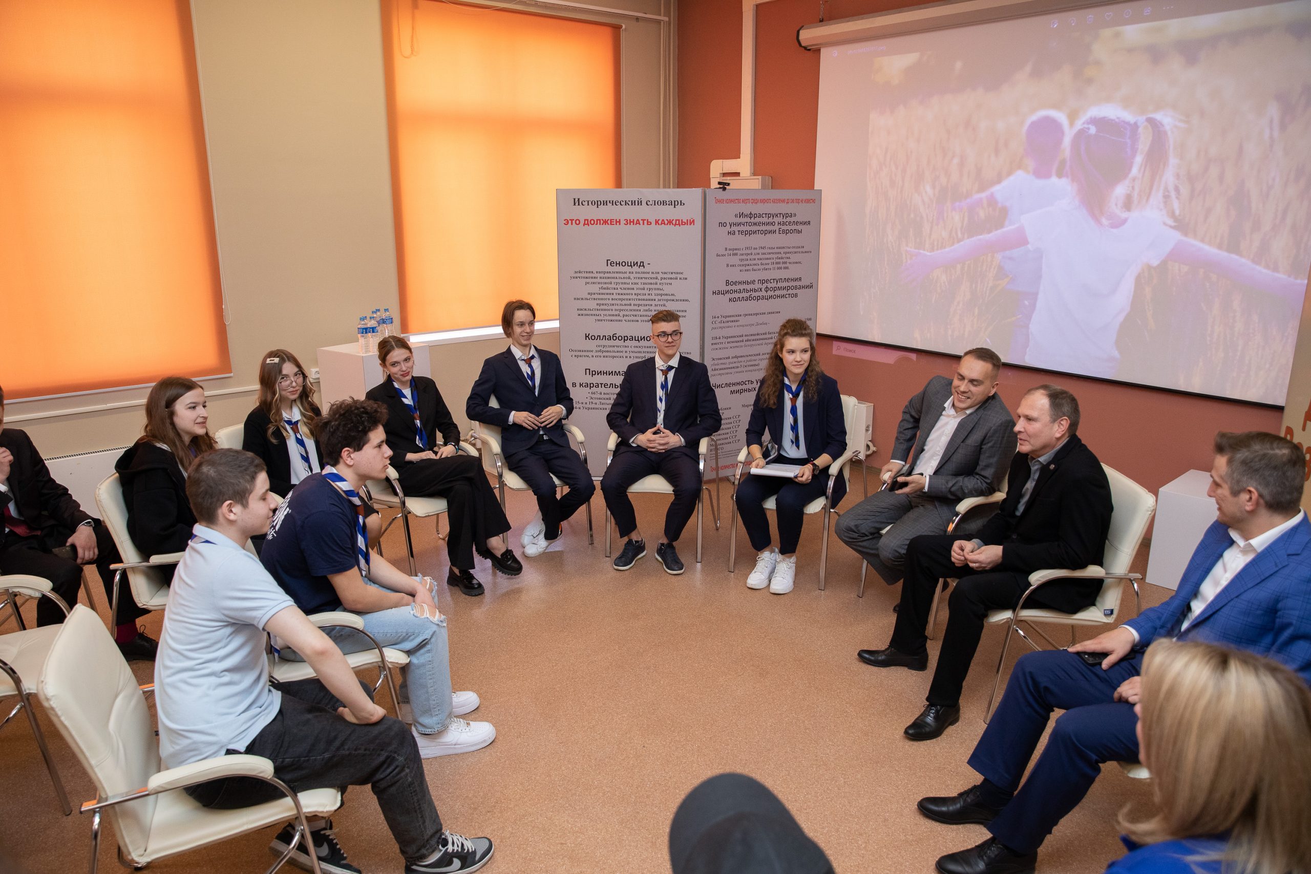 Во время встречи директор Музея Победы, заместитель секретаря Общественной палаты Александр Школьник ответил на вопросы ребят и рассказал о новых проектах, которые реализует Музей Победы, — выставках «Обыкновенный нацизм», «Обыкновенный НАТОцизм», «Zаветам Vерны», о проекте «Дети — детям», в рамках которой ребята сами проводят экскурсии и рассказывают гостям о Музее Победы.