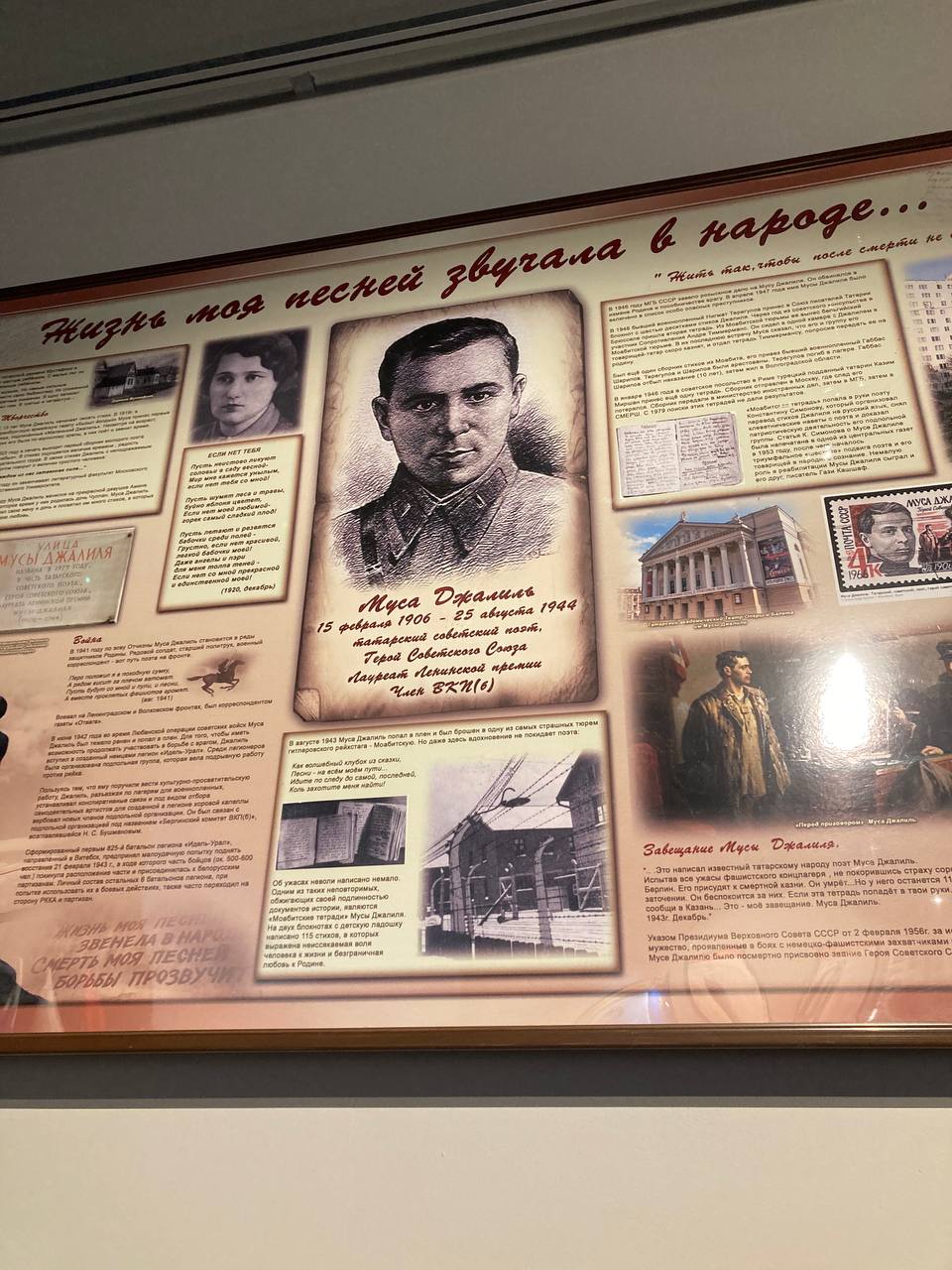 Третьеклассникам школы № 1186 рассказали о судьбе героя, его подвиге и творчестве. Урок мужества проводился на площадке выставки школьных музеев Москвы и Саратовской области «Родина. Подвиг. Судьба». Один из героев выставки – советский татарский поэт и военный корреспондент Муса Джалиль. В экспозиции представлены его бюст, цикл стихотворений «Моабитские тетради», отмеченный Ленинской премией, и копии писем.