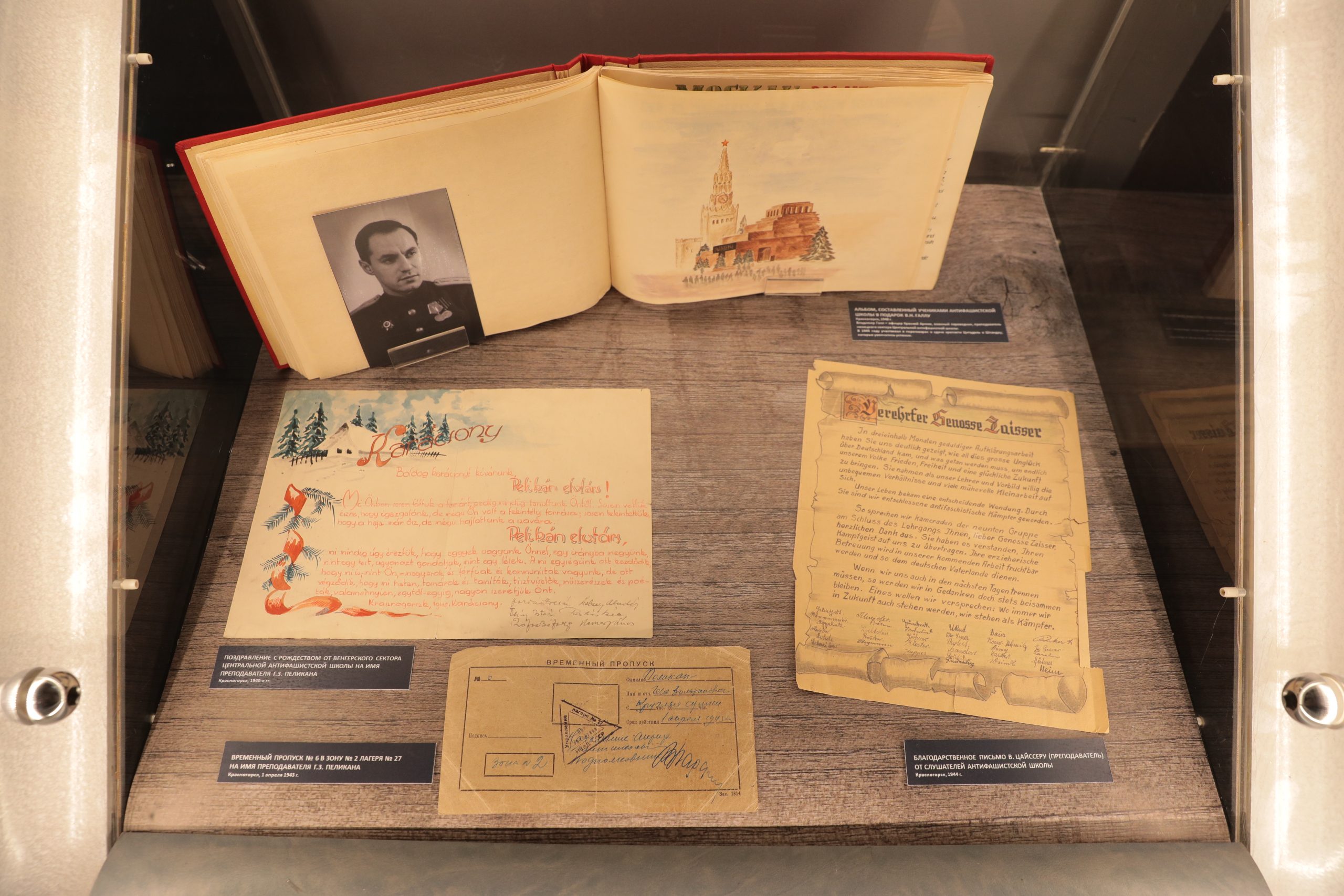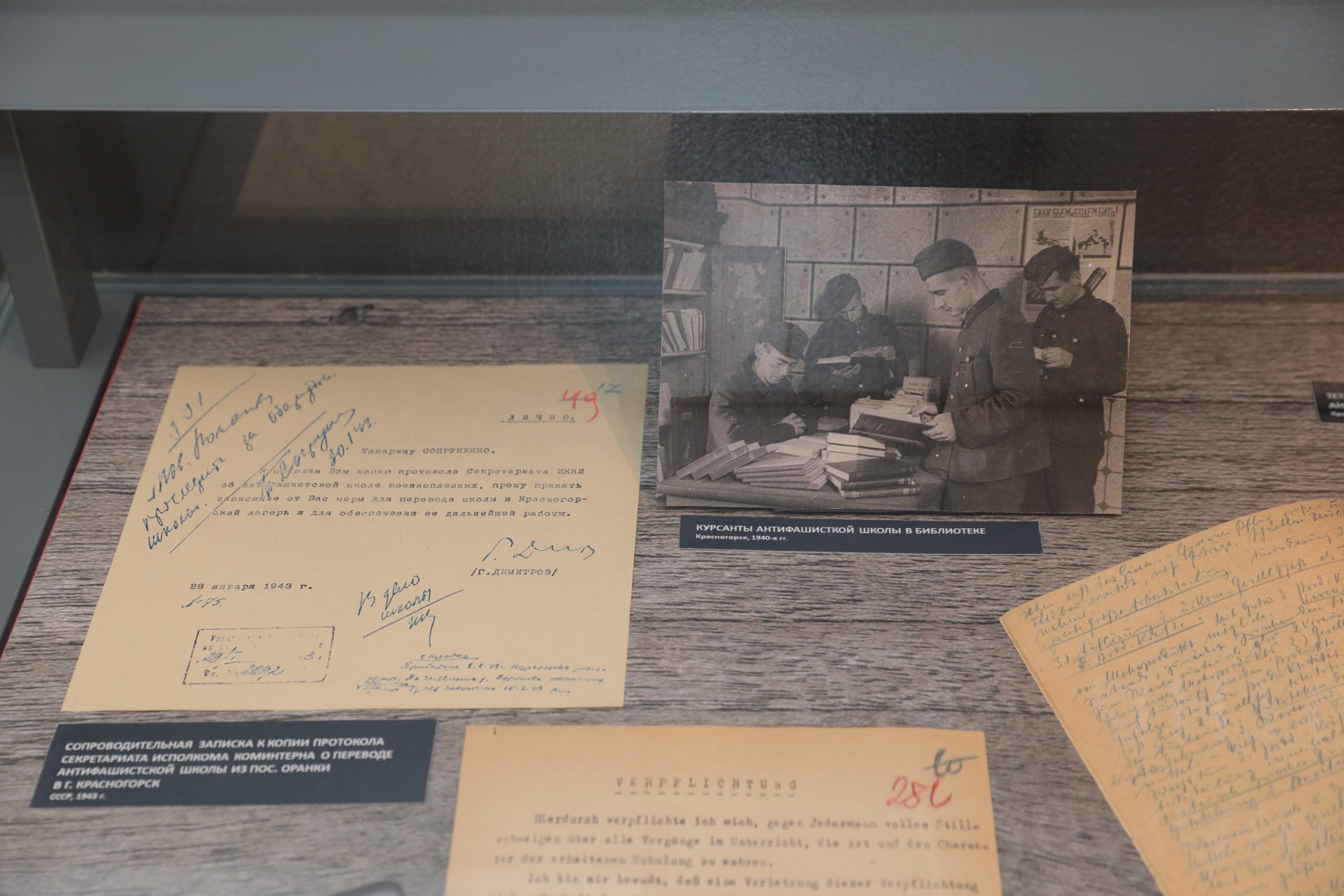В экспозиции представлены уникальные экспонаты из фондовой коллекции музея. Среди них — учебный план антифашистской школы для 8 курса и ученические тетради с записями лекций, а также благодарственное письмо от слушателей антифашистской школы, альбом, составленный учениками школы в подарок преподавателю, сопроводительная записка к копии протокола секретариата исполкома Коминтерна о переводе антифашистской школы из поселка Оранки (Горьковская область) в Красногорск.