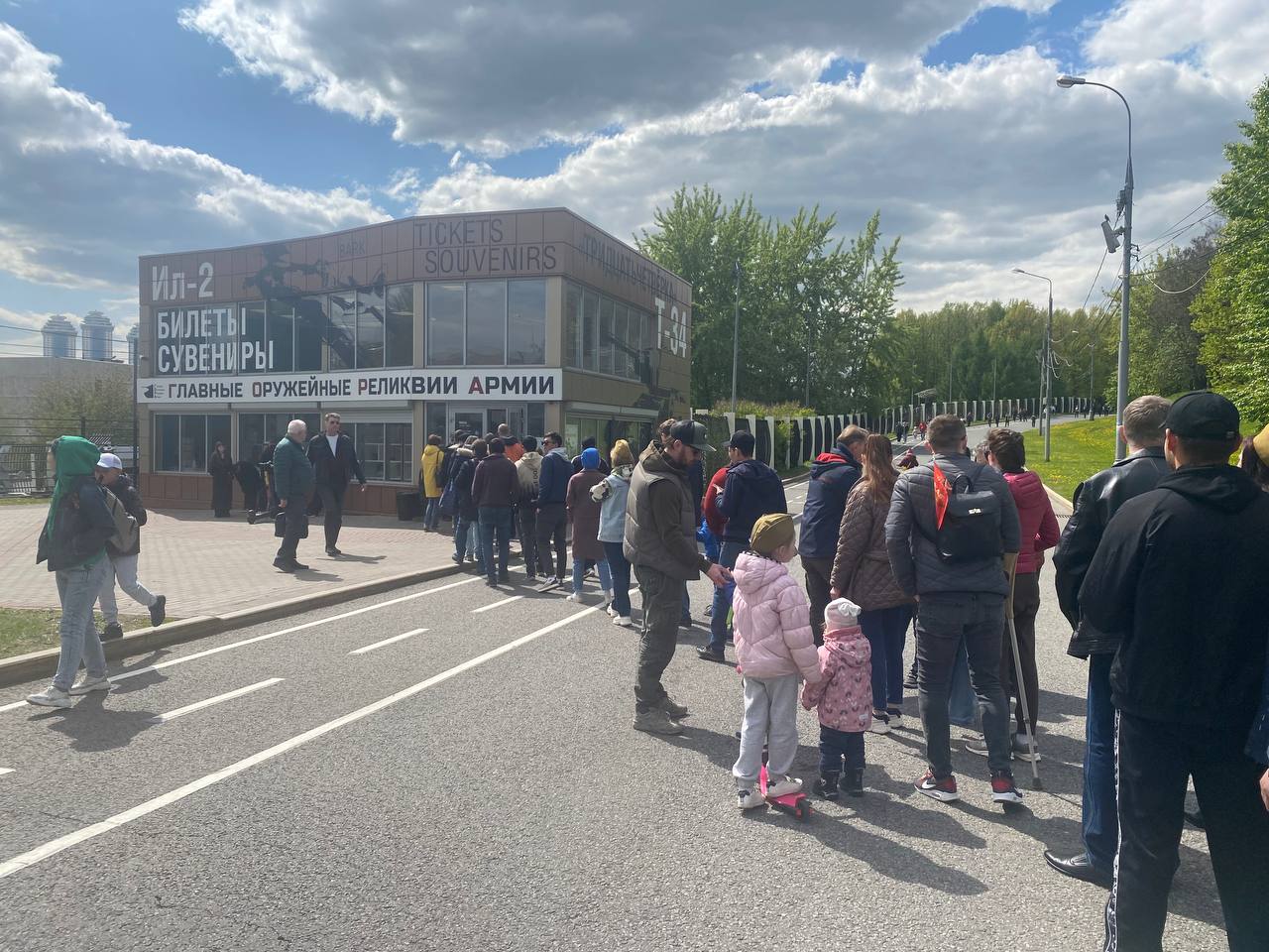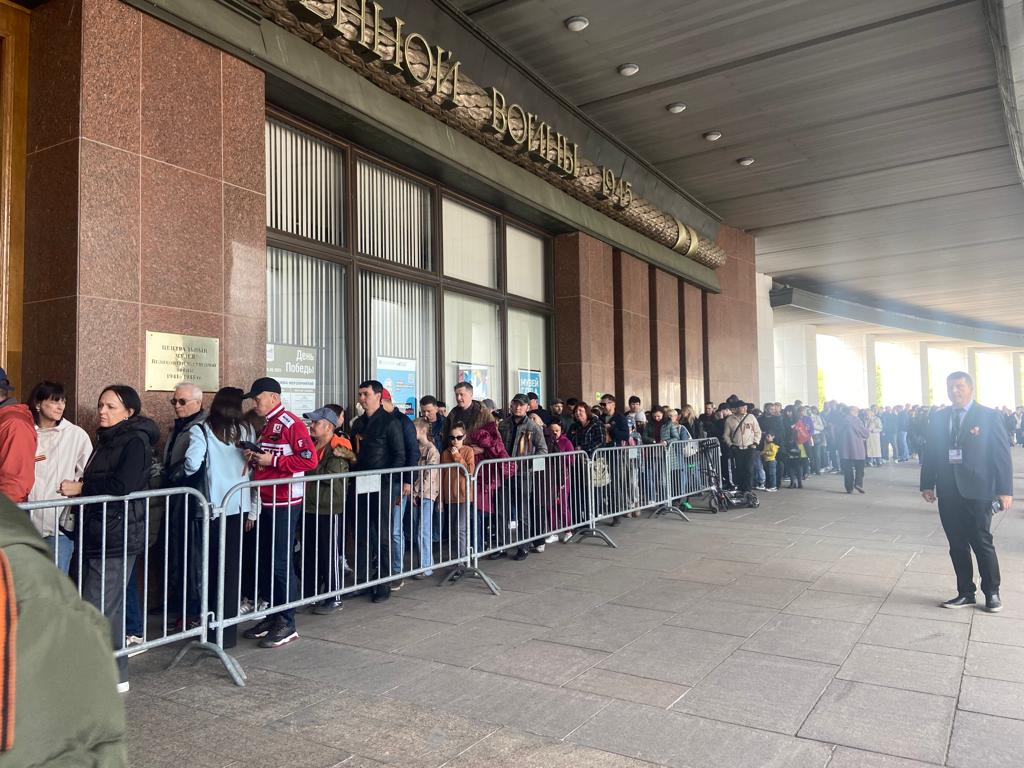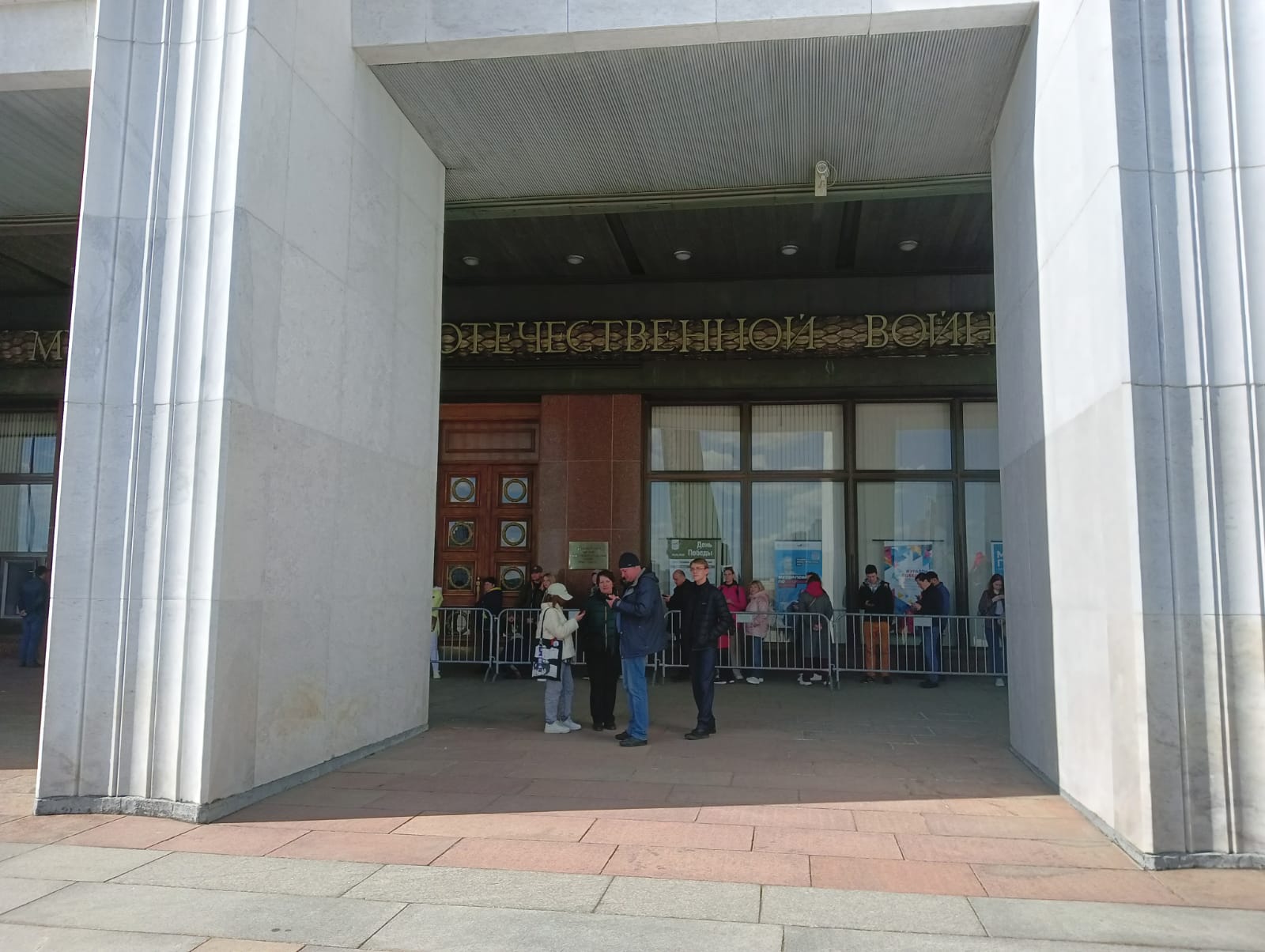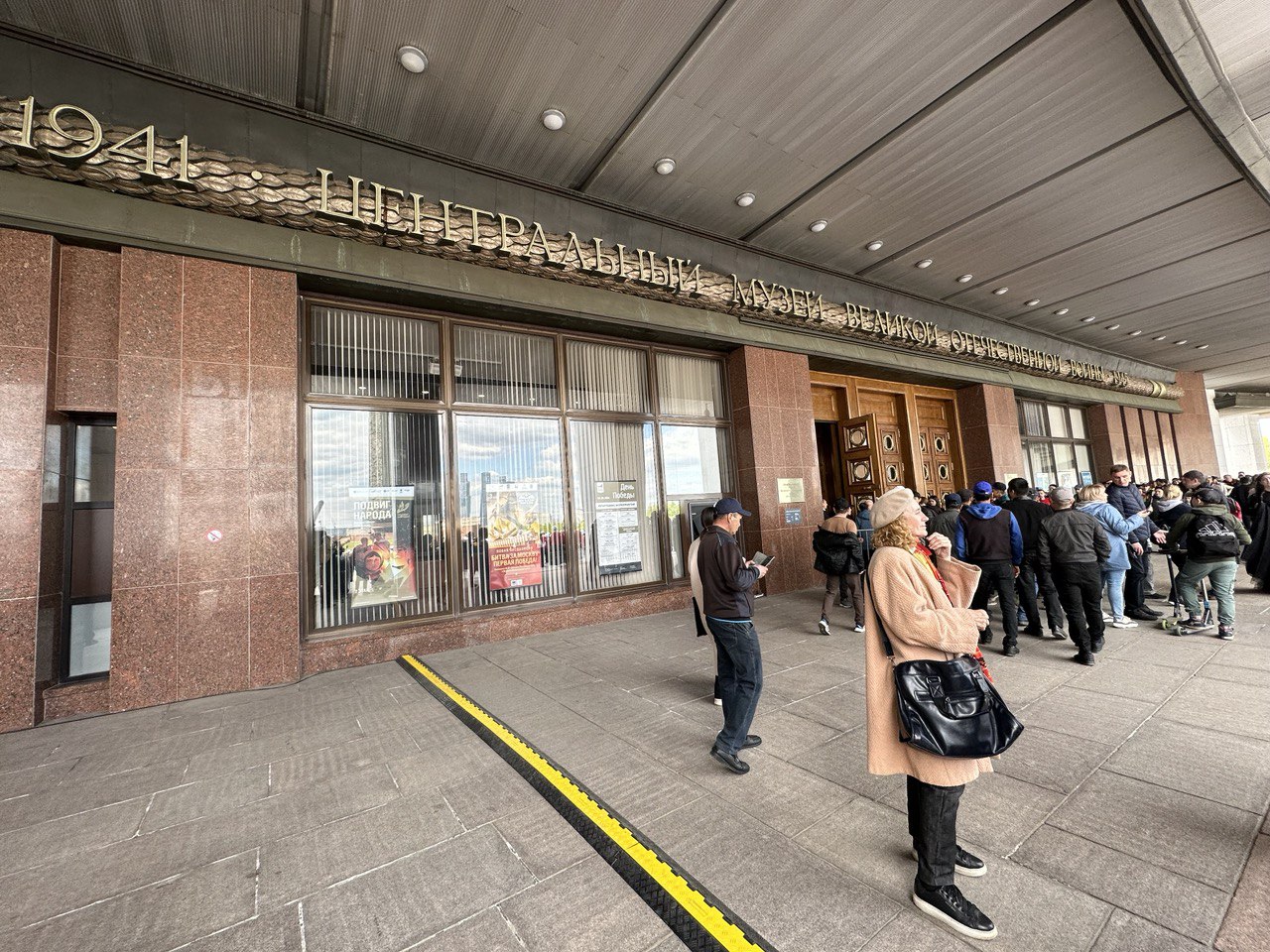 12:50 Музей Победы с раннего утра продолжает принимать гостей! У входа в главное здание выстроилась очередь.