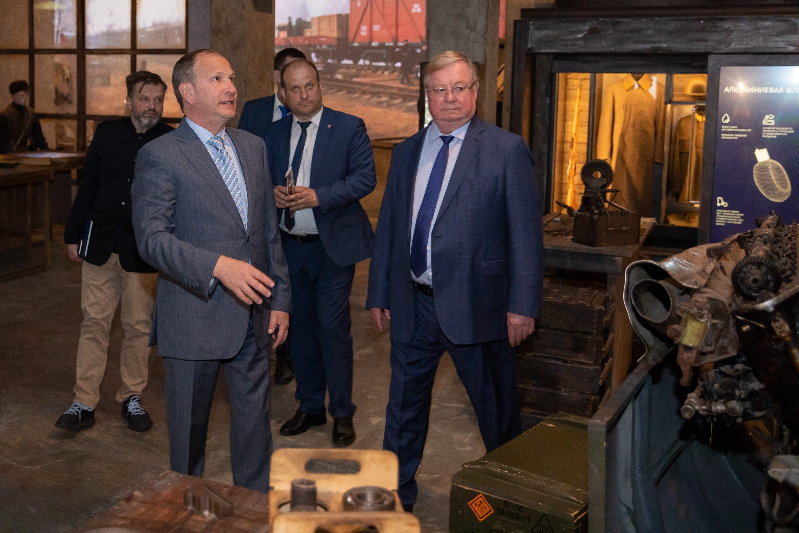 Директор Музея Победы Александр Школьник рассказал Сергею Степашину о других проектах и акциях, посвященных героям СВО. Кроме того, для почетного гостя провели экскурсию по уникальной иммерсивной экспозиции «Подвиг Народа».