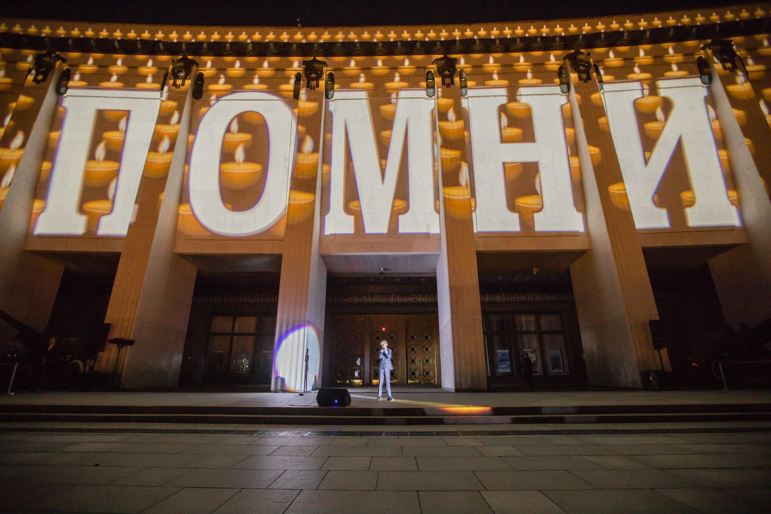 Одновременно на фасаде Музея Победы транслировалось грандиозное видео с горящими свечами. Всего 1418 свечей по числу дней войны и слово «Помни».