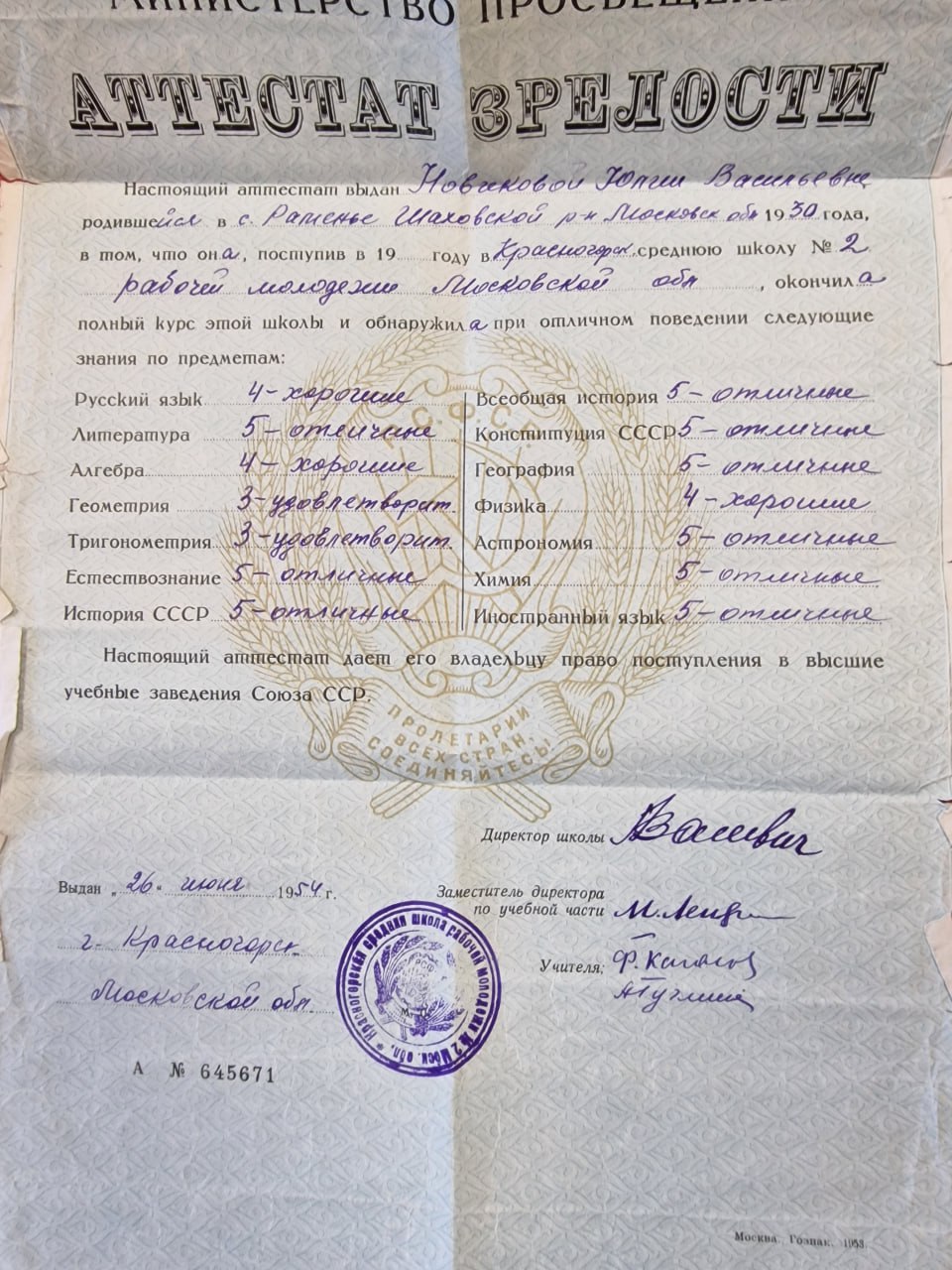 Среди раритетов — свидетельство о рождении, аттестат зрелости, удостоверения к госнаградам. Особый интерес представляет справка, удостоверяющая, что Новикова Ю. В. в 1949-1950 годах была сотрудницей спецобъекта № 42 (так назывался Красногорский лагерь с 1947 года), на территории которого сегодня располагается Красногорский филиал Музея Победы.