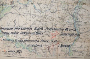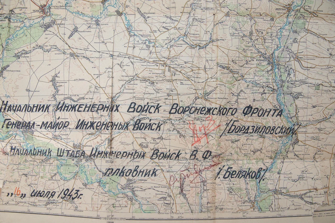В нижнем левом углу карты — подписи начальника инженерных войск Воронежского фронта генерал-майора Бордзиловского и начальника штаба инженерных войск Воронежского фронта полковника Белякова, уточнила она.