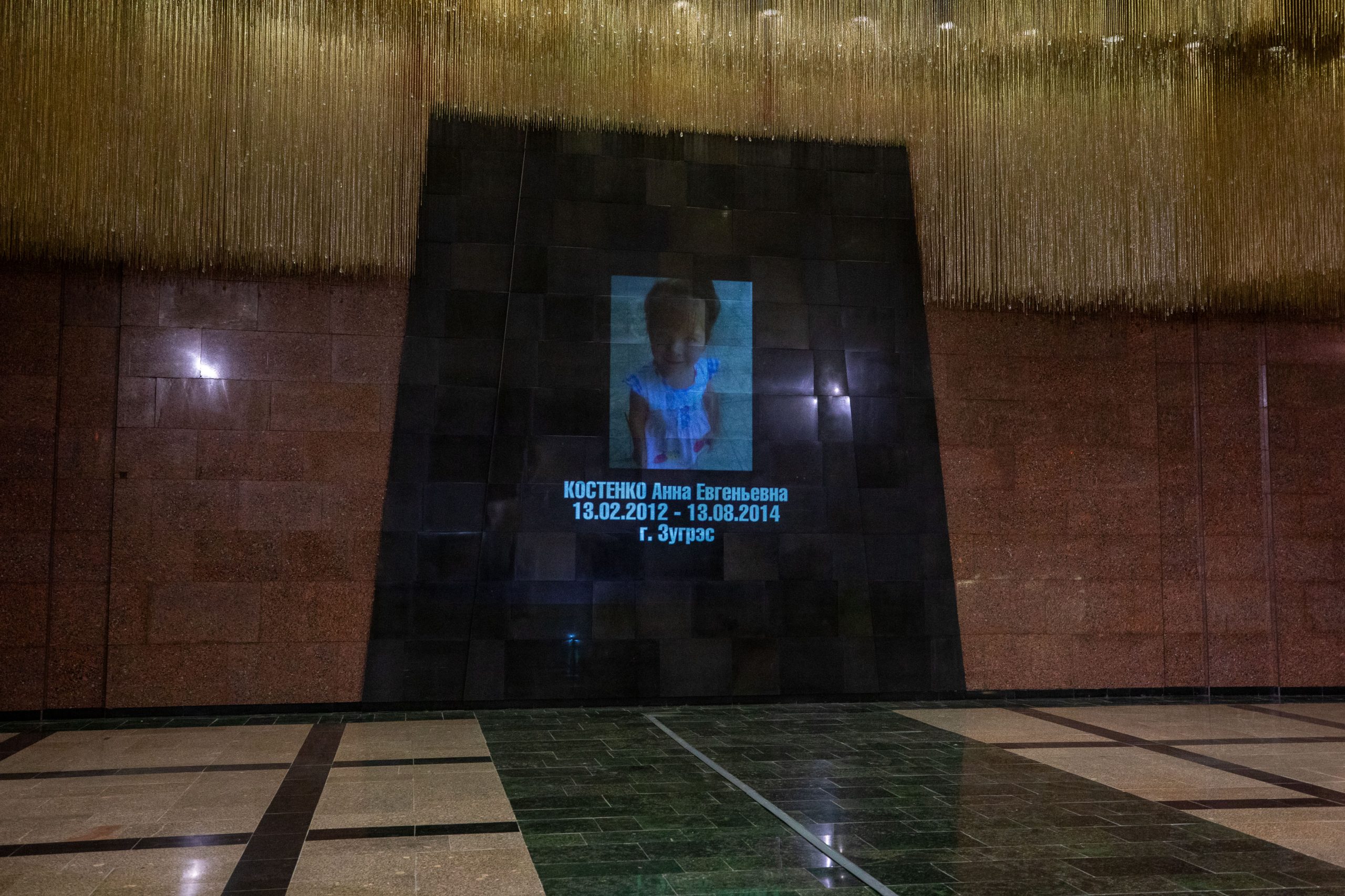 Во время мемориального мероприятия на стены Зала Памяти и Скорби проектировались имена и фотографии погибших детей Донбасса.