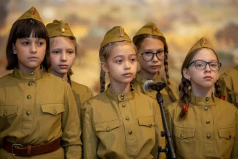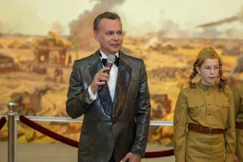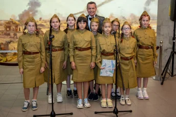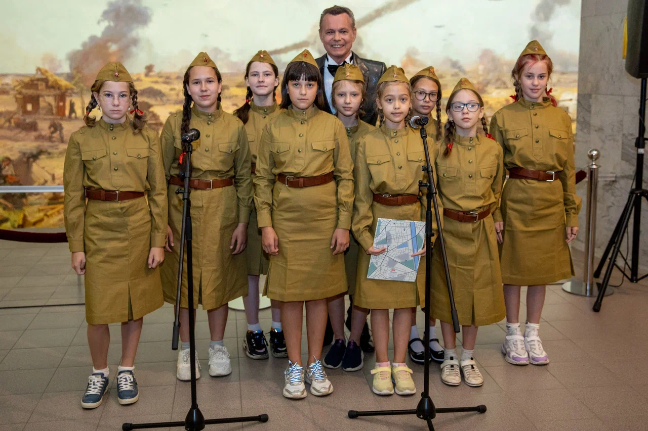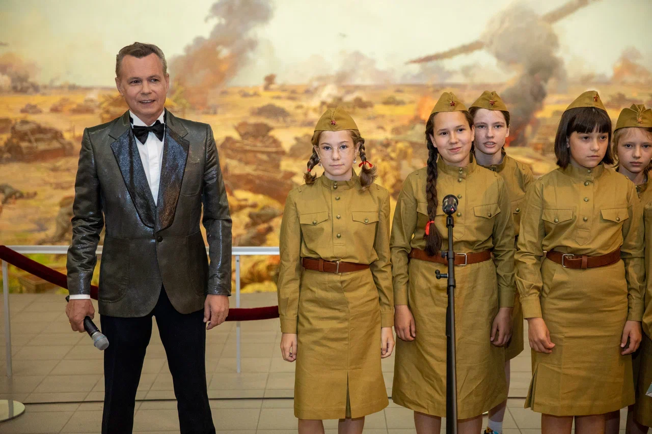 В Музее Победы в день 80-летия разгрома немецких войск в Курской битве певец Владимир Левкин вместе с детьми из клуба «Лето Побед» исполнил песни военных лет.