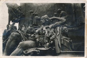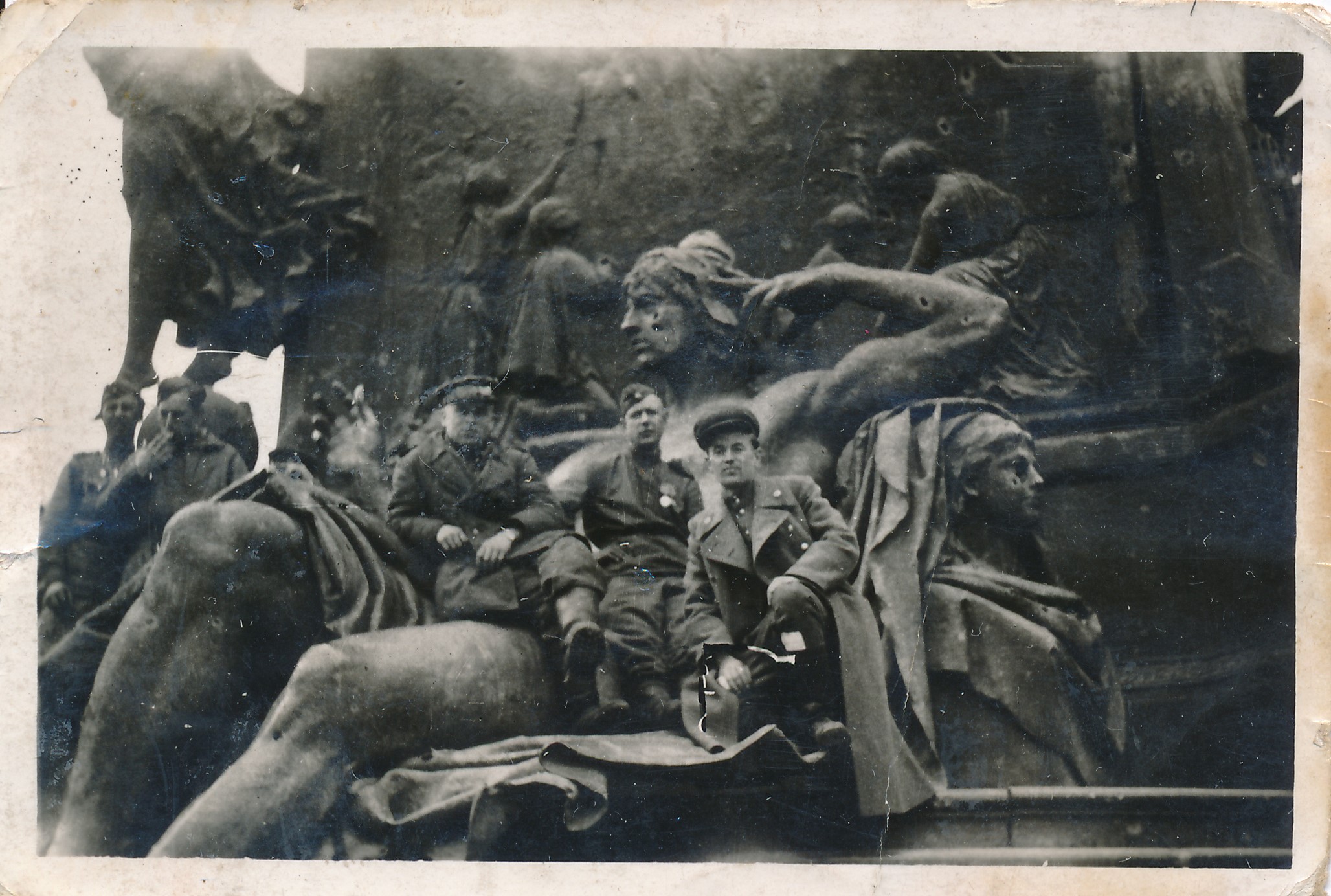 - Александ Ванин с товарищами на скульптуре у Национального памятника кайзеру Вильгельму. Германия, г. Берлин. 1945 г. Фото: РИА «Победа РФ»