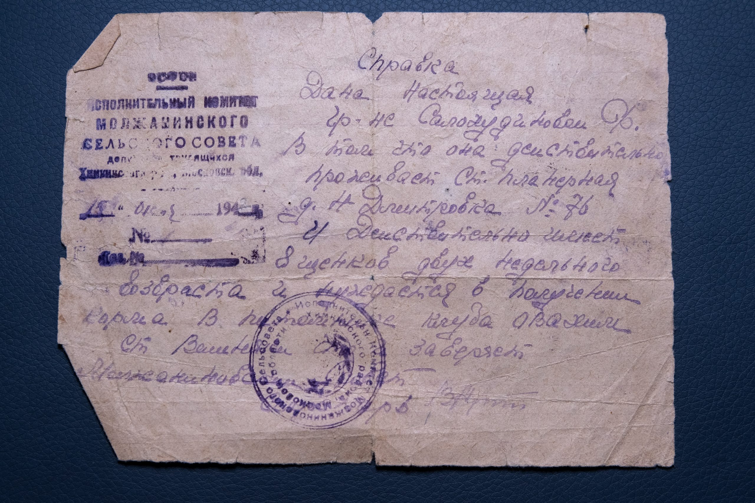 Рустам Садретдинов показал детям семейные реликвии военного времени. Среди них была справка 1942-43 годов на собаку Джемку о том, что животное нуждается в усиленном питании.