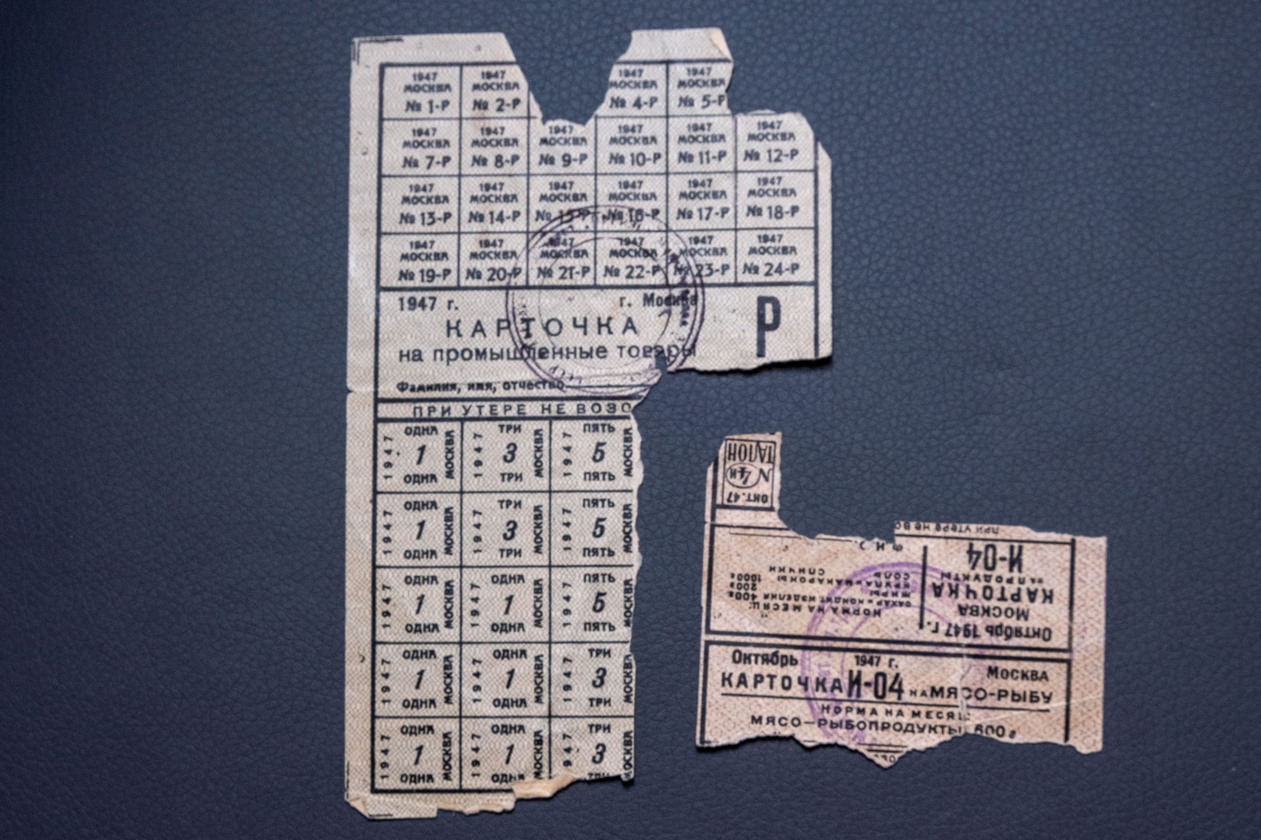 Один из военных артефактов, неиспользованные продовольственные карточки 1947 года, Рустам Садретдинов передал школьному музею Победы.