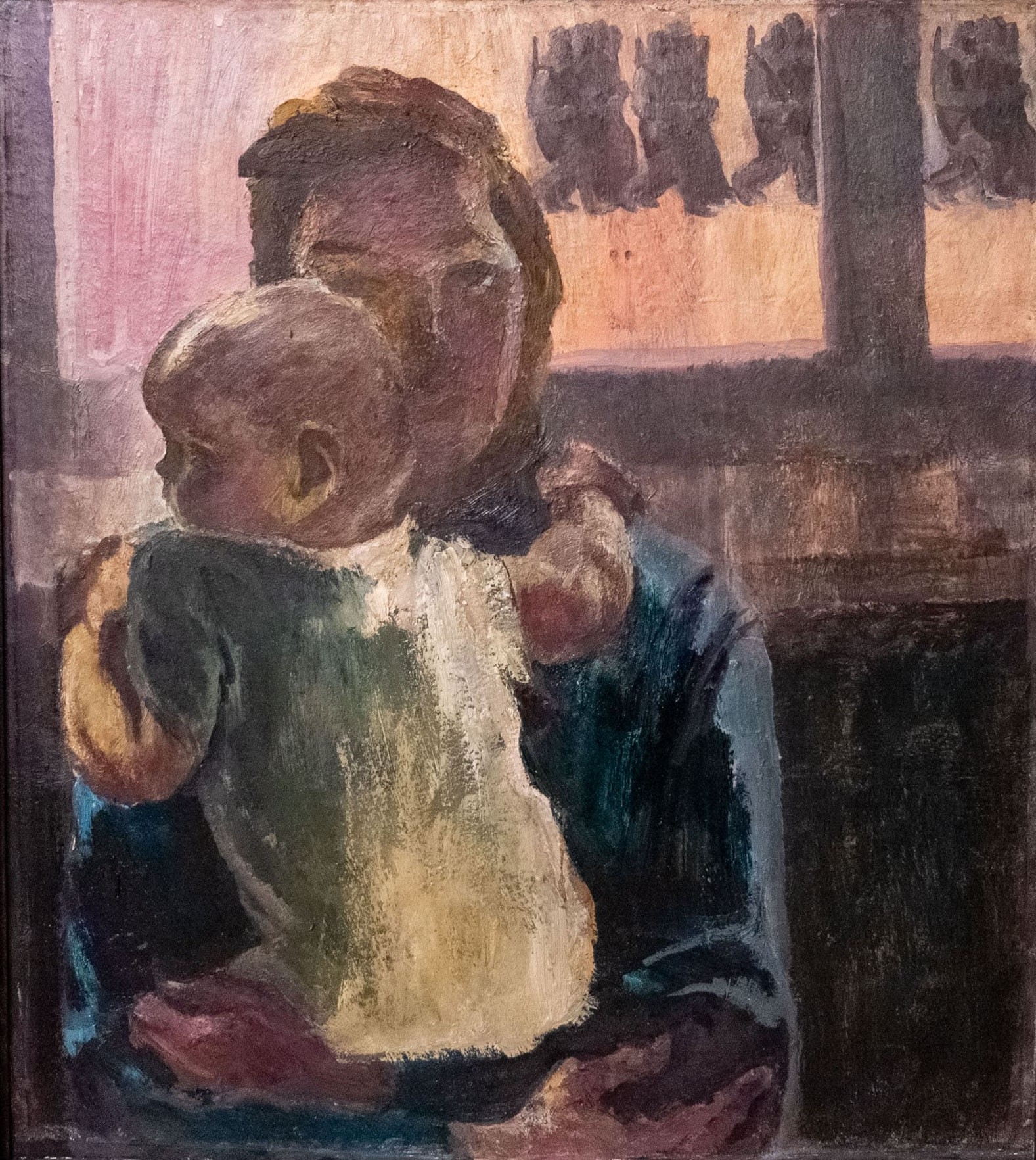 Живописное полотно размером 70х62 см было написано Николаем Тужилиным в 1971 году. На картине изображена молодая женщина с ребенком на руках на фоне военного пейзажа, открывающегося из окна. В представленной композиции дан обобщенный, собирательный образ матери времен войны. В Музей Победы экспонат поступил в 2001 году от дирекции выставок Союза художников России. Картина экспонировалась в этом году в Музее Победы в рамках выставки «Утраченное детство».
