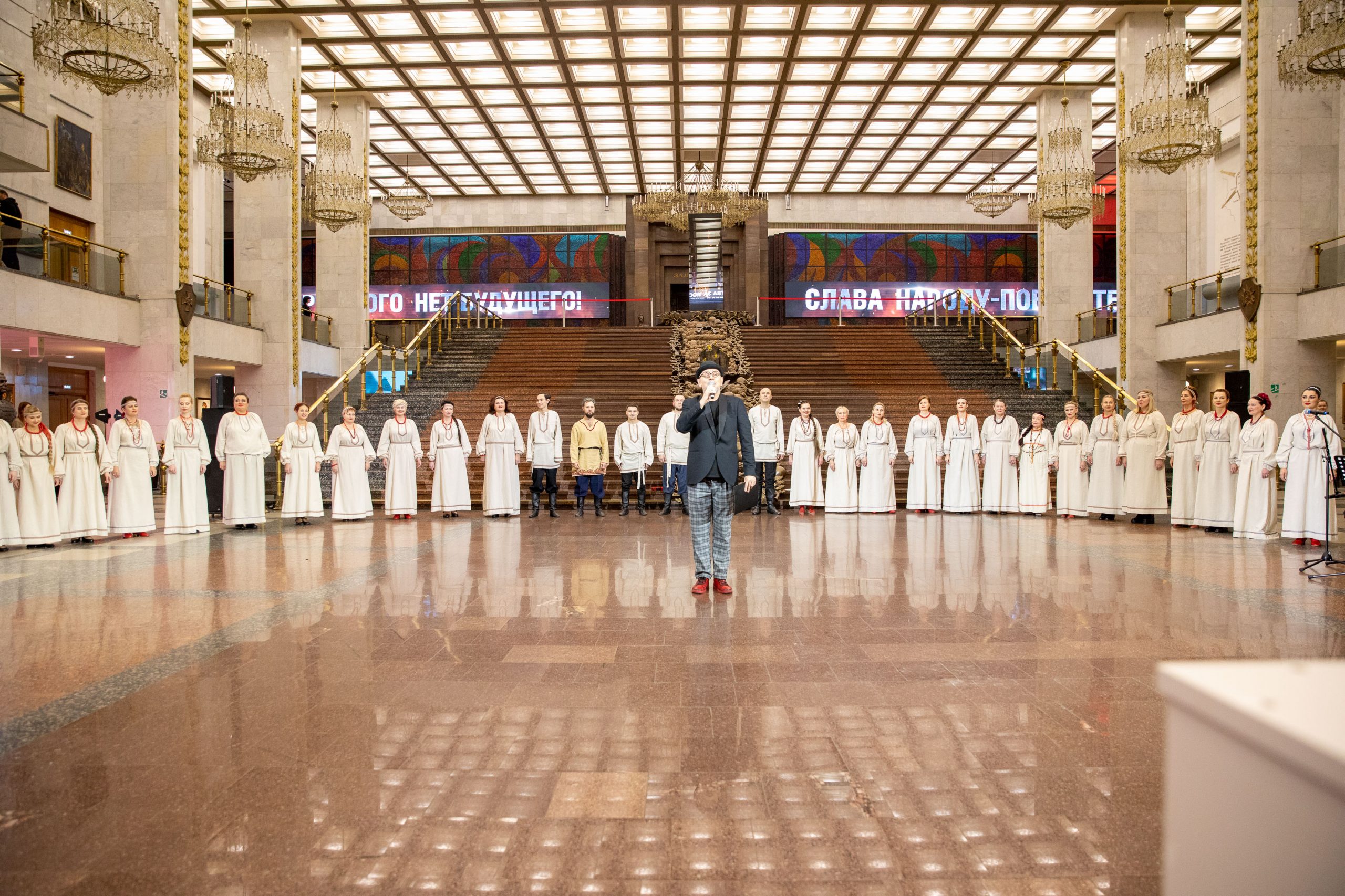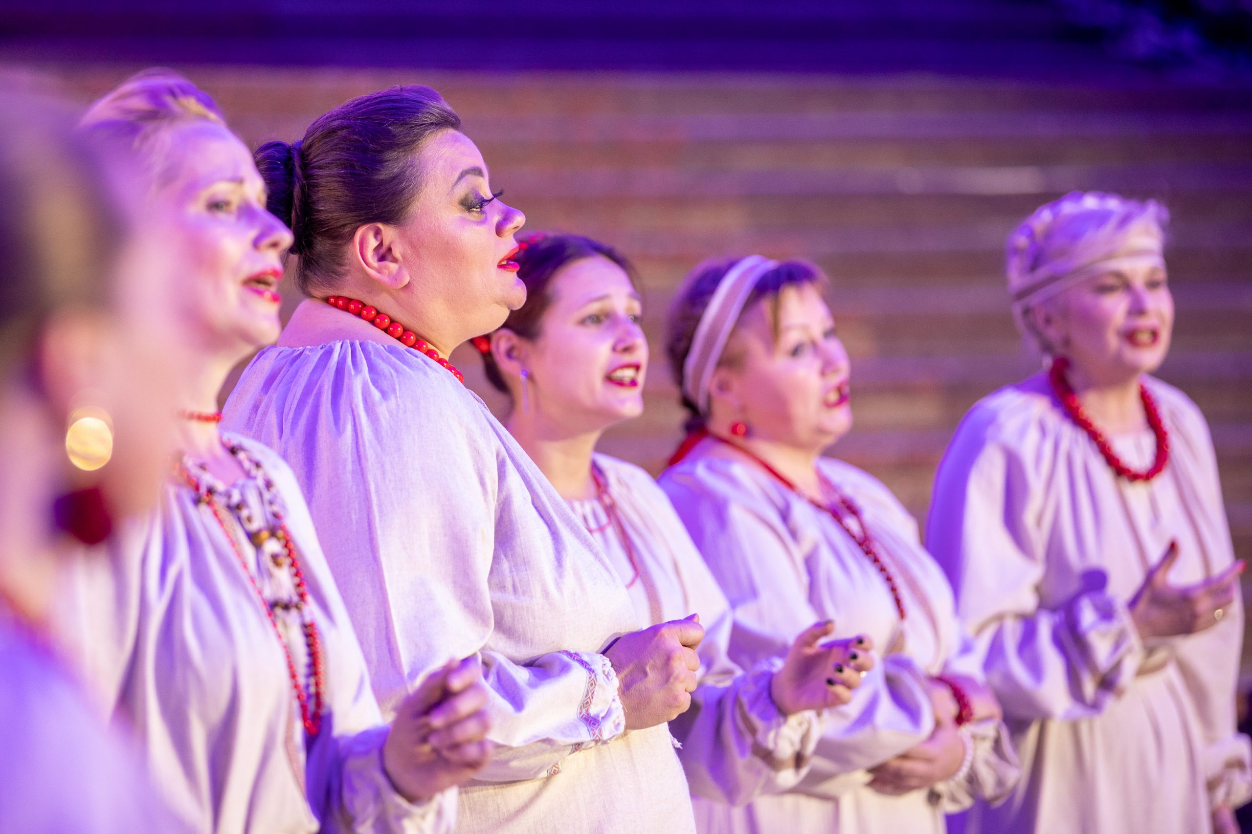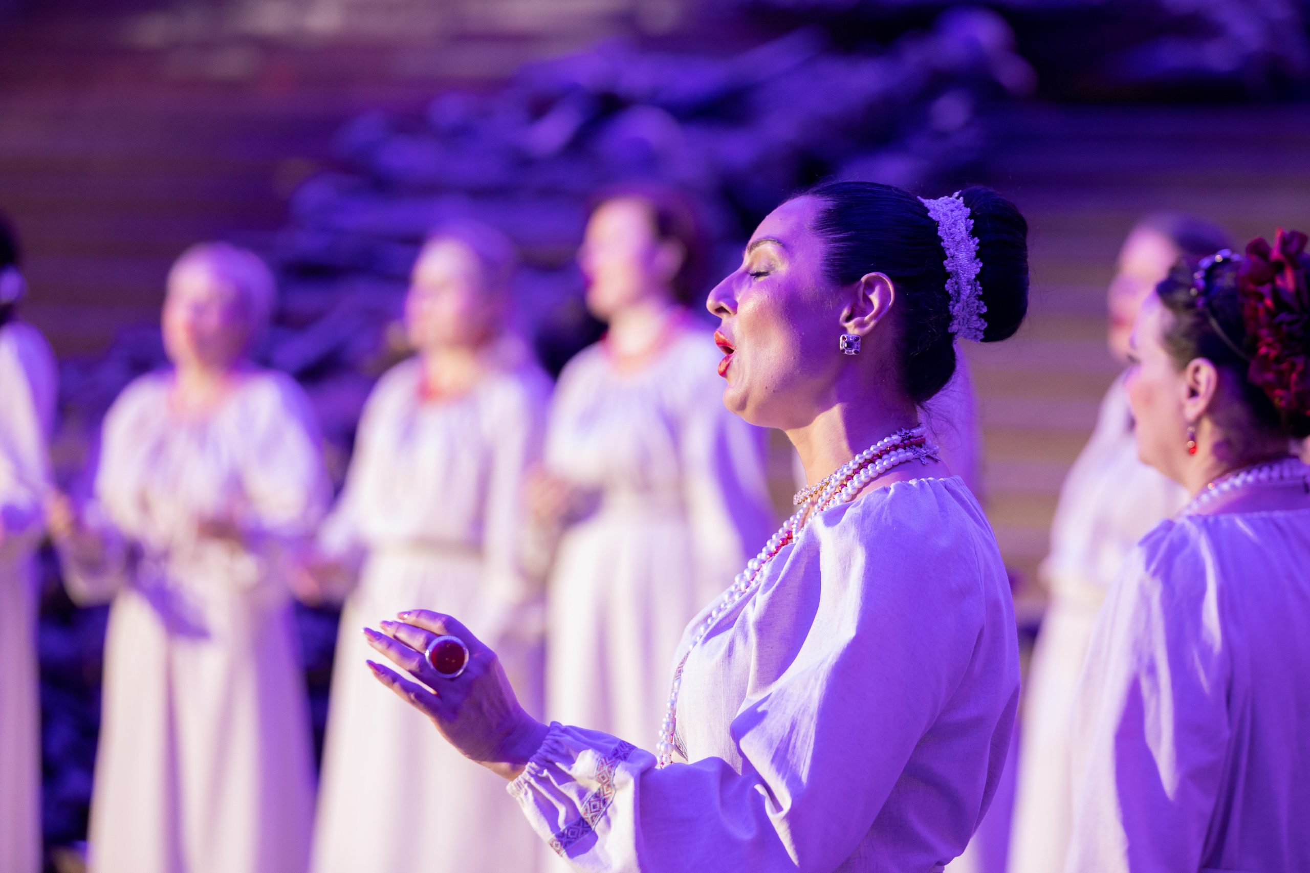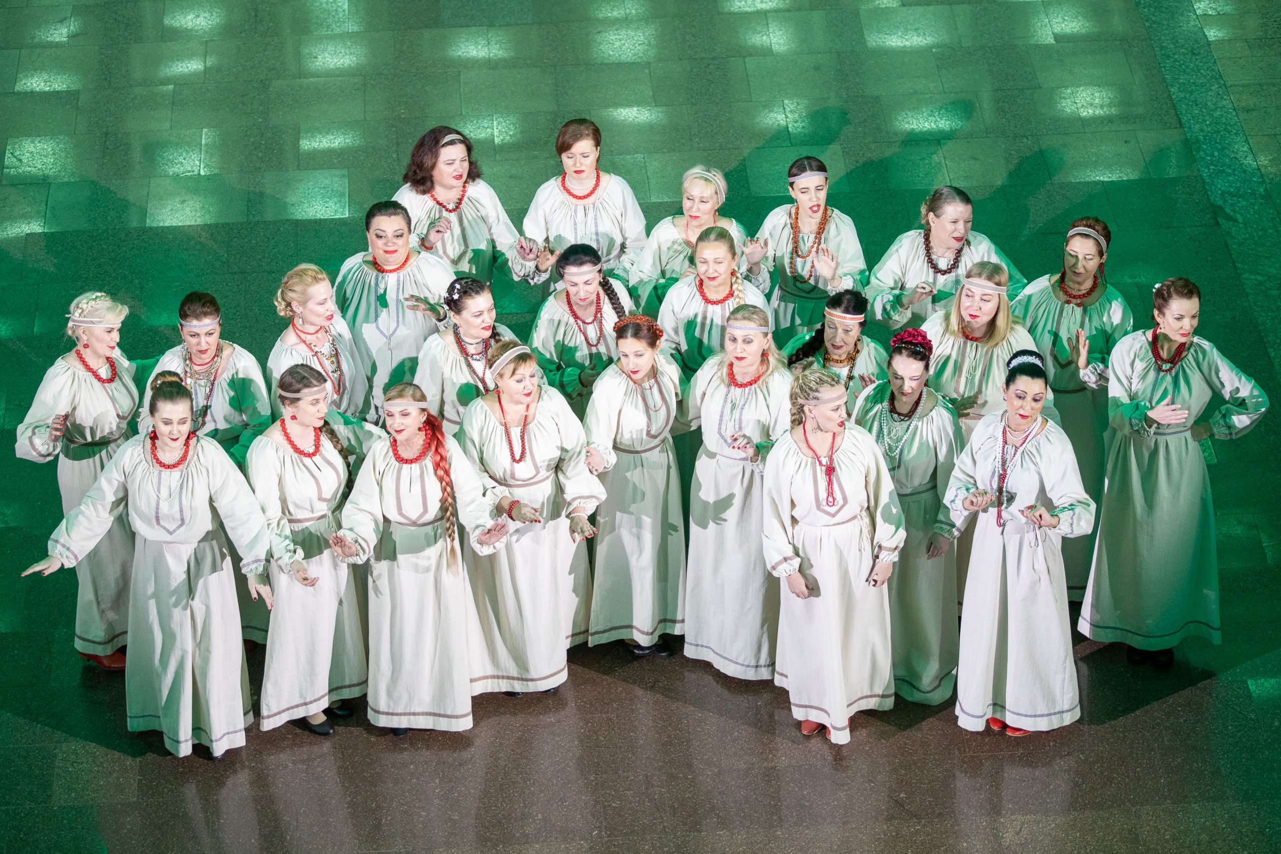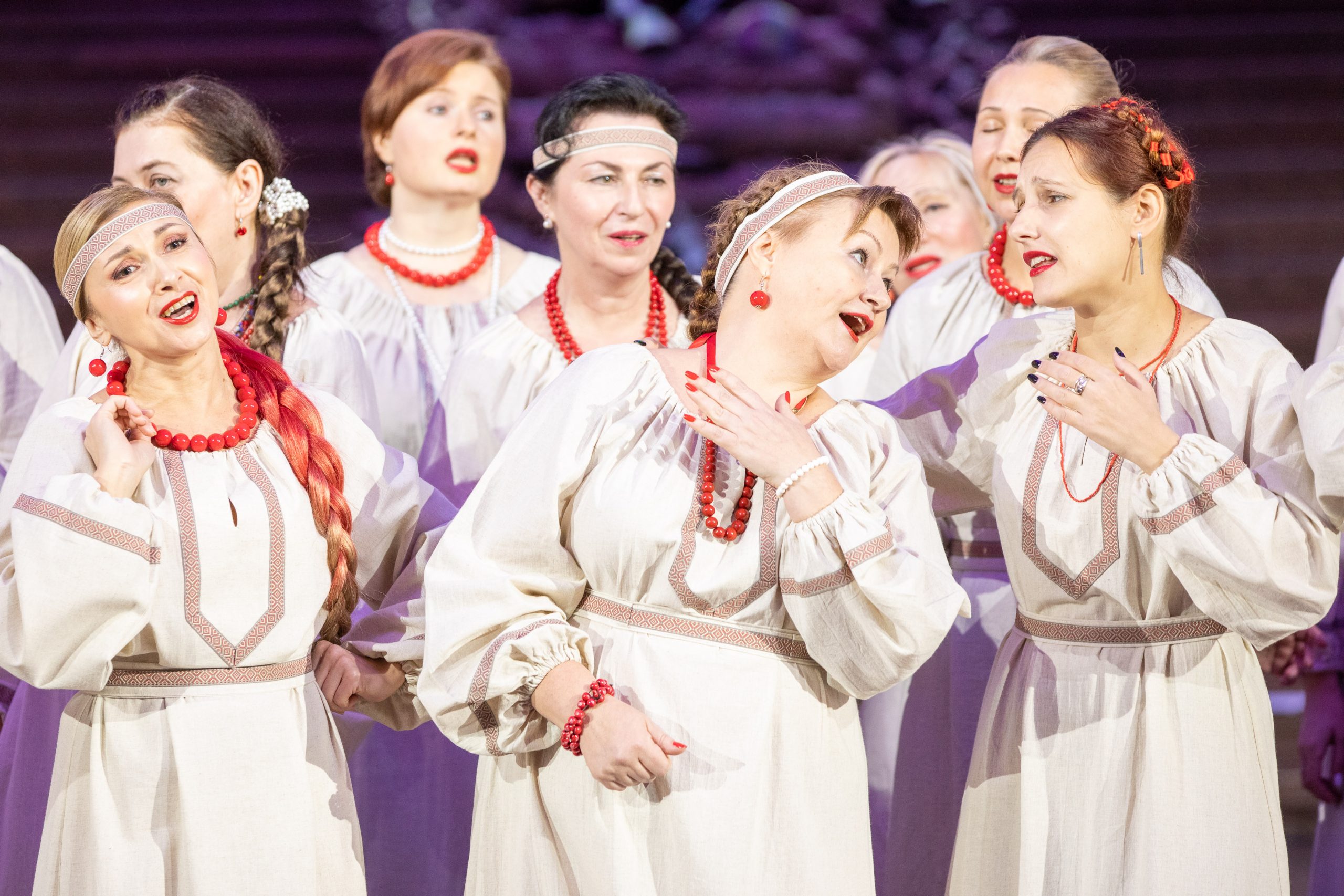 Артисты открыли выступление в этнических костюмах в едином стиле. Во второй части концерта хористы сменили образы.