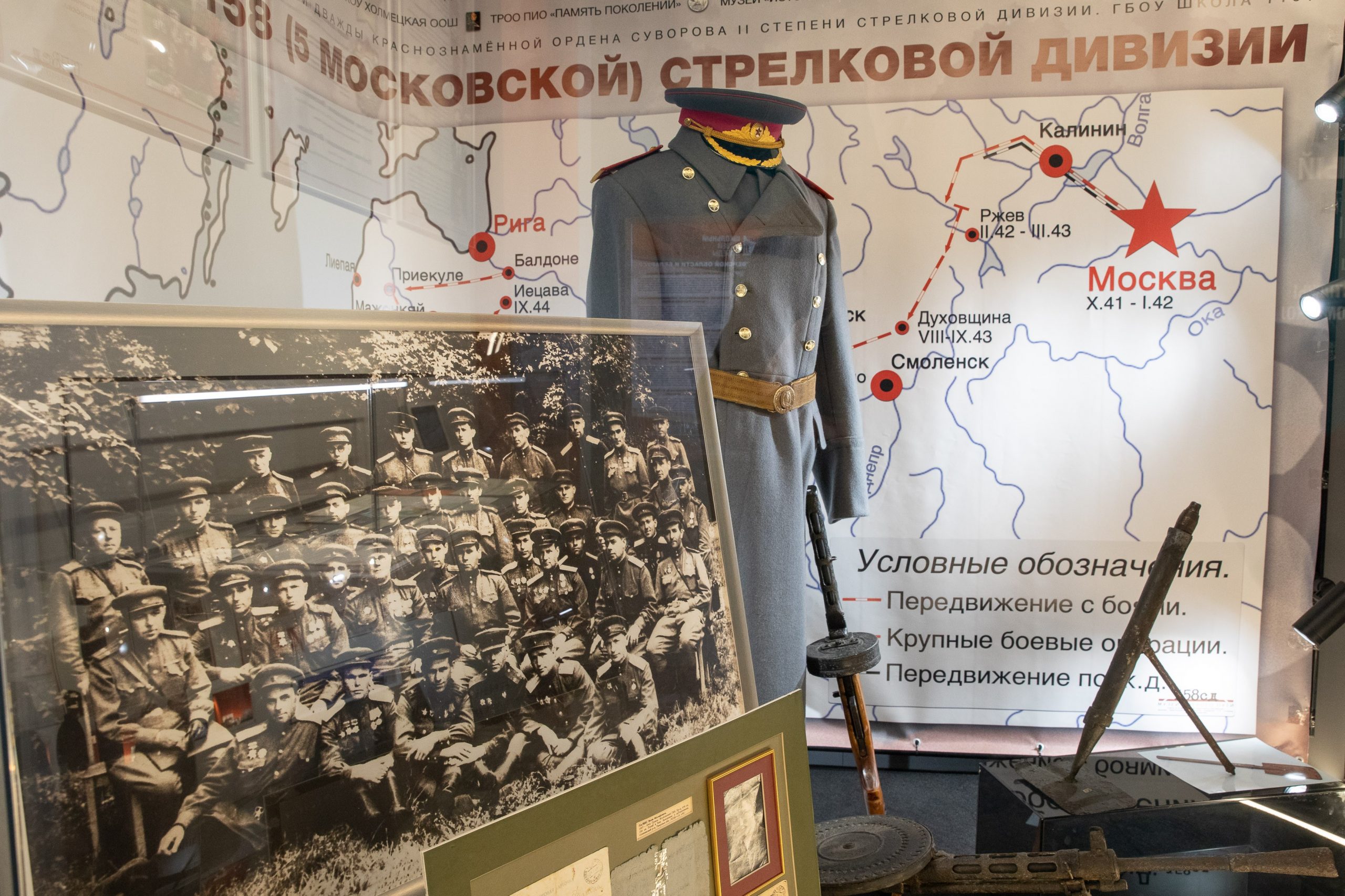 Музей школы № 1101 города Москвы представил в экспозиции «Подвиг великий и вечный» уникальные экспонаты: подлинное удостоверение бойца истребительного батальона Трофимченко Натальи Яковлевны; личные вещи воина 158-й стрелковой дивизии лейтенанта Панаева, найденные поисковым отрядом «Поиск»; записную книжку «Саперное дело», принадлежащую саперу дивизии В. И. Авдееву и переданную им лично в школьный музей; мундир командира 879-го стрелкового полка К. А. Томина; а также документы, связанные с историей дивизии.