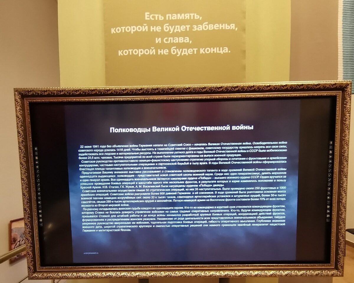 Мультимедийный экран познакомил гостей музея со становлением полководческого таланта одиннадцати выдающихся военачальников в ходе сражений Великой Отечественной войны. Посетители увидели снимки из фондов Музея Победы, которые рассказывают о легендарных полководцах военных лет, ключевых моментов сражений и освобождении регионов.