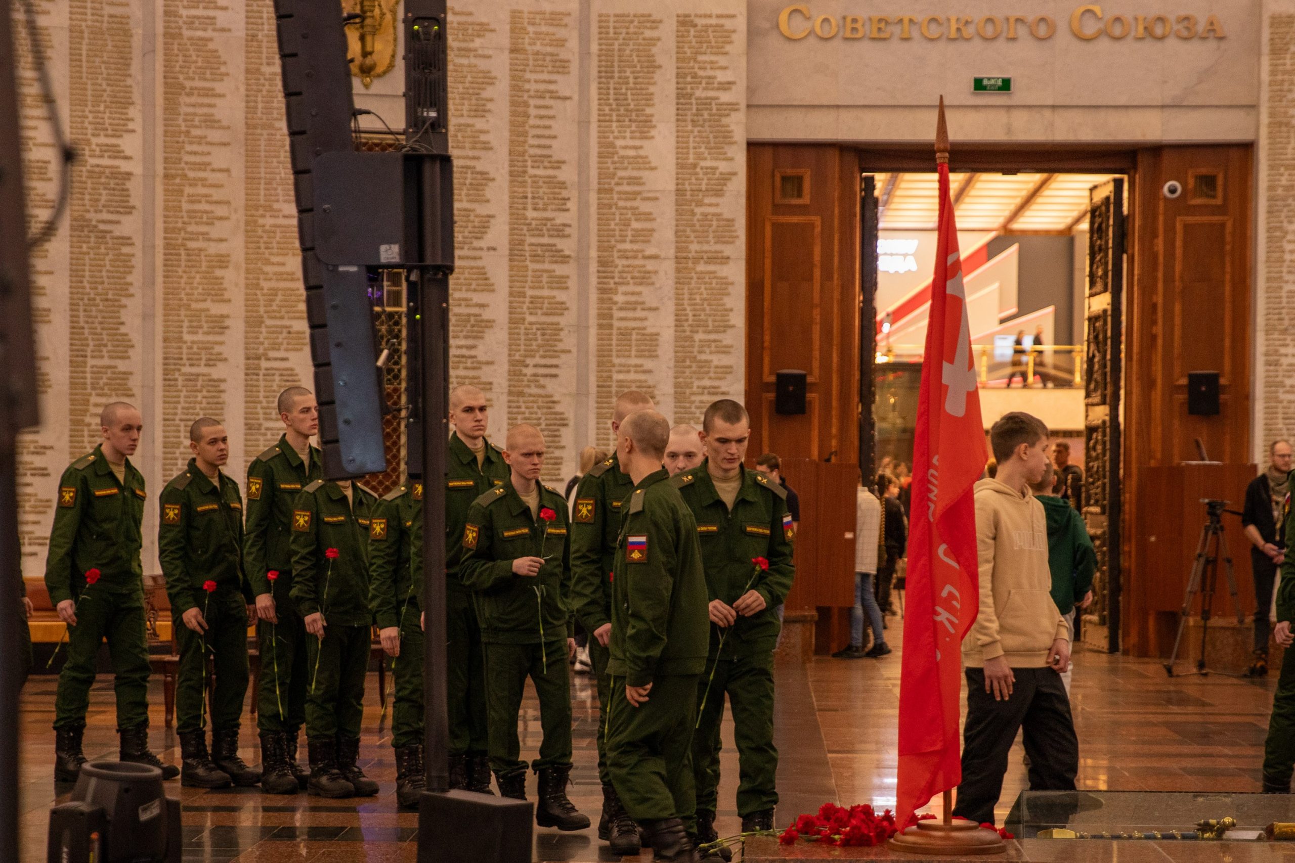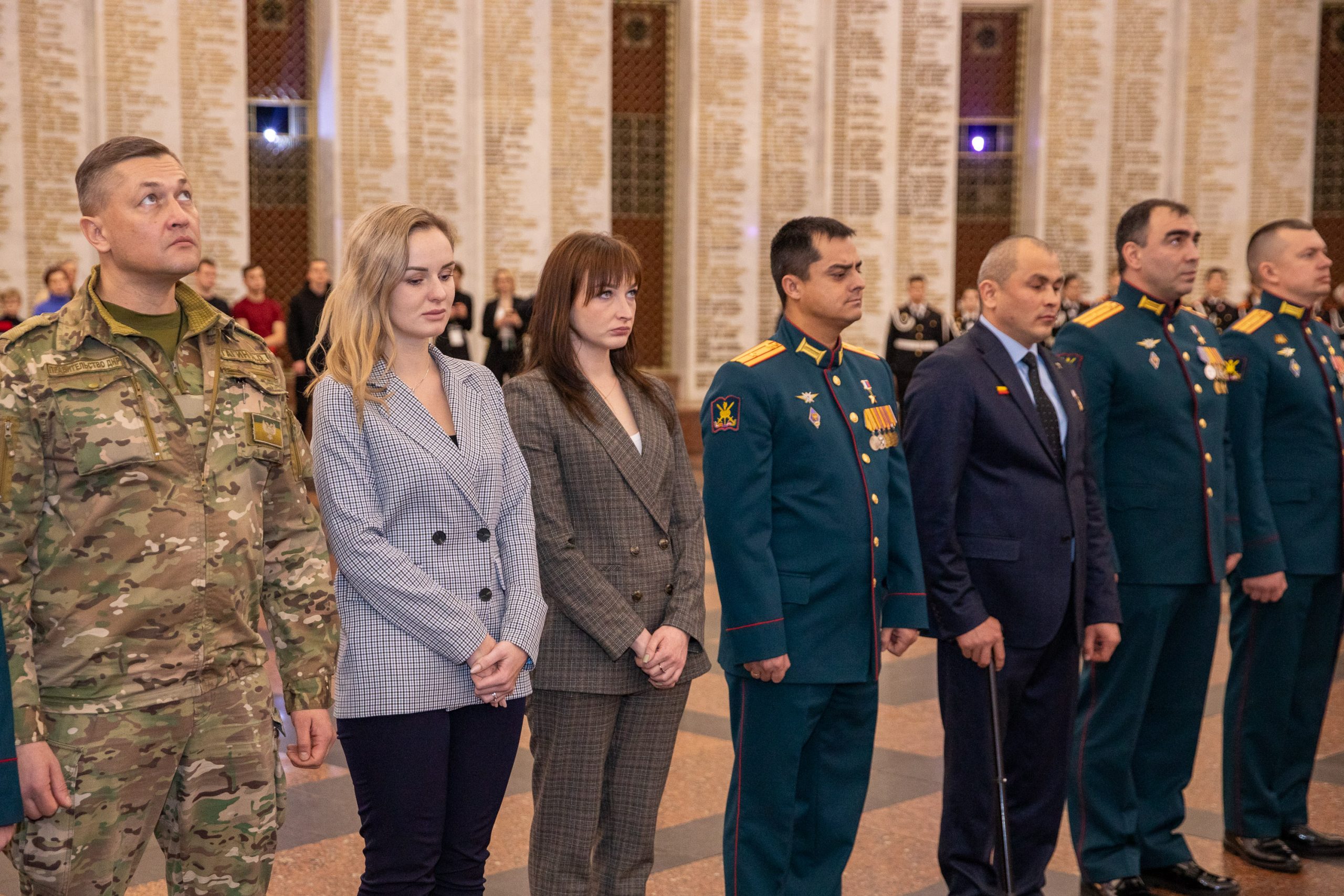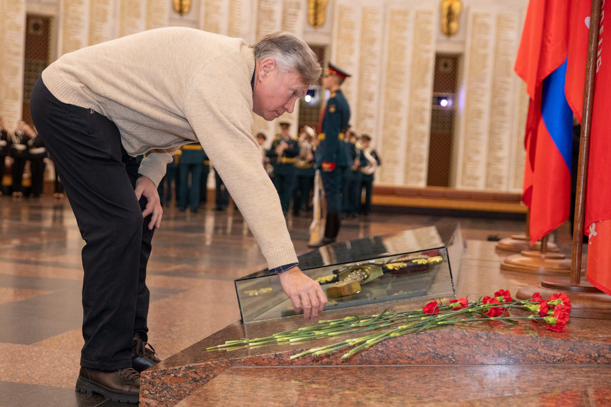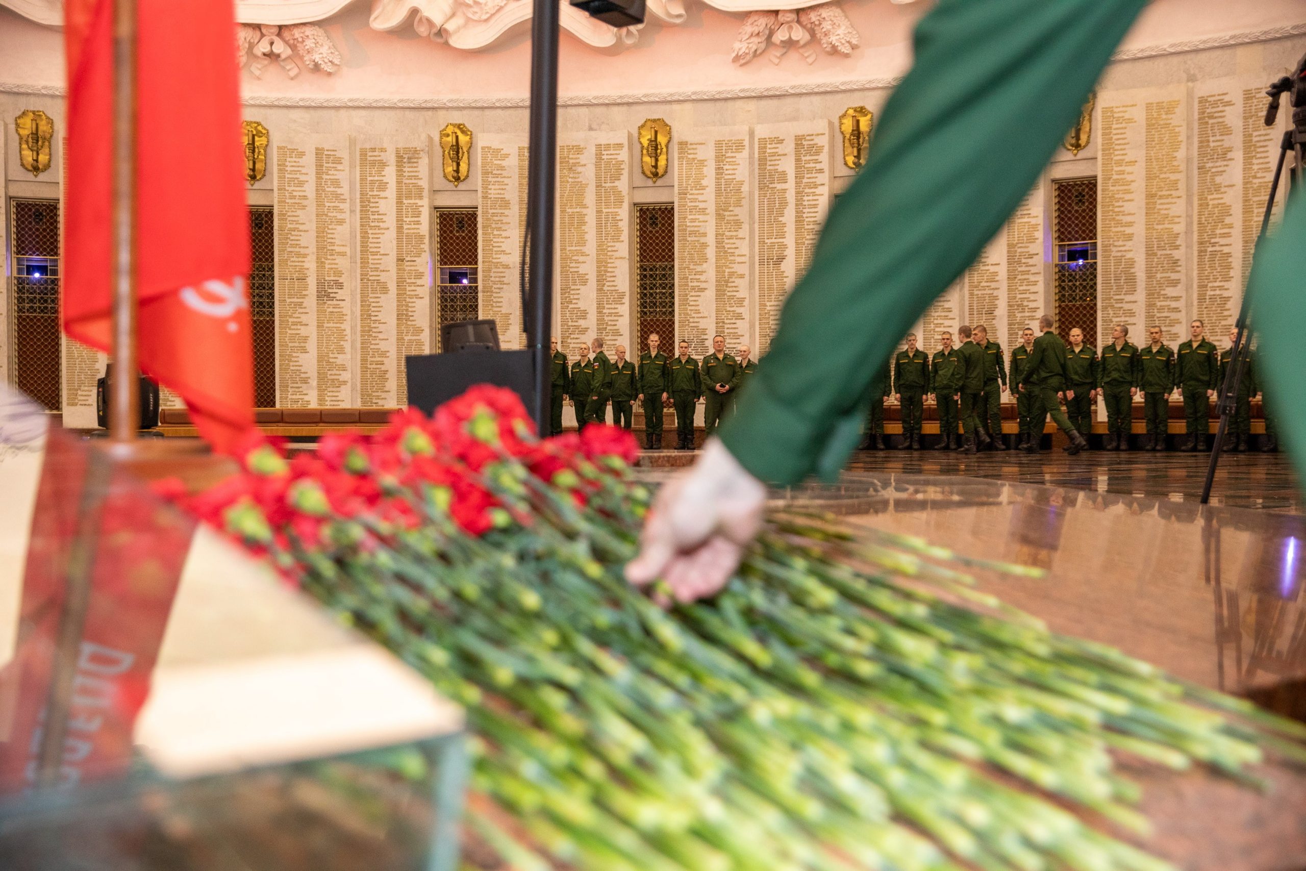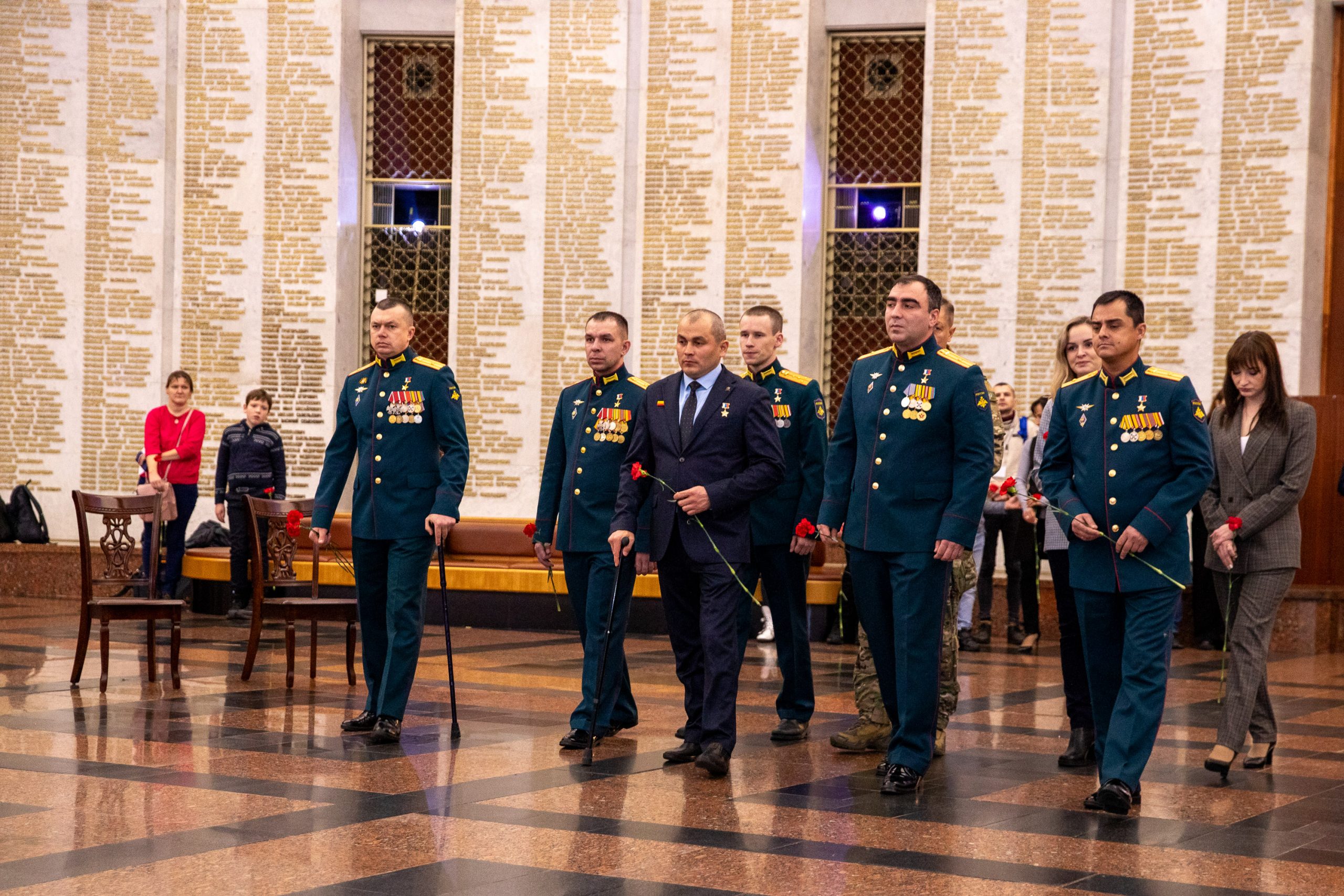 В Зале Славы Музея Победы состоялось торжественное возложение цветов в сопровождении оркестра войск национальной гвардии России. Военнослужащие, вдовы Героев России и посетители культурной площадки почтили память погибших защитников Родины.