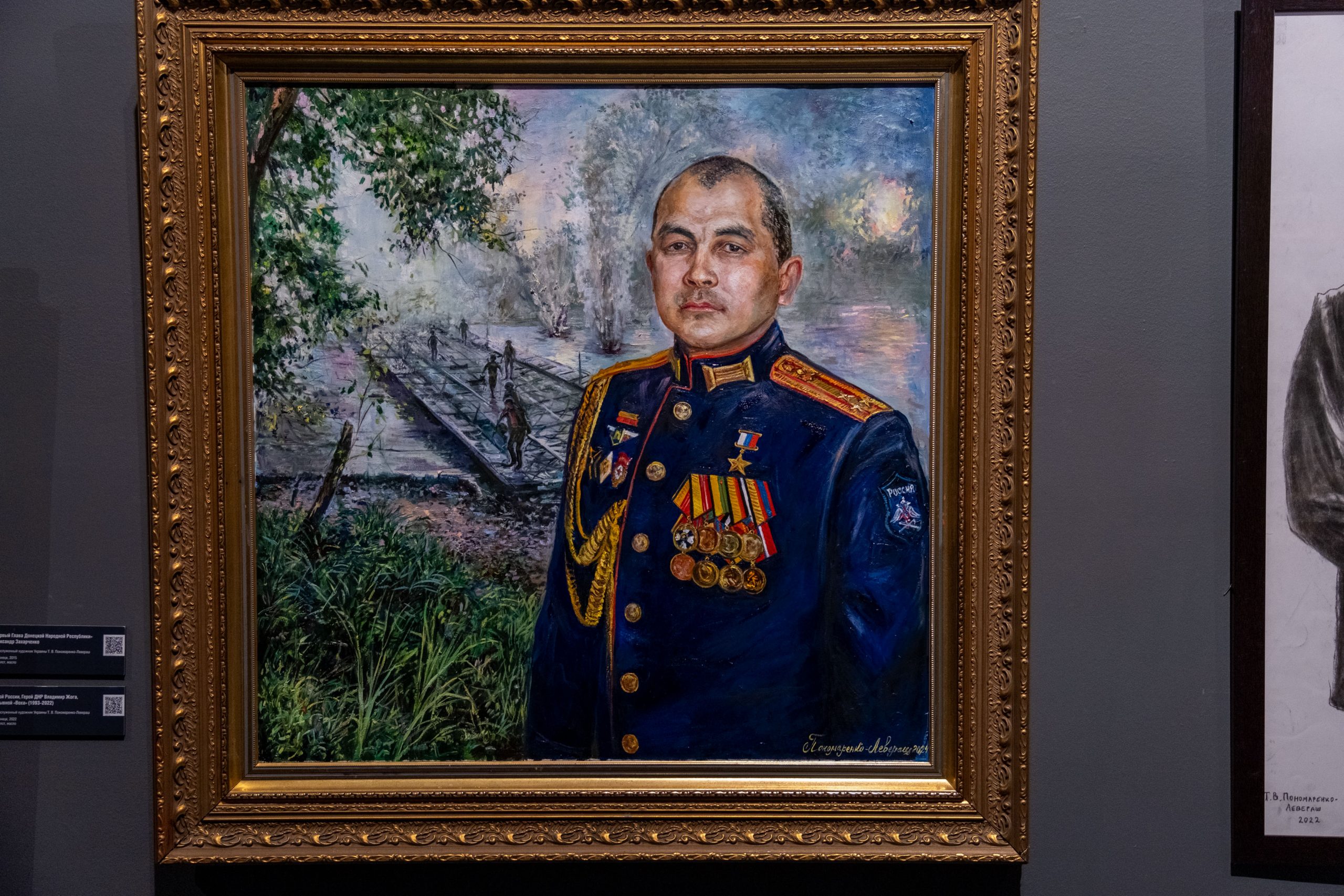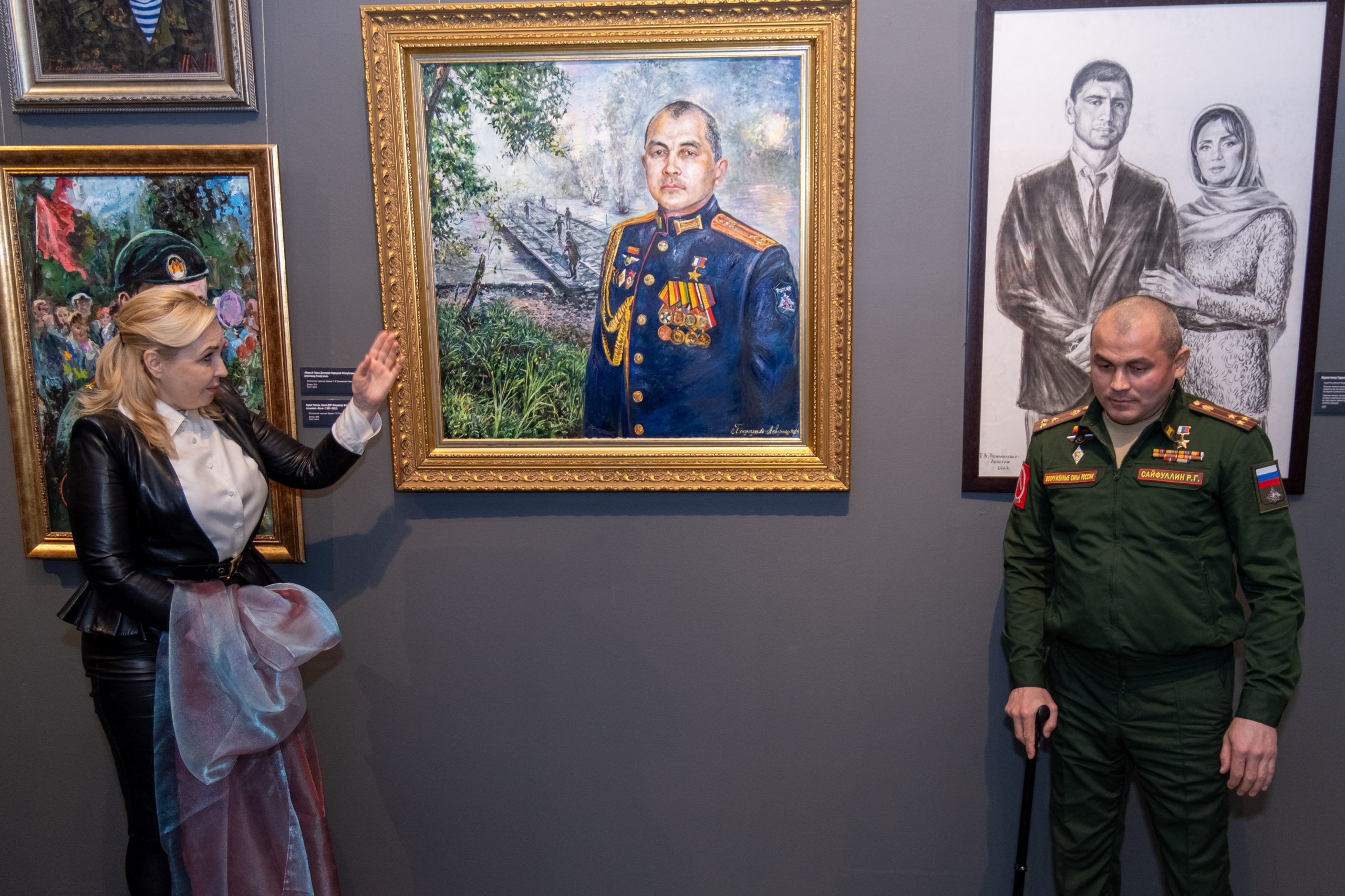 «Я познакомилась с ним в Кремле, когда чествовали Героев Отечества. Я подошла к нему, зная о его подвиге, и сказала, что хочу написать его портрет. Инженерные войска посодействовали, чтобы он приехал ко мне в мастерскую. Он рассказывал о своем подвиге, а я, как профессиональных художник, ловила его взгляд, то, о чем он думал, рассказывая о том бое», — поделилась автор картины заслуженный художник Украины Татьяна Пономаренко-Левераш.