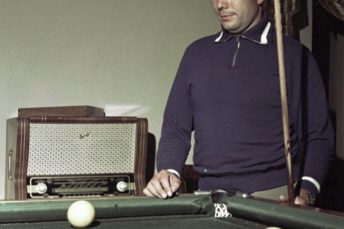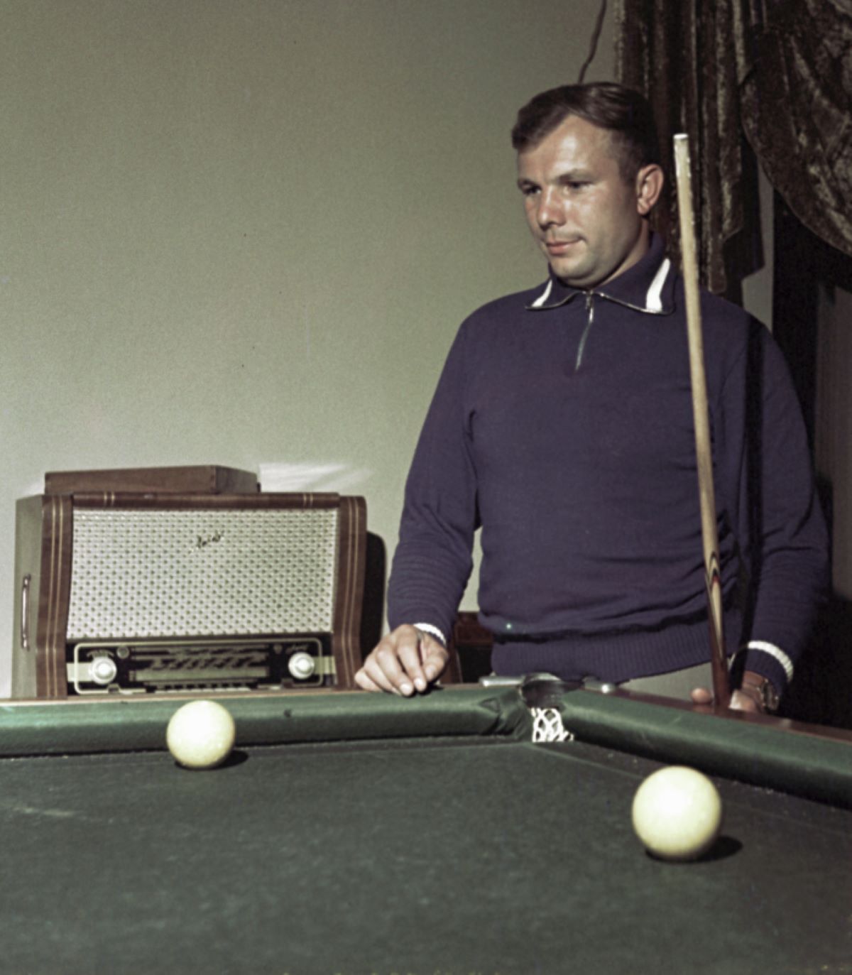 - Юрий Гагарин за игрой в бильярд во время отдыха в военном санатории «Волга» в составе группы из шести первых пилотов-космонавтов. Фото: Александр Сергеев / РИА Новости