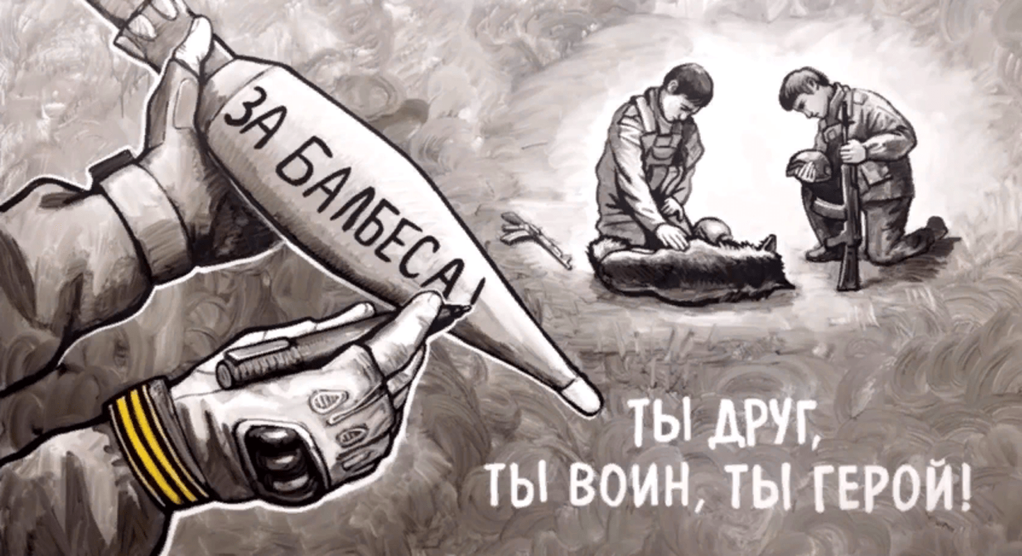 На видео художники рисуют военные будни четвероногого бойца, его товарищей-солдат и героический поступок Балбеса.
