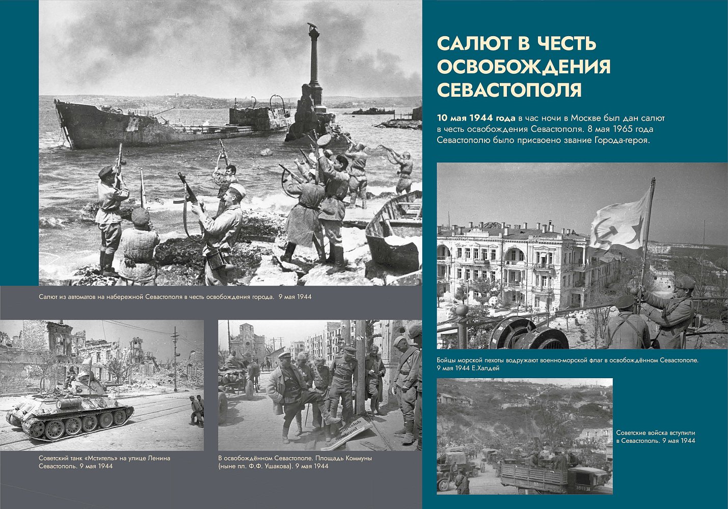 В экспозиции представлены фронтовые рисунки художника-баталиста Марка Домащенко, снимки фронтовых корреспондентов. На этих фотографиях – герои освобождения Крыма, боевые действия, водружение военно-морского флага в освобожденном Севастополе.