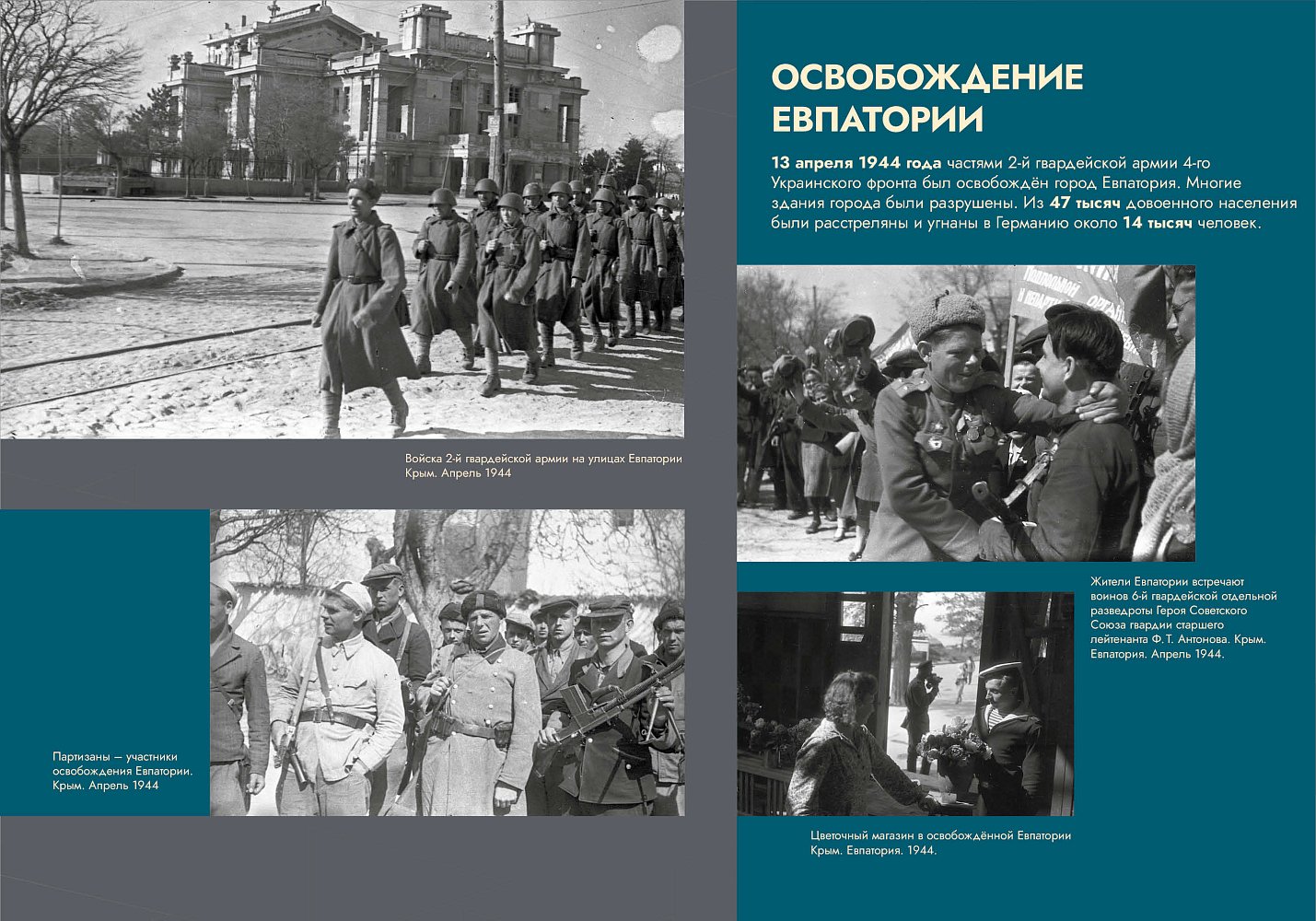 Новая выставка подробно рассказывает об истории и ходе Крымской наступательной операции. В экспозицию вошло более 100 уникальных фотографий, плакатов, листовок, фронтовых рисунков из фондов Музея Победы. Материалы посвящены подготовке советского наступления, боям у Сиваша и на Перекопском перешейке, освобождению Джанкоя, Керчи, Евпатории, Симферополя, Ялты, Алупки, Севастополя.