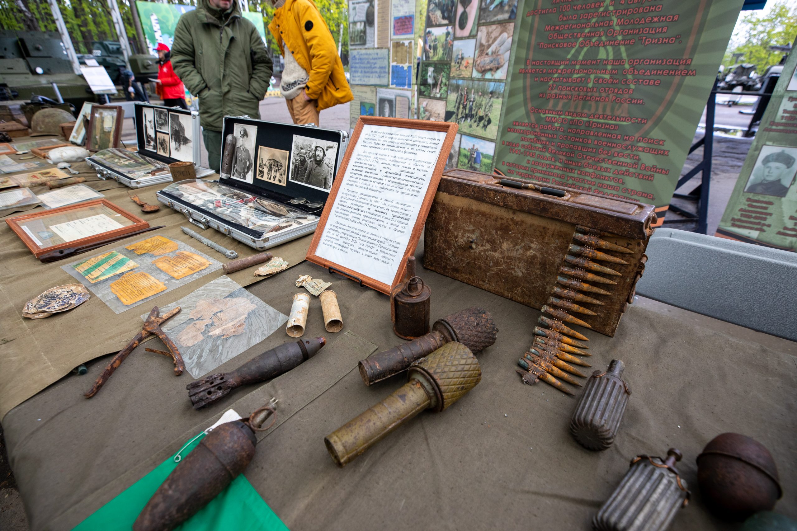 Посетители увидят реликвии, найденные поисковиками на полях сражений Великой Отечественной войны, фотографии из архива «Тризны», макеты стрелкового оружия военных лет, а также узнают об артефактах и документах, найденных на местах боев.