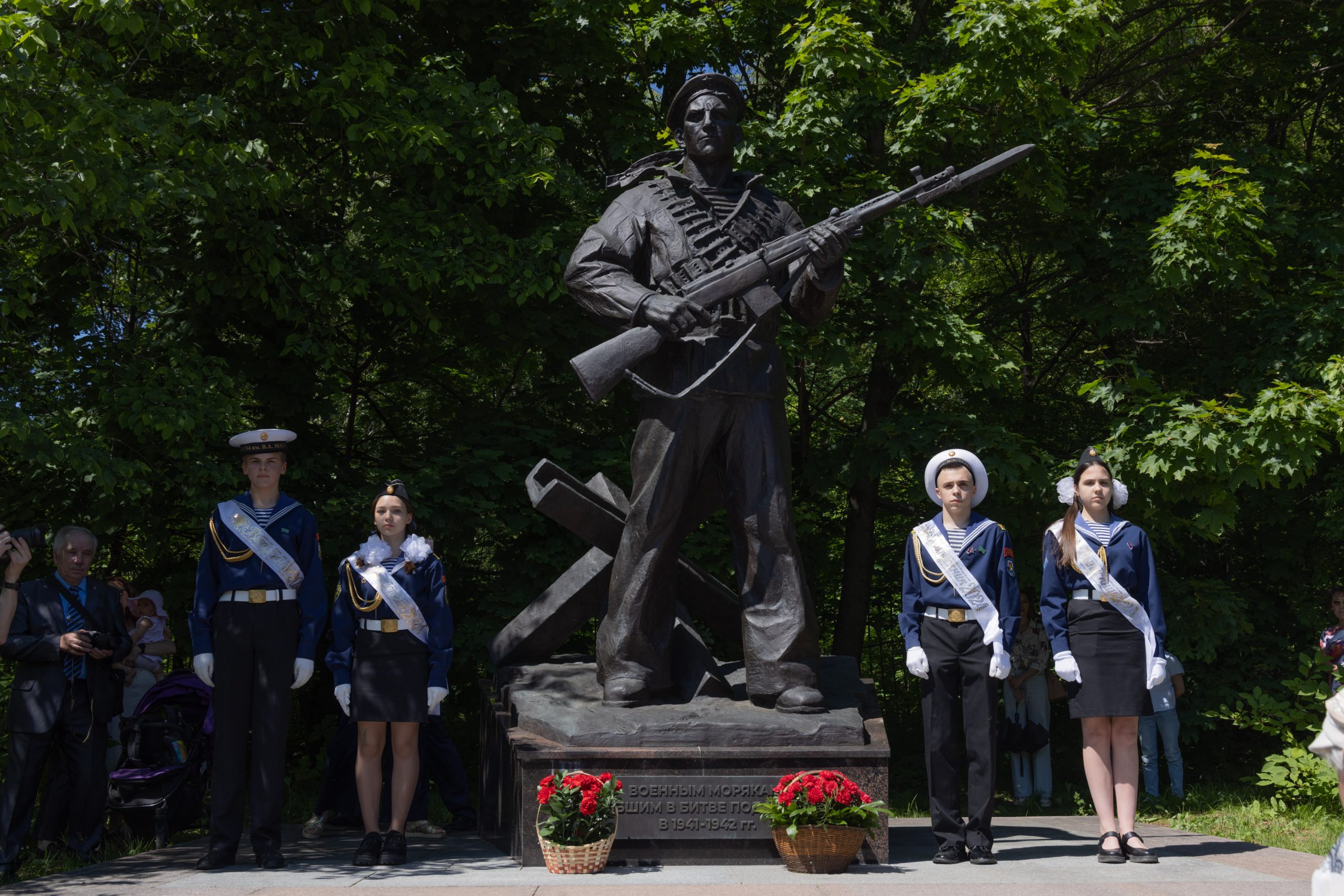 Началась программа с торжественного поднятия флагов и традиционного возложения цветов к памятнику военным морякам, погибшим в битве под Москвой в 1941–1942 годах.