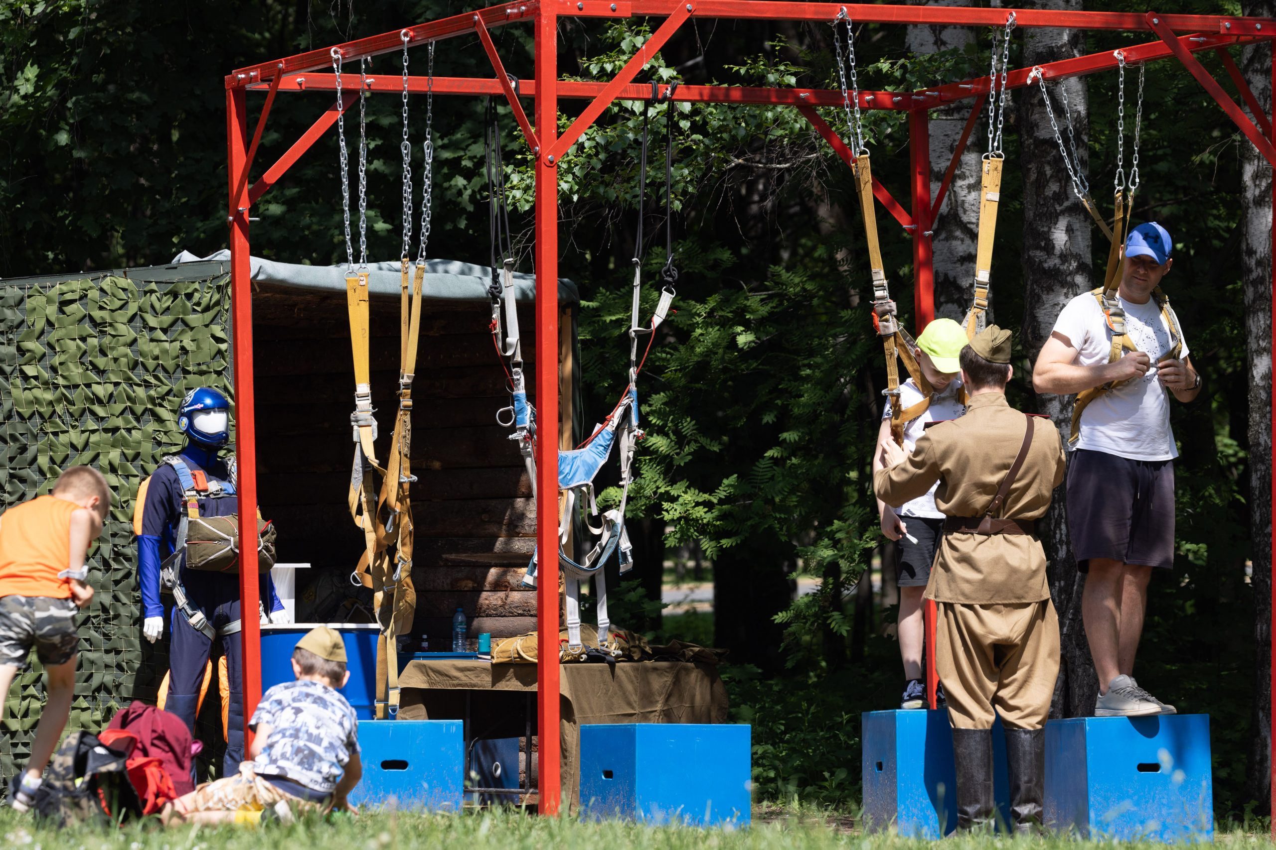 «Мне понравилась площадка парашютная, я даже попробовал побыть вот в этих стропах, инструктор объяснял, как и что нужно делать. Мне очень хочется стать воздушным десантником, и я хочу очень хорошо научиться прыгать с парашютом. И теперь хотя бы у меня есть первые знания и навыки. Ну и на самом деле здесь весело. Я с папой уже в третий раз в Парке Победы, уже почти во всех активностях участвовал, и кашу пробовал солдатскую, и, думаю, еще придем обязательно. Таких площадок больше нигде нет», — рассказал посетитель Парка Победы Александр Голубец.