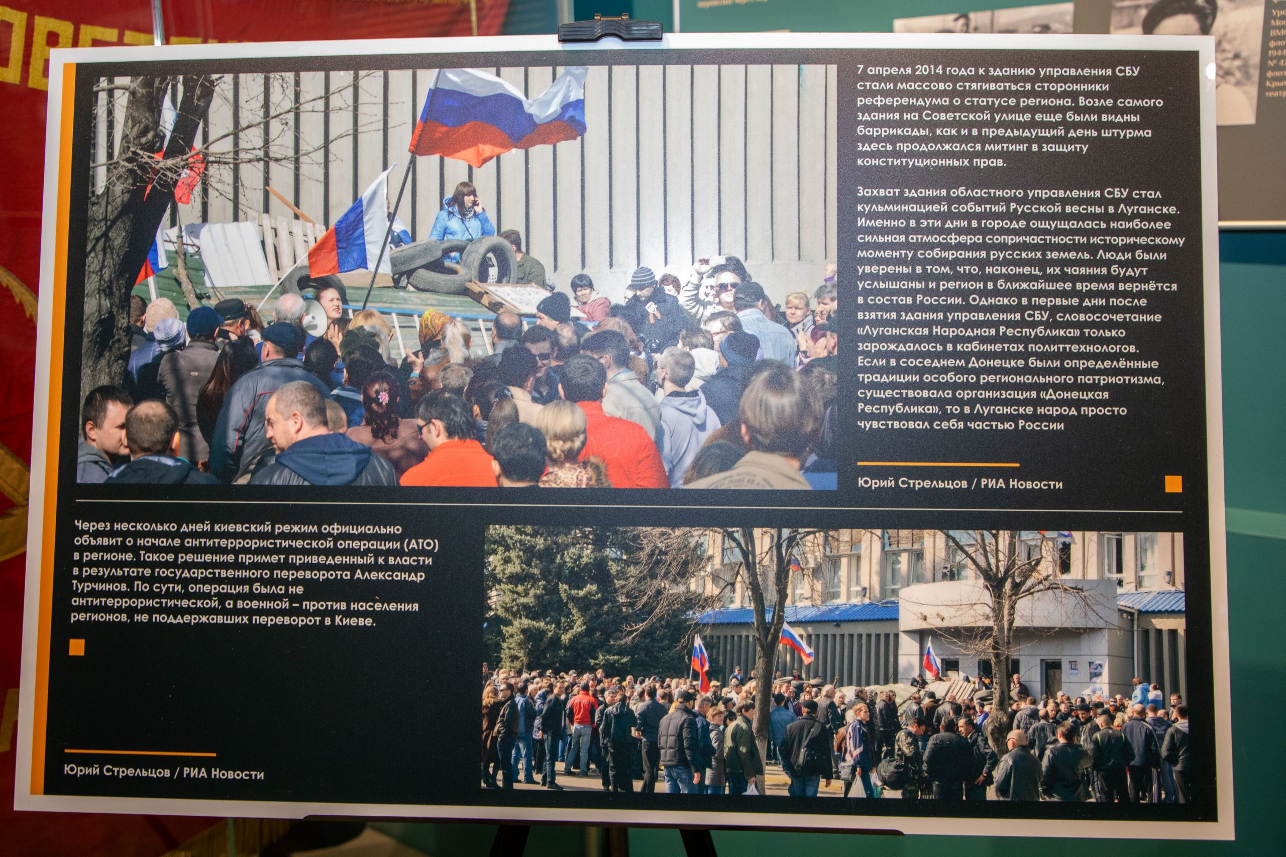 Поэтому исторической фотовыставке «Русская весна. Луганск. 2014: Даты, люди, события» отводится особая, объединяющая роль. Она нацелена на популяризацию подвигов героев «Русской весны», стоящих на защите национальных интересов Отечества, единение жителей России в условиях антироссийской риторики и поднятие патриотического духа. Фотовыставка посвящена 10-летию «Русской весны» в Луганске — взятия здания Управления СБУ в Луганской области.