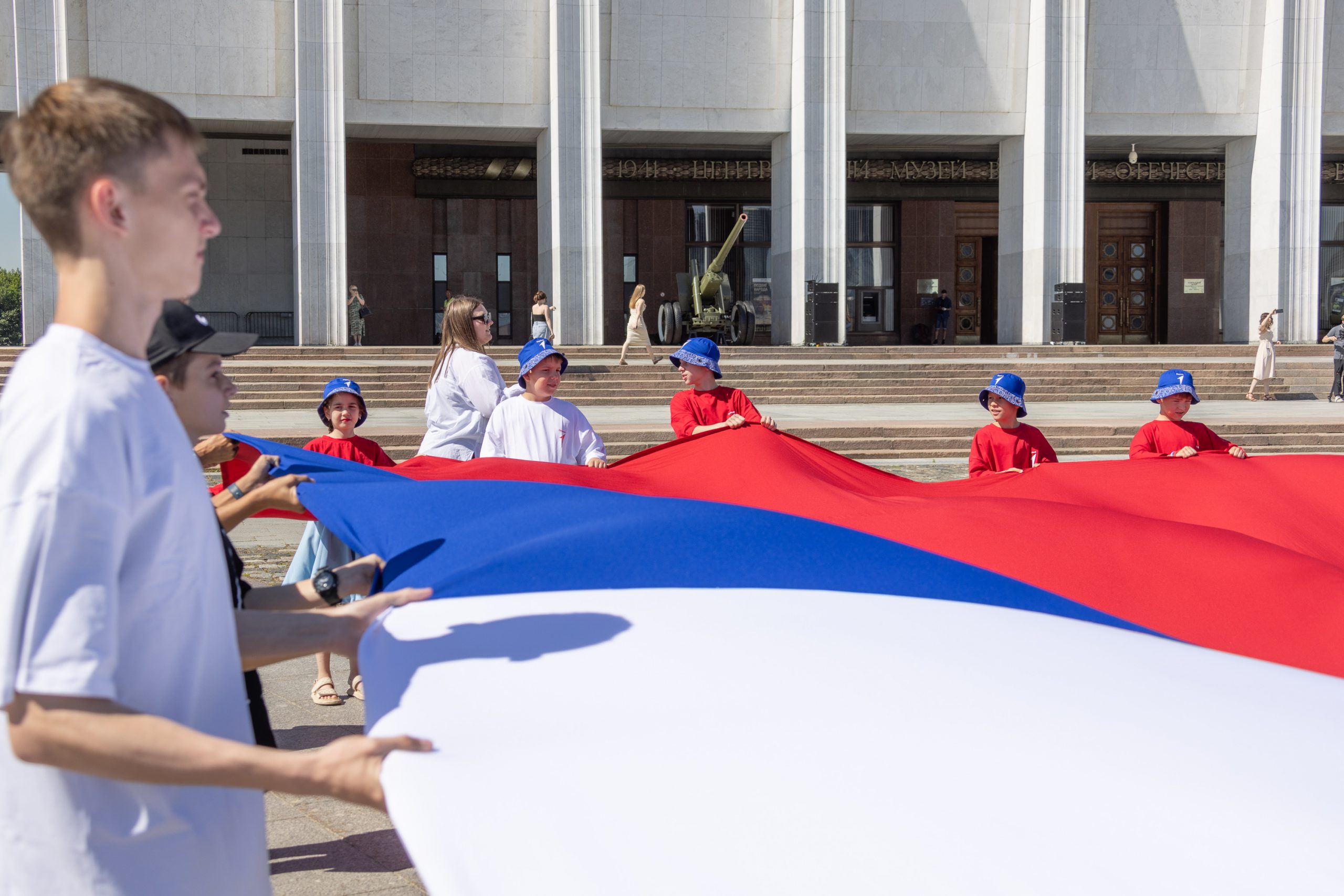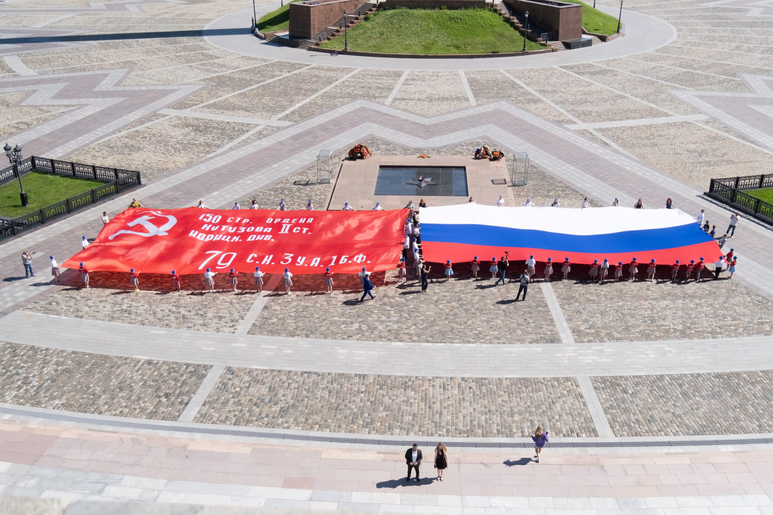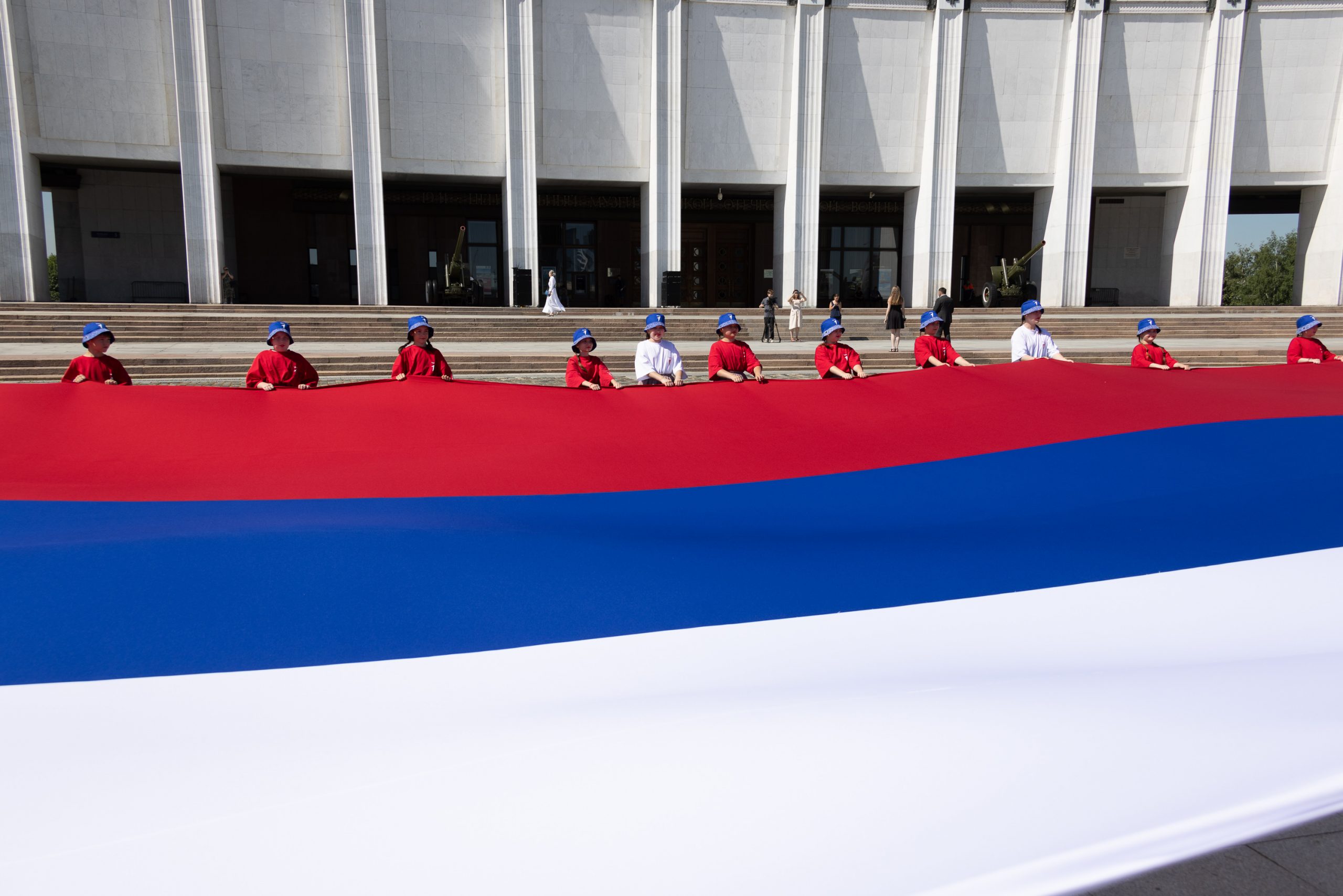 У стен главного здания Музея Победы на Поклонной горе состоялась Всероссийская акция «Наша страна — наша Россия». Участники яркого события под патриотические песни развернули государственный флаг Российской Федерации и копию Знамени Победы — полотнища площадью 200 квадратных метров.