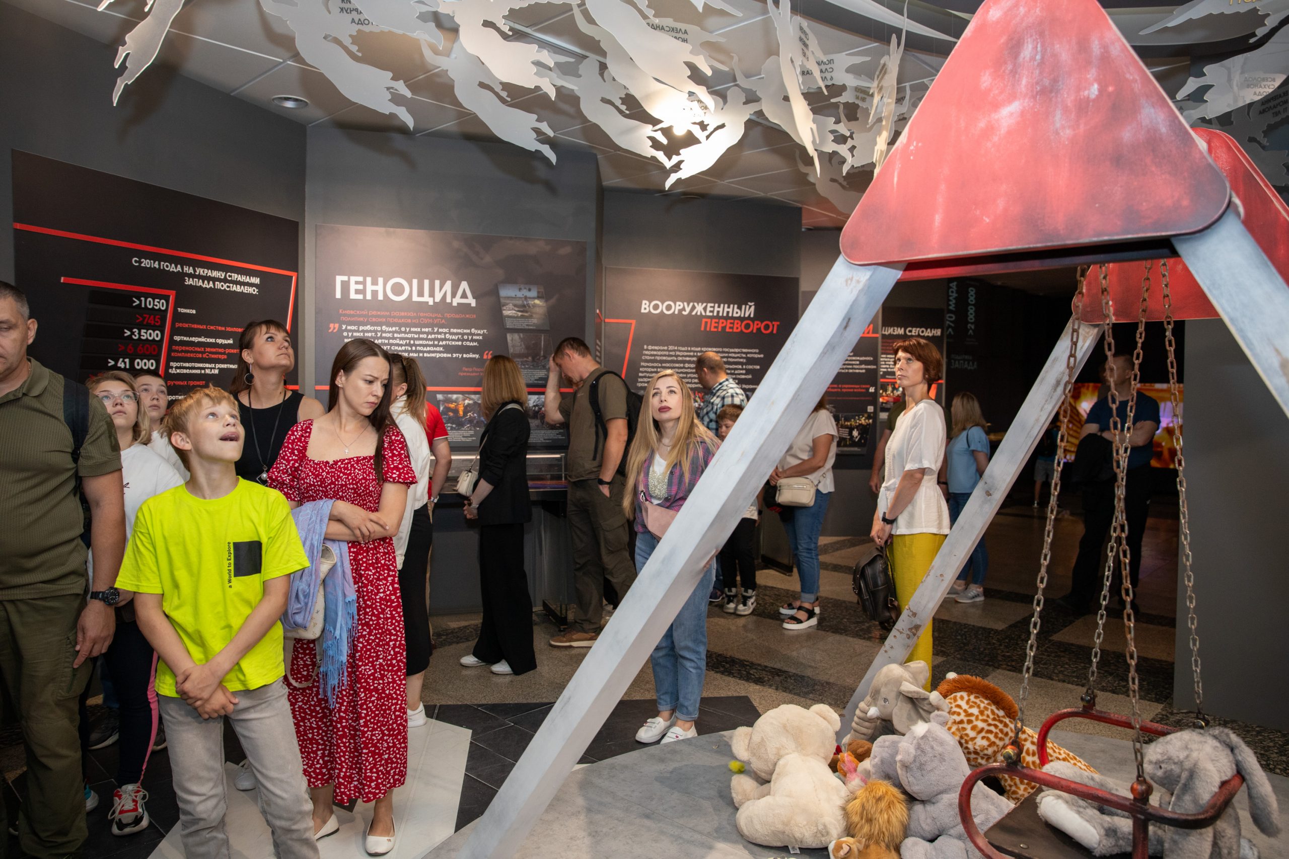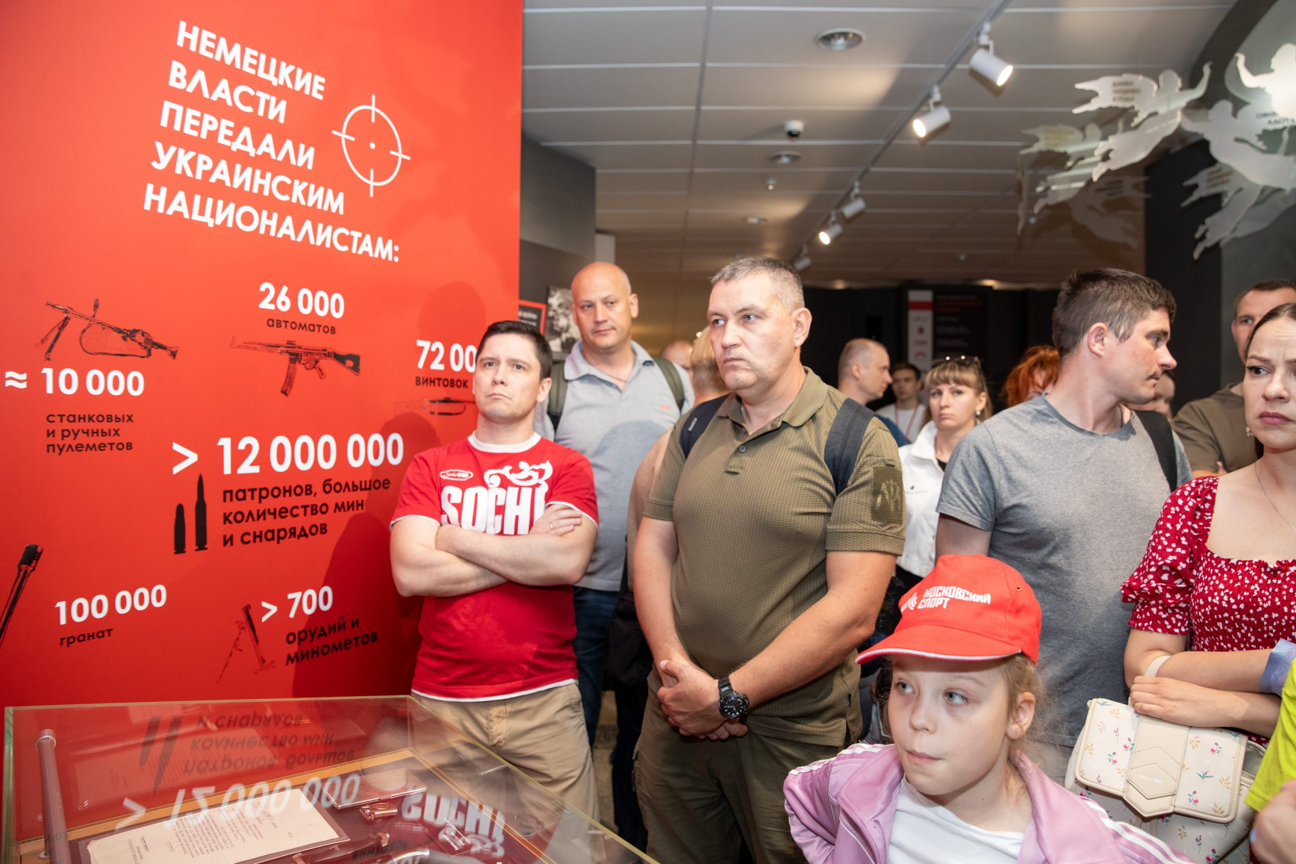 «На меня несколько разделов выставки «Обыкновенный нацизм» произвели глубокое впечатление. Особенно посвященные погибшим украинским детям — слезы наворачиваются на глаза. Мы это переживаем как родители, ведь дети — это наше будущее! И пропагандистская литература поразила, которая представлена здесь, на ней украинской молодежи прививают неприязнь к тем, кто хочет говорить на русском языке или любит Россию! Это же кто-то делает, кто-то подпитывает! Поэтому наша задача — это поддержка тех, кто на передовой, единство и победа!» — рассказал Константин Александров (город Орел).