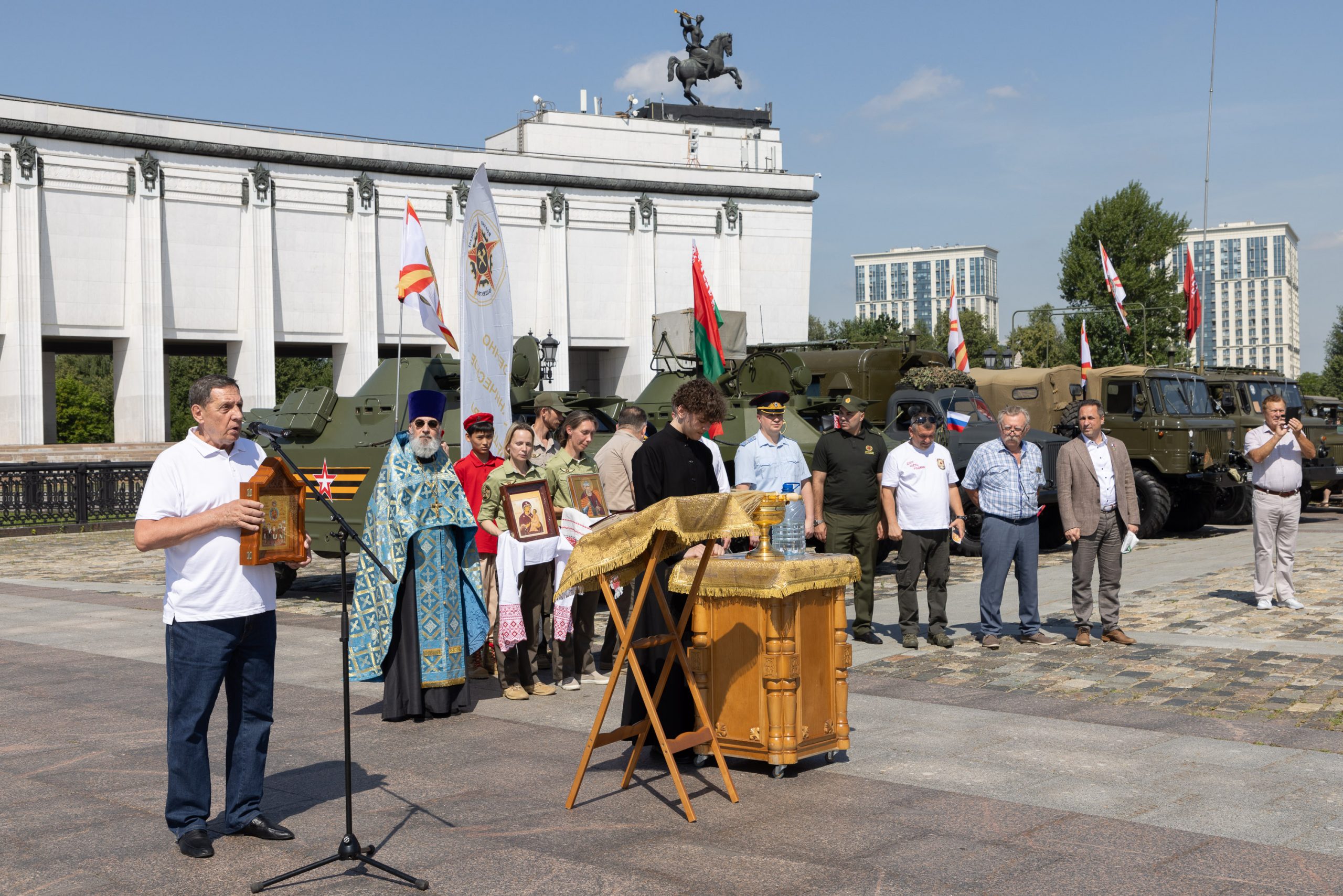 Участники бронепробега «Дорога мужества» провезут икону-объединительницу «Собор Небесных Покровителей Лавр Святой Руси». Святыню передали организаторам во время старта памятной акции около Музея Победы.