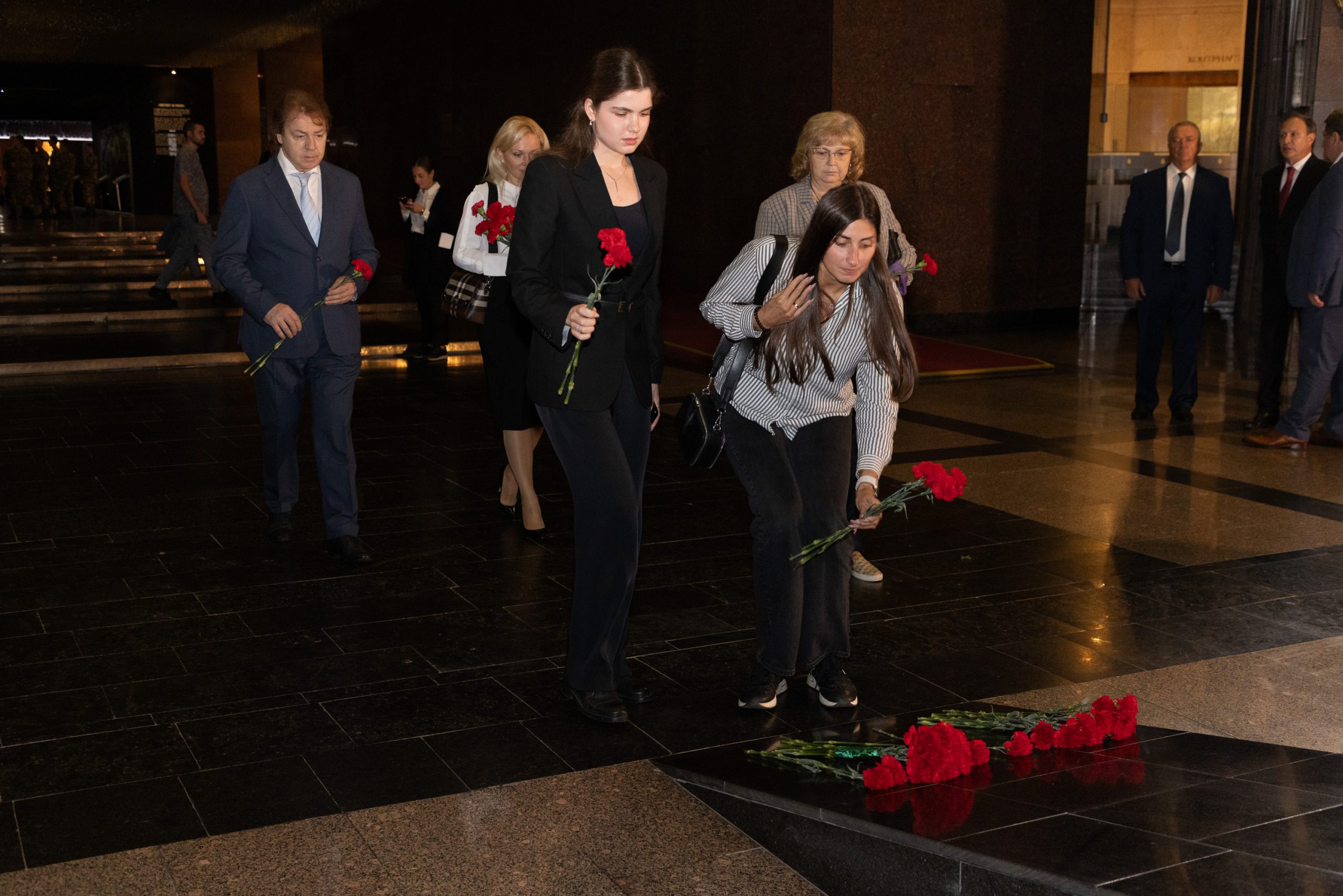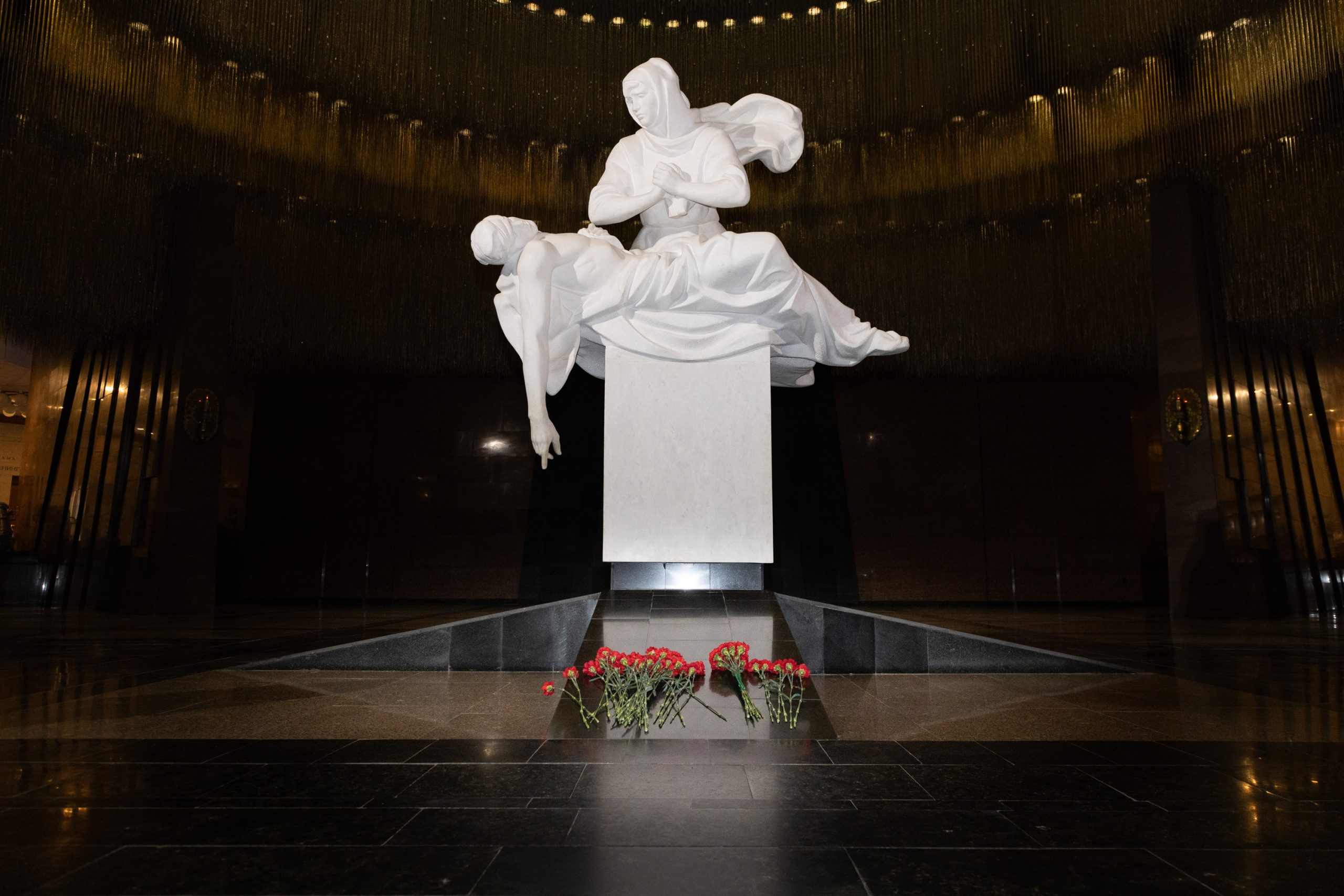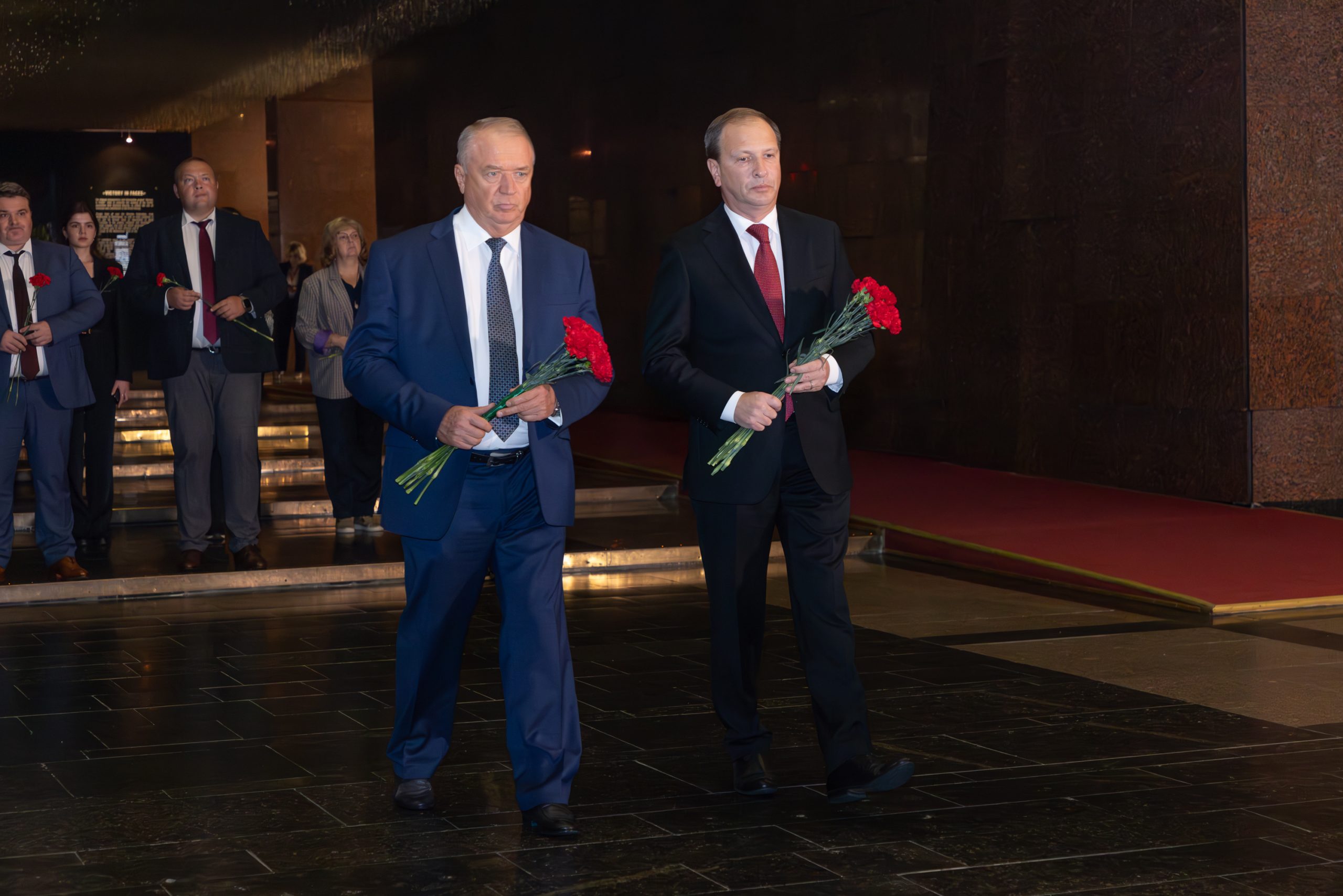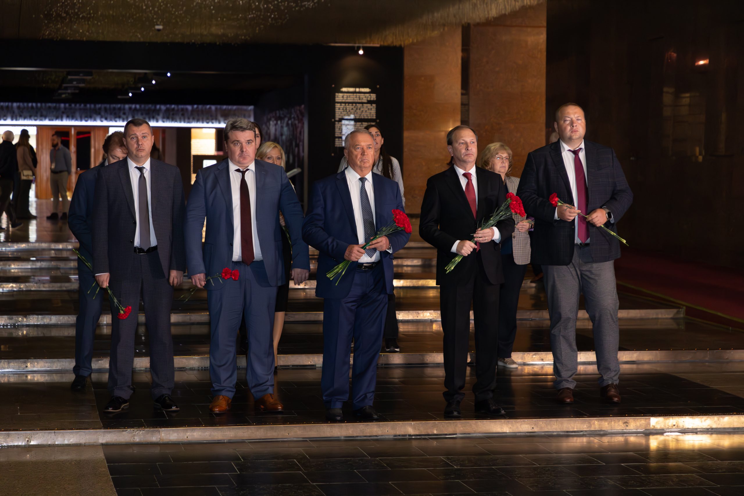 В Зале Памяти и Скорби гости возложили цветы к скульптурной группе «Скорбь» и почтили память погибших в годы Великой Отечественной войны минутой молчания.