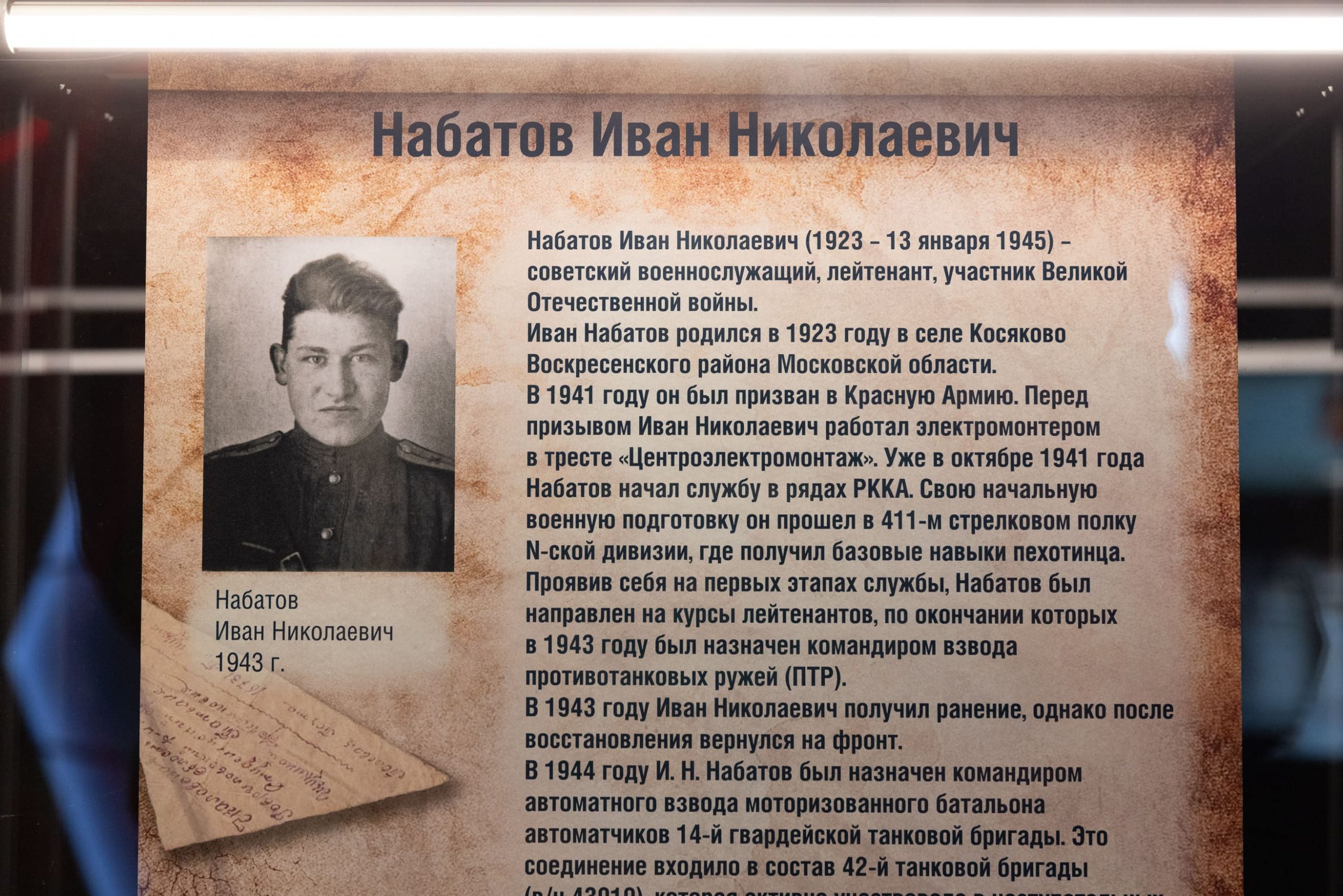 «На выставке представили личные предметы Ивана Николаевича, переданные в дар Музею Победы его братом Виктором Николаевичем Набатовым. Посетители увидят фронтовые письма на почтовых карточках и письмо-треугольник, отправленные Иваном Набатовым своей матери в Москву в период с 1943 по 1945 год, а также письмо командира роты, в которой служил Набатов, адресованное матери солдата, в котором сообщается о гибели ее сына при форсировании реки Нида. Также среди реликвий — трудовая книжка и другие документы, повседневные погоны лейтенанта артиллерии РККА образца 1943 года, портретная фотография героя военных лет», — рассказали в Музее Победы.