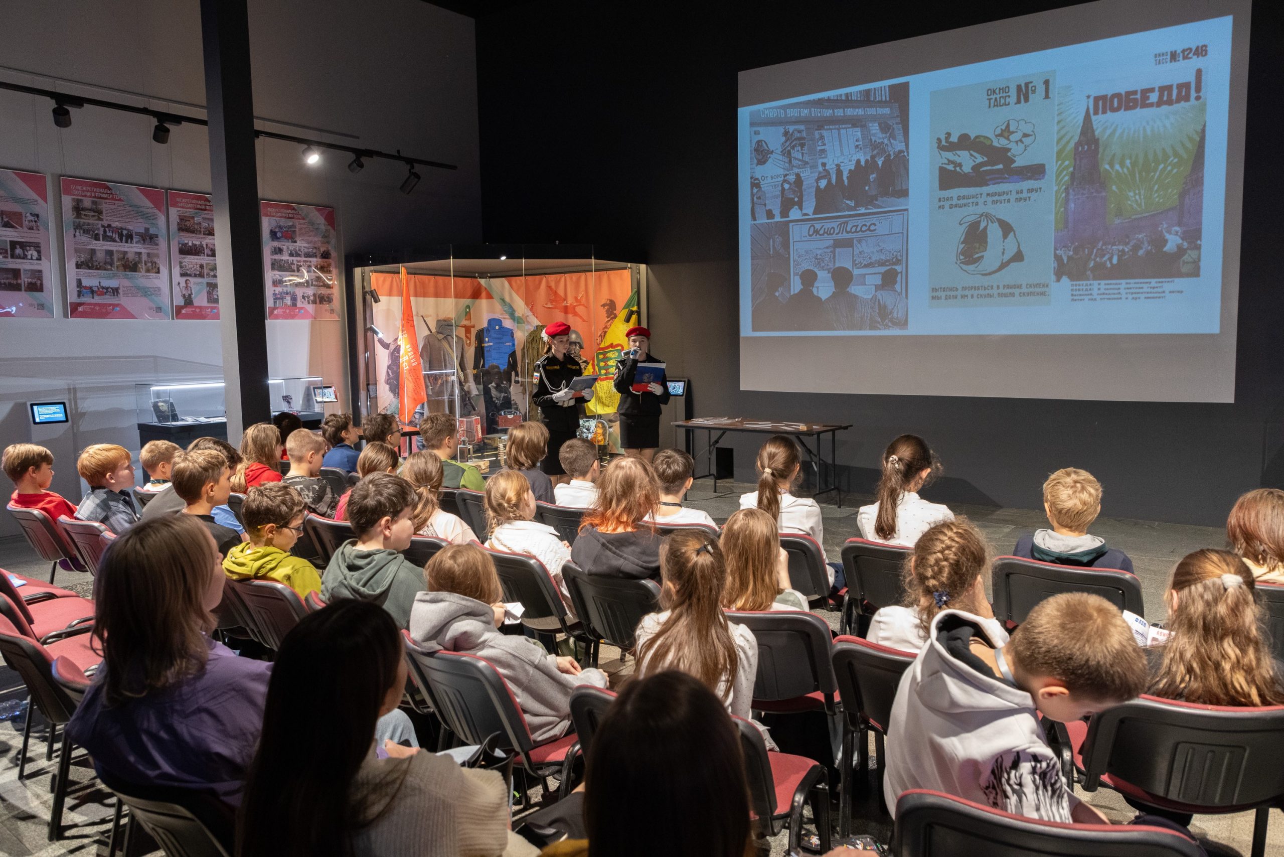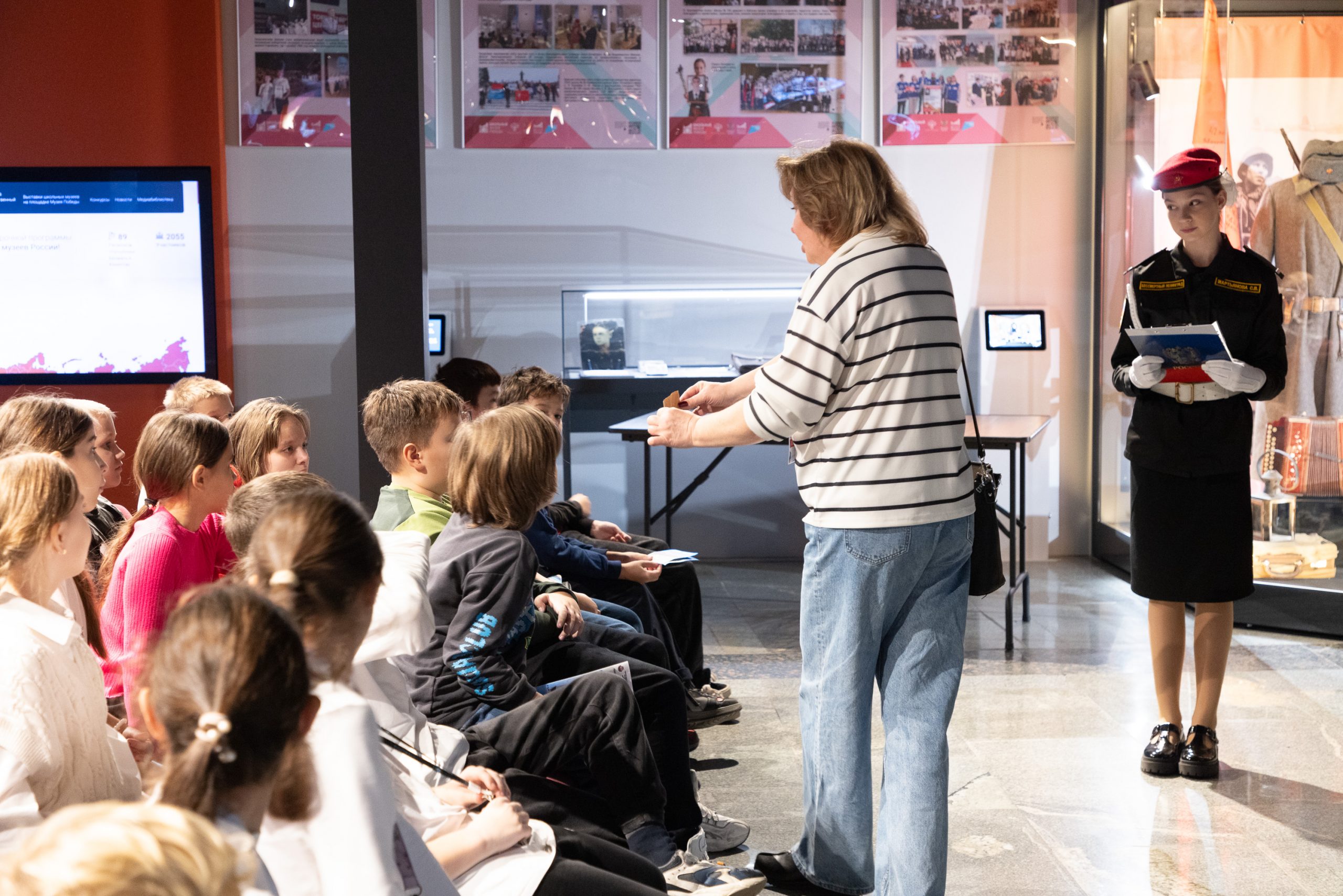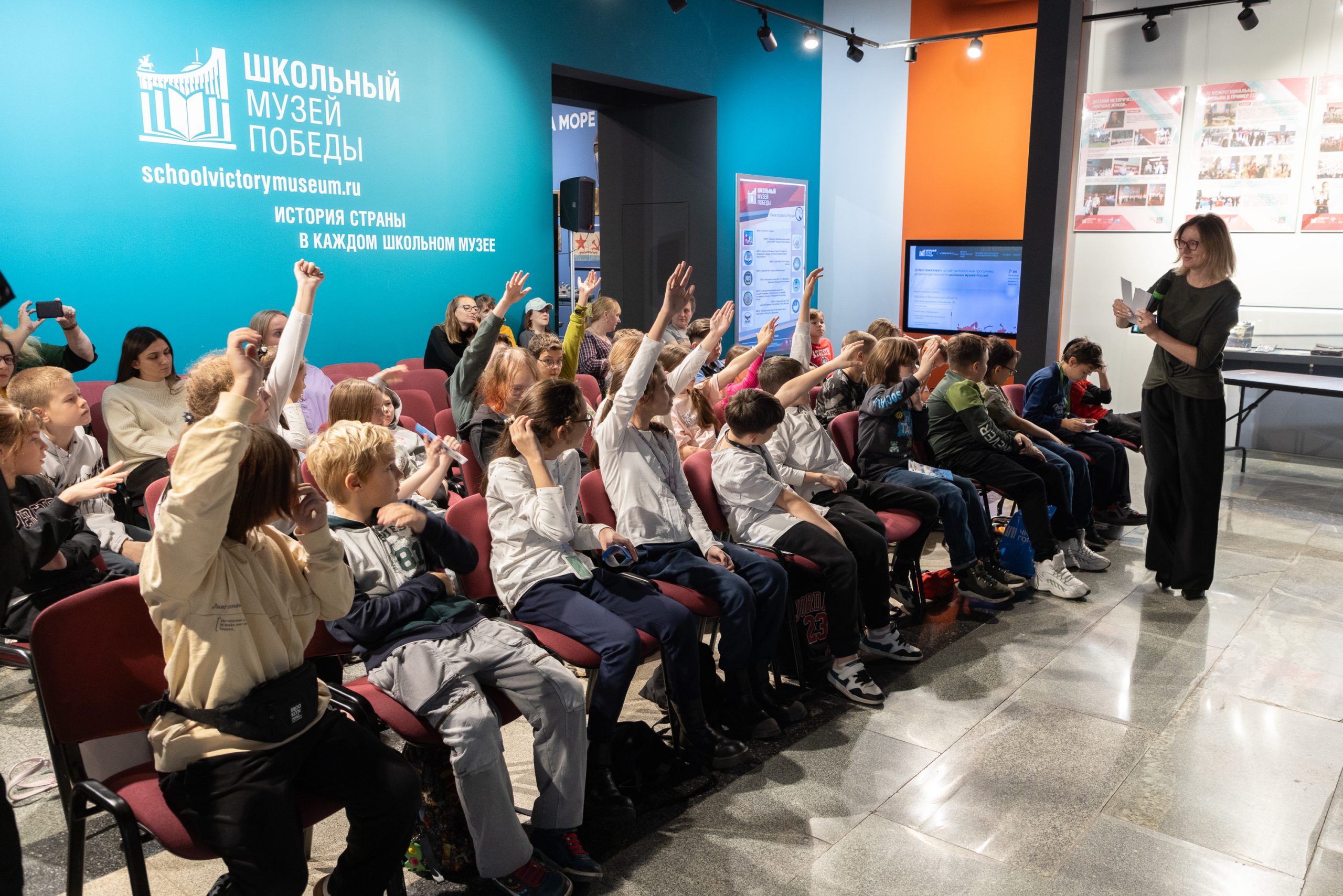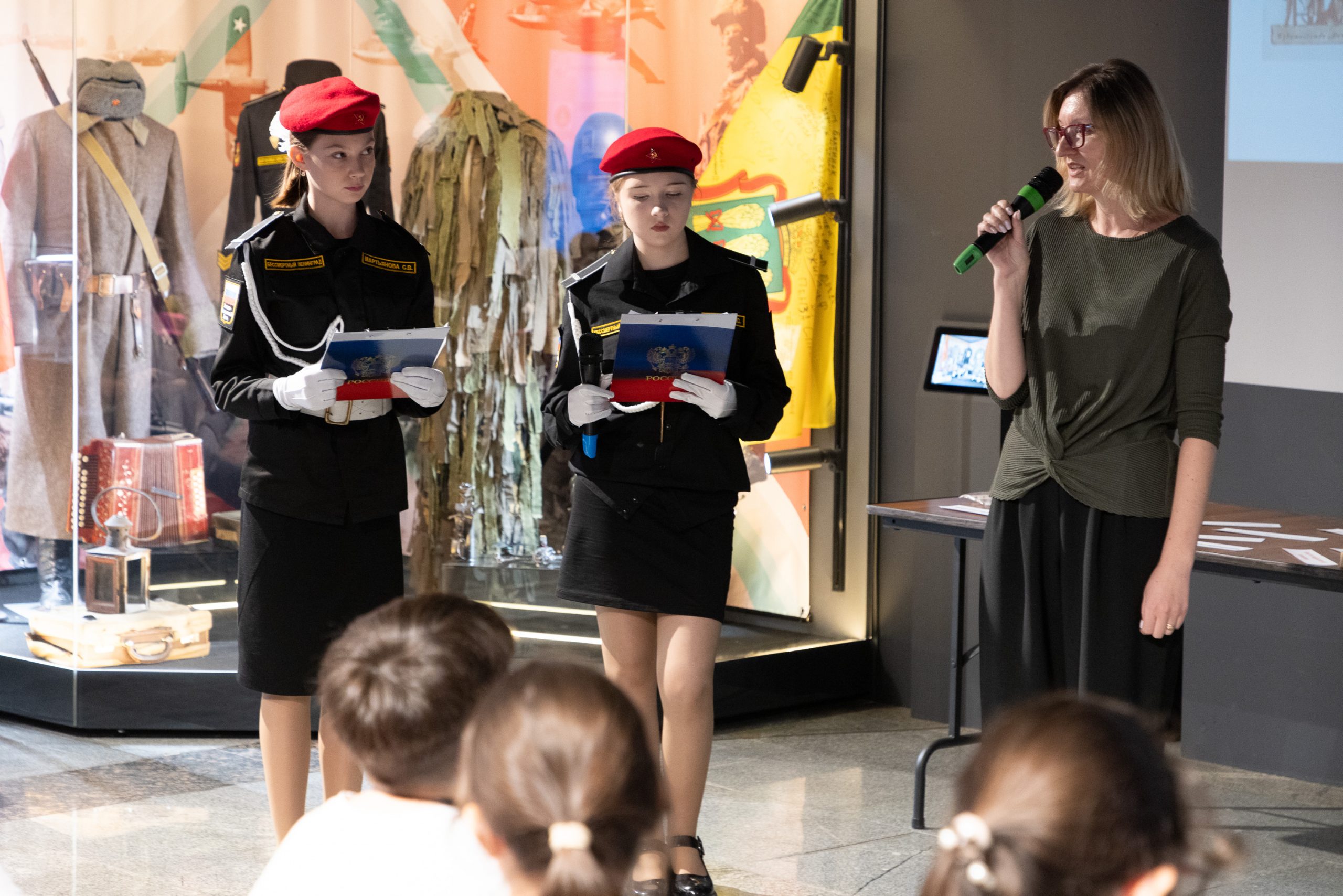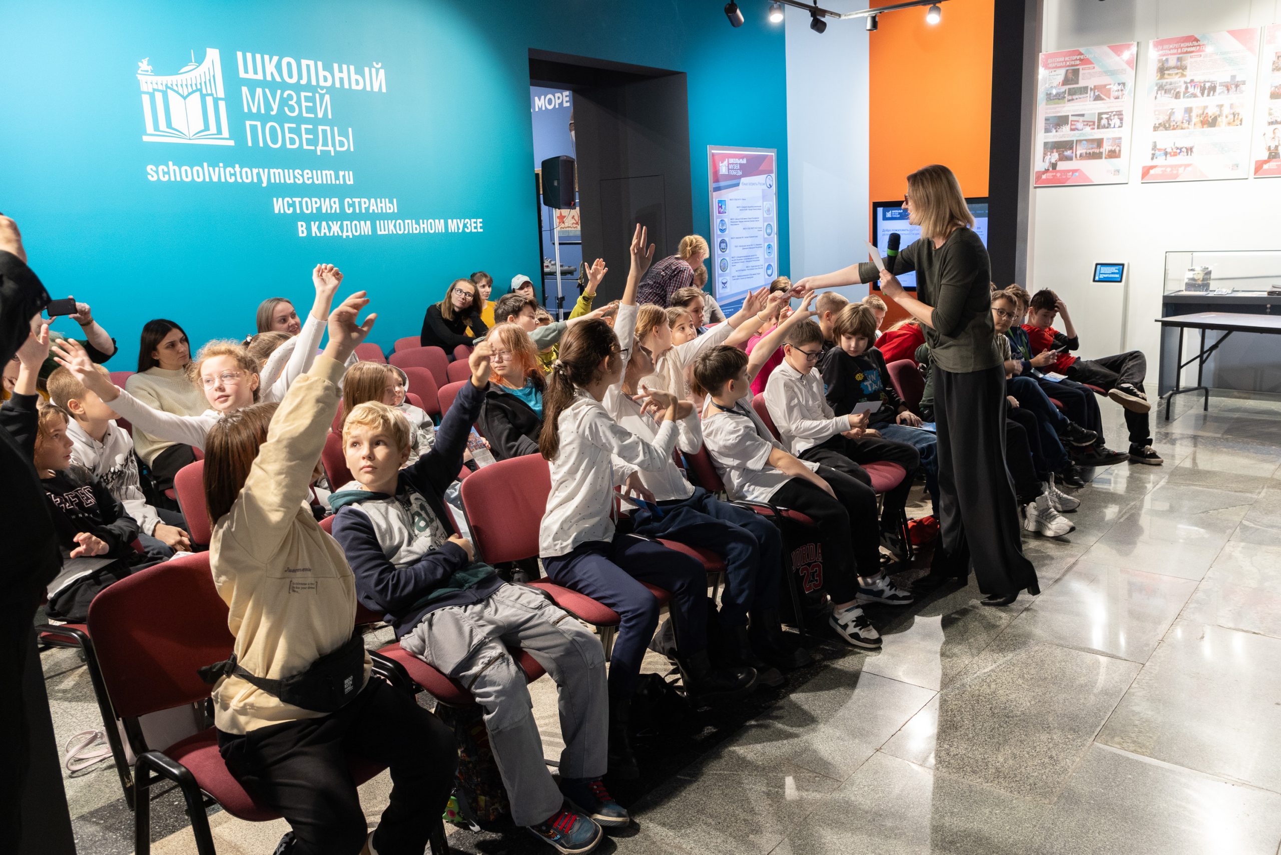 Занятие для учащихся московской школы № 158 проходило в рамках работы выставки «Достойная смена героям», посвященной защитникам Родины времен Великой Отечественной и современным героям.