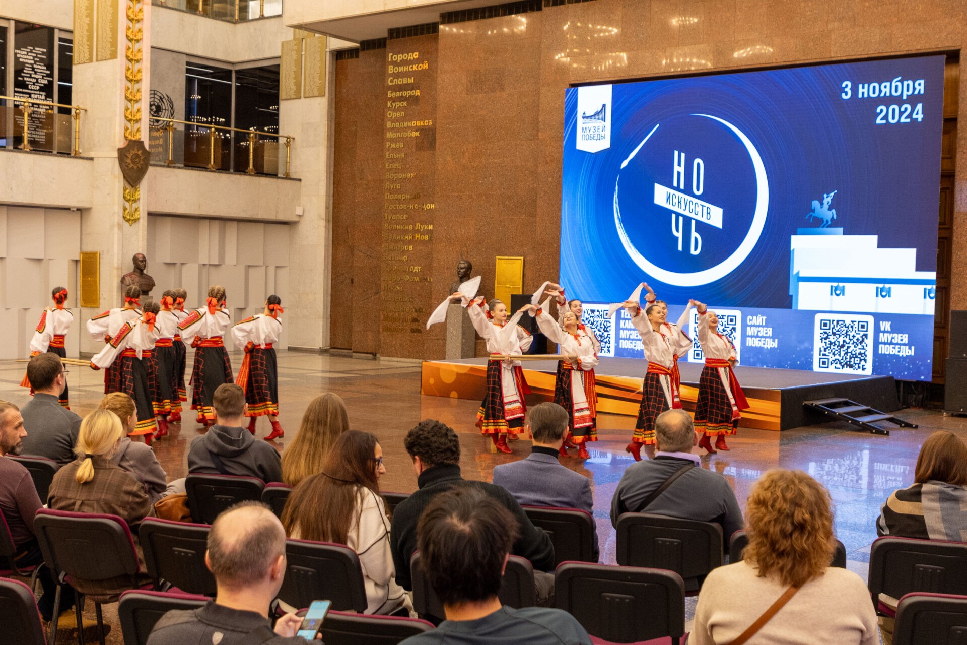 Посетители Музея Победы приняли участие в праздничном концерте, который состоялся в рамках Всероссийской акции «Ночь искусств». На сцене в Зале Полководцев выступил московский танцевальный коллектив «Краски лета».