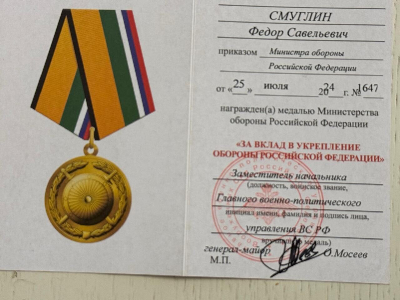Заместитель генерального директора Музея Победы вице-адмирал Федор Смуглин награжден медалью Министерства обороны РФ «За вклад в укрепление обороны Российской Федерации». Награду Федору Савельевичу вручили в ходе Отчетно-выборной конференции Общероссийской общественной организации ветеранов Вооруженных Сил РФ, которая состоялась в Центральном Доме Российской Армии.