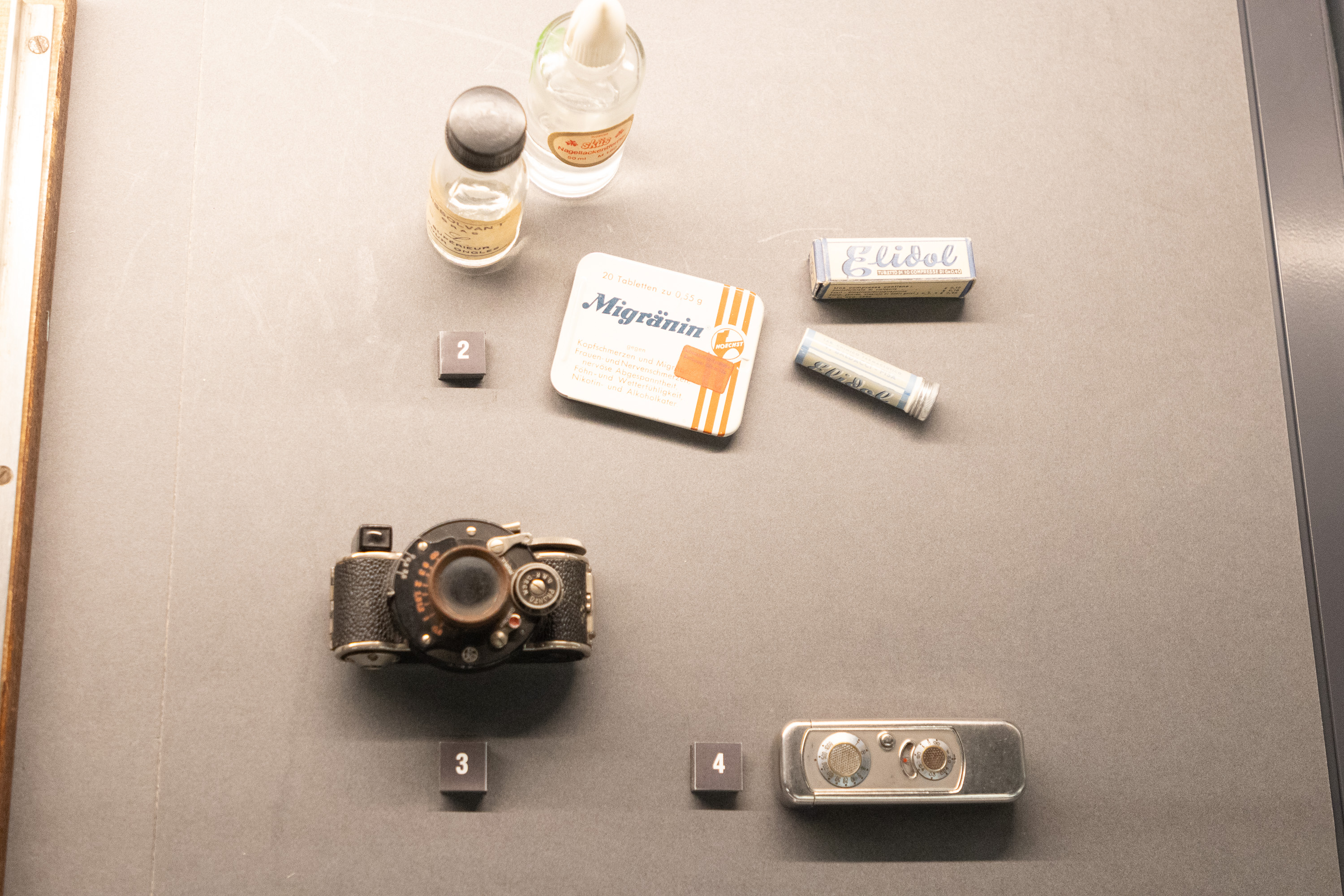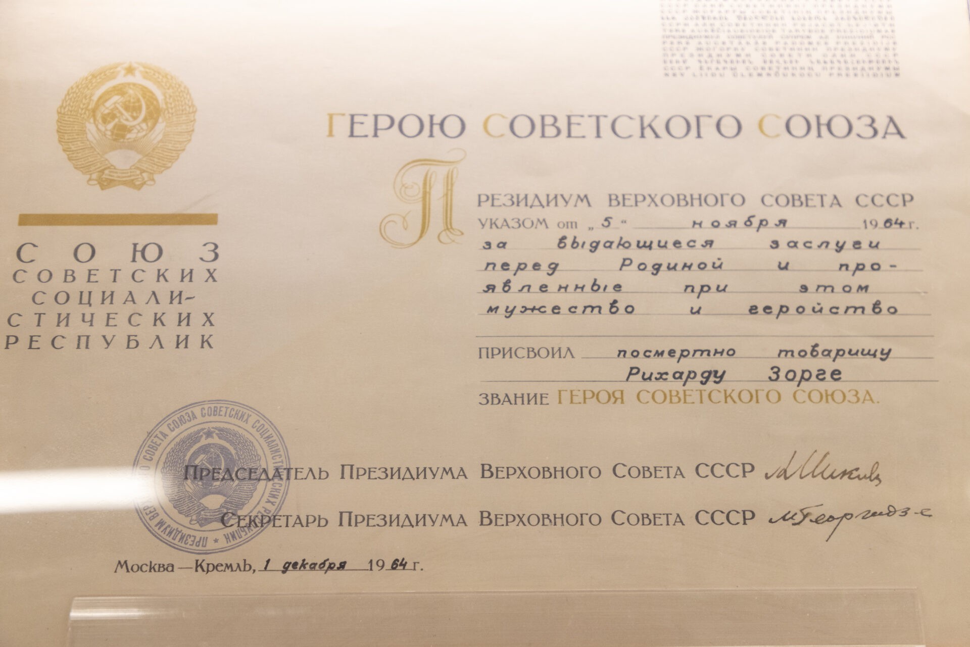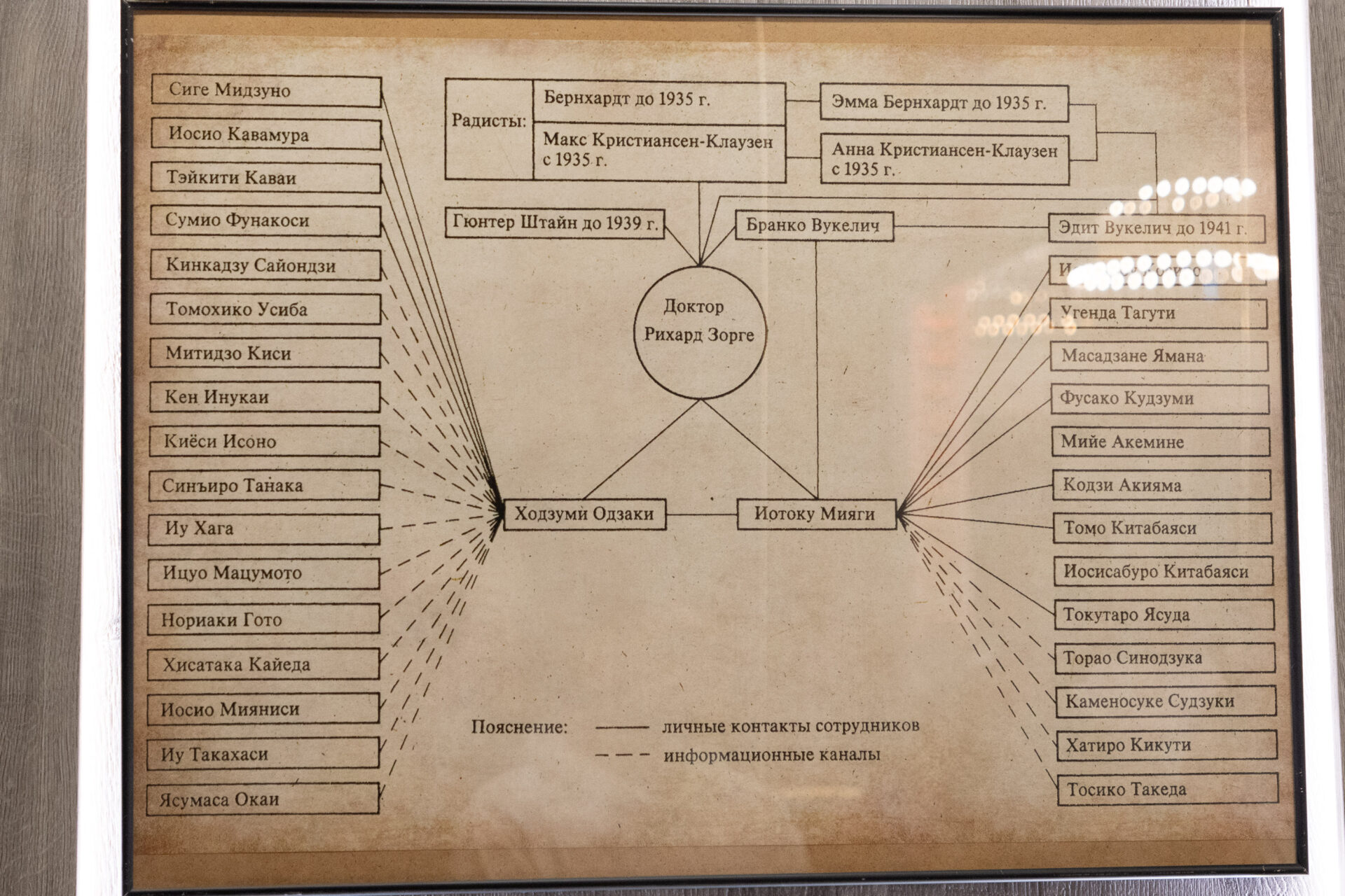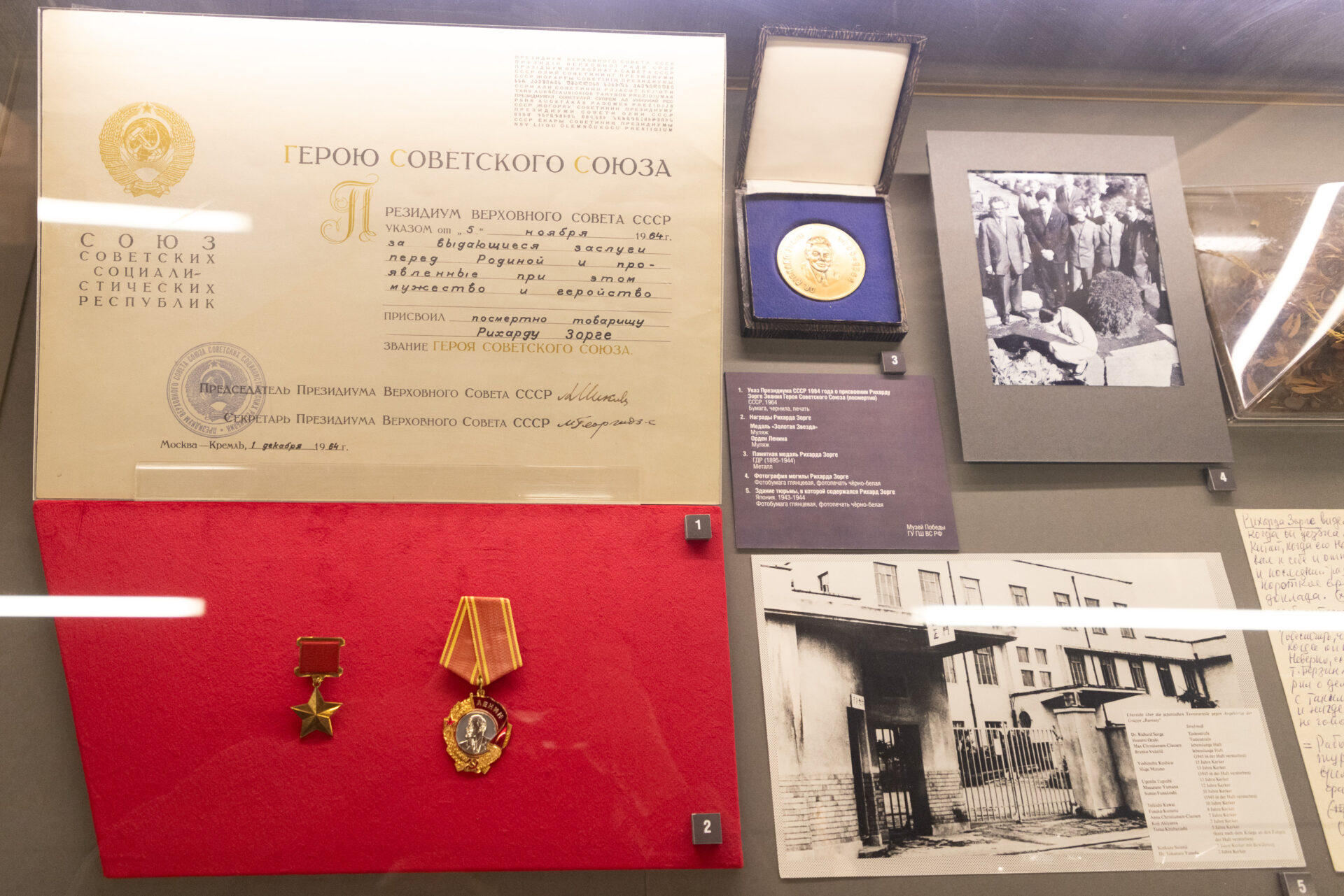 Уникальным экспонатом является фотоаппарат Minifex 1930-х годов — один из первых фотоаппаратов, специально разработанных для скрытой съемки, который использовался агентами. Посетители также увидят личные вещи разведчика — самовар с подносом из семейной коллекции Зорге, его кресло и предметы одежды. Экспозицию дополнят портреты Зорге, марки с его изображением, книги и воспоминания о разведчике.