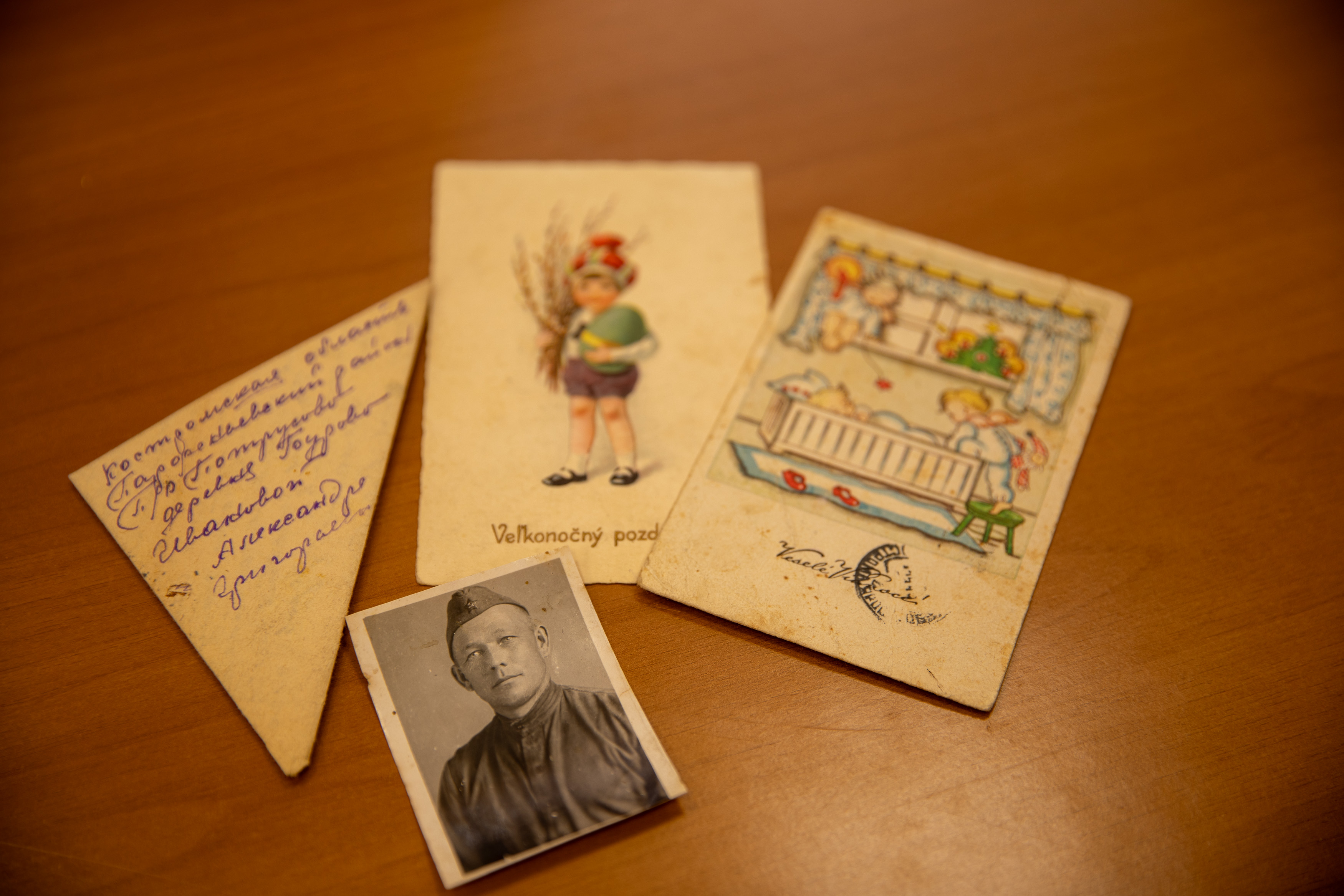 Семья передала в музей хорошо сохранившиеся фронтовое письмо-треугольник, датированное 15 апреля 1945 года, и две открытки от февраля и апреля 1945 года, которые участник Великой Отечественной войны отправил любимой дочери, находясь в Чехословакии.