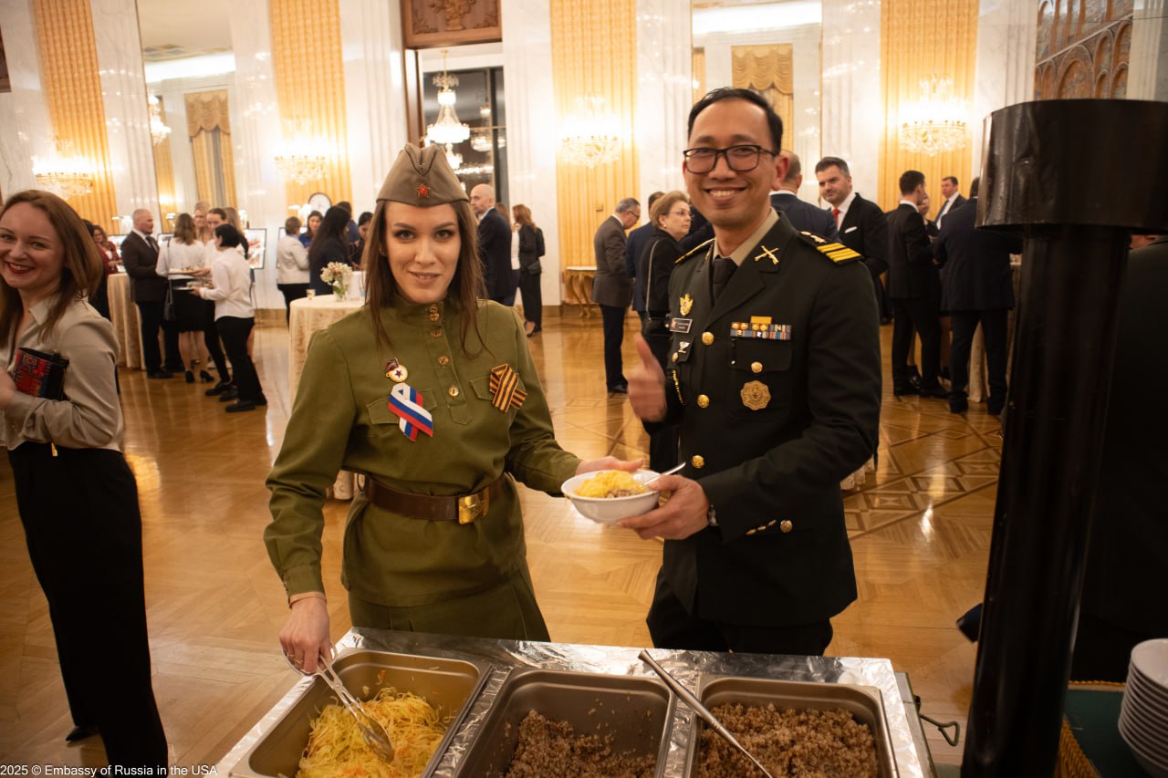 В приветственном слове Временный поверенный в делах России в США А. В. Ким отметил всенародный характер праздника, неразрывно связанного с героическими подвигами Красной Армии, разгромившей гитлеровскую военную машину 80 лет назад и спасшей многие народы от уничтожения. Подчеркнул, что сегодня российские Вооруженные Силы продолжают славные воинские традиции, мужественно сражаются в зоне специальной военной операции и успешно избавляют Украину от нацистов.