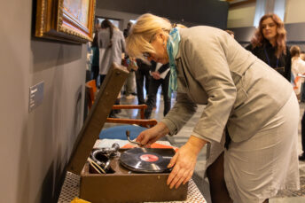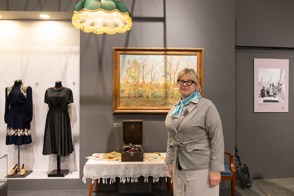 На церемонии открытия выставки «Красота Победы» внучка поэта-фронтовика Алексея Фатьянова Анна Фатьянова передала в дар Музею Победы трофейный патефон.