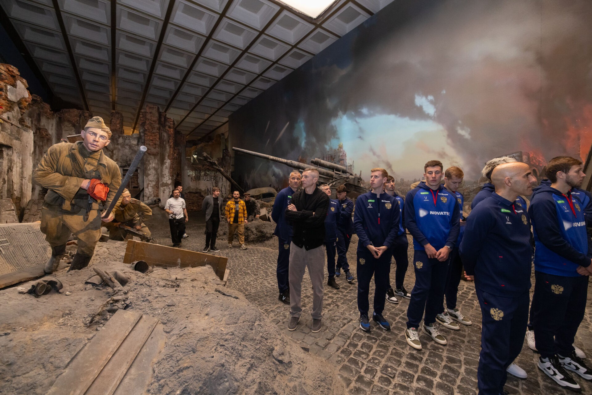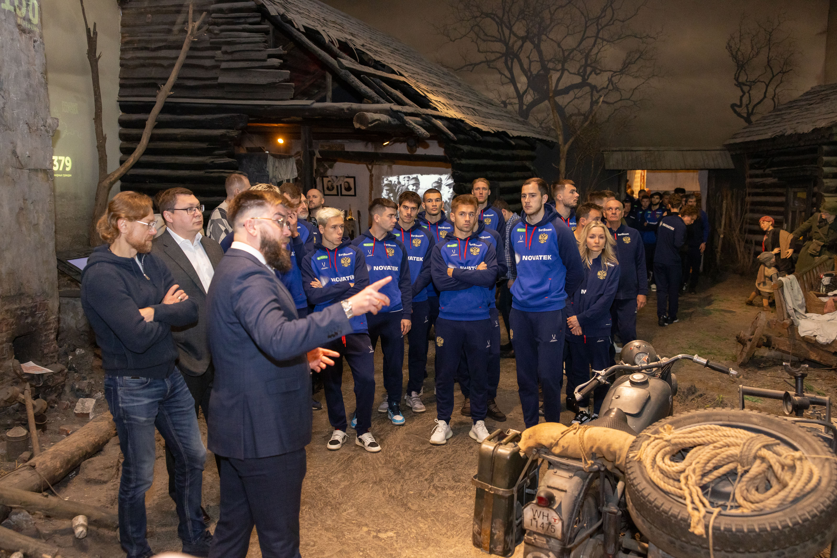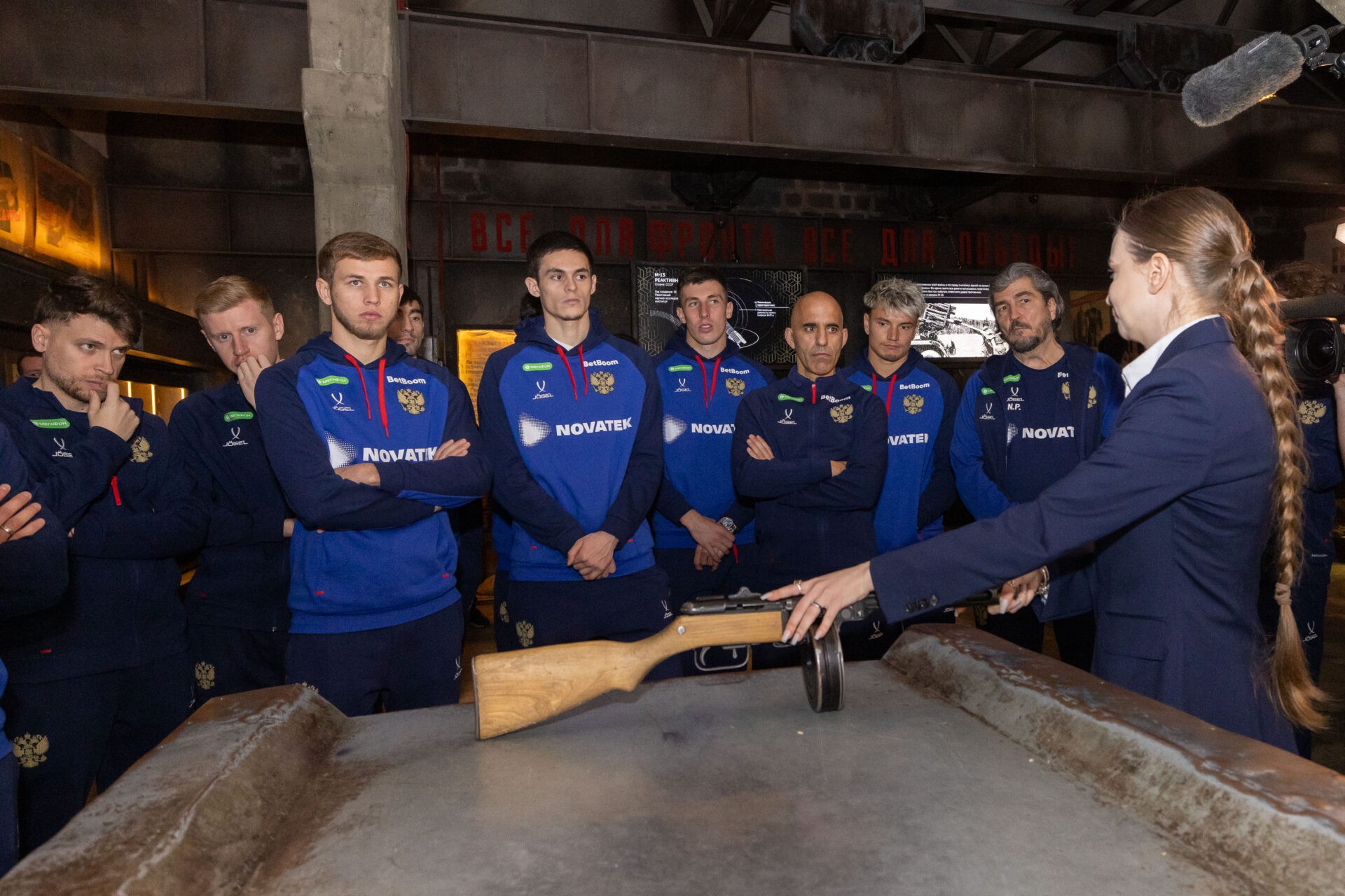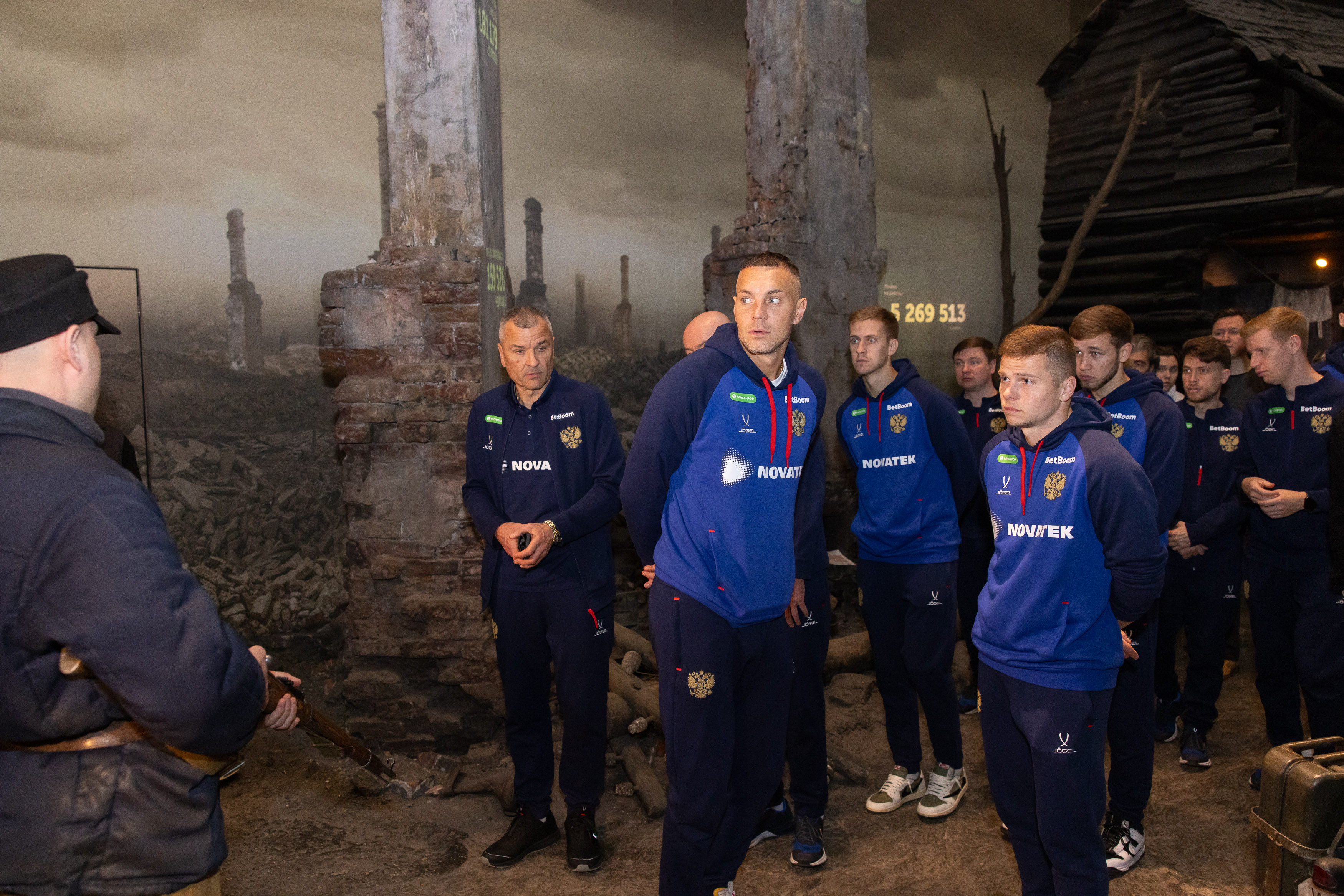 Национальная сборная России по футболу посетила уникальную иммерсивную экспозицию «Подвиг Народа». Вместе со спортсменами в Музее Победы также побывали тренеры. Главный тренер сборной России Валерий Карпин сказал, что этот визит очень важный и приурочен к юбилею Победы.