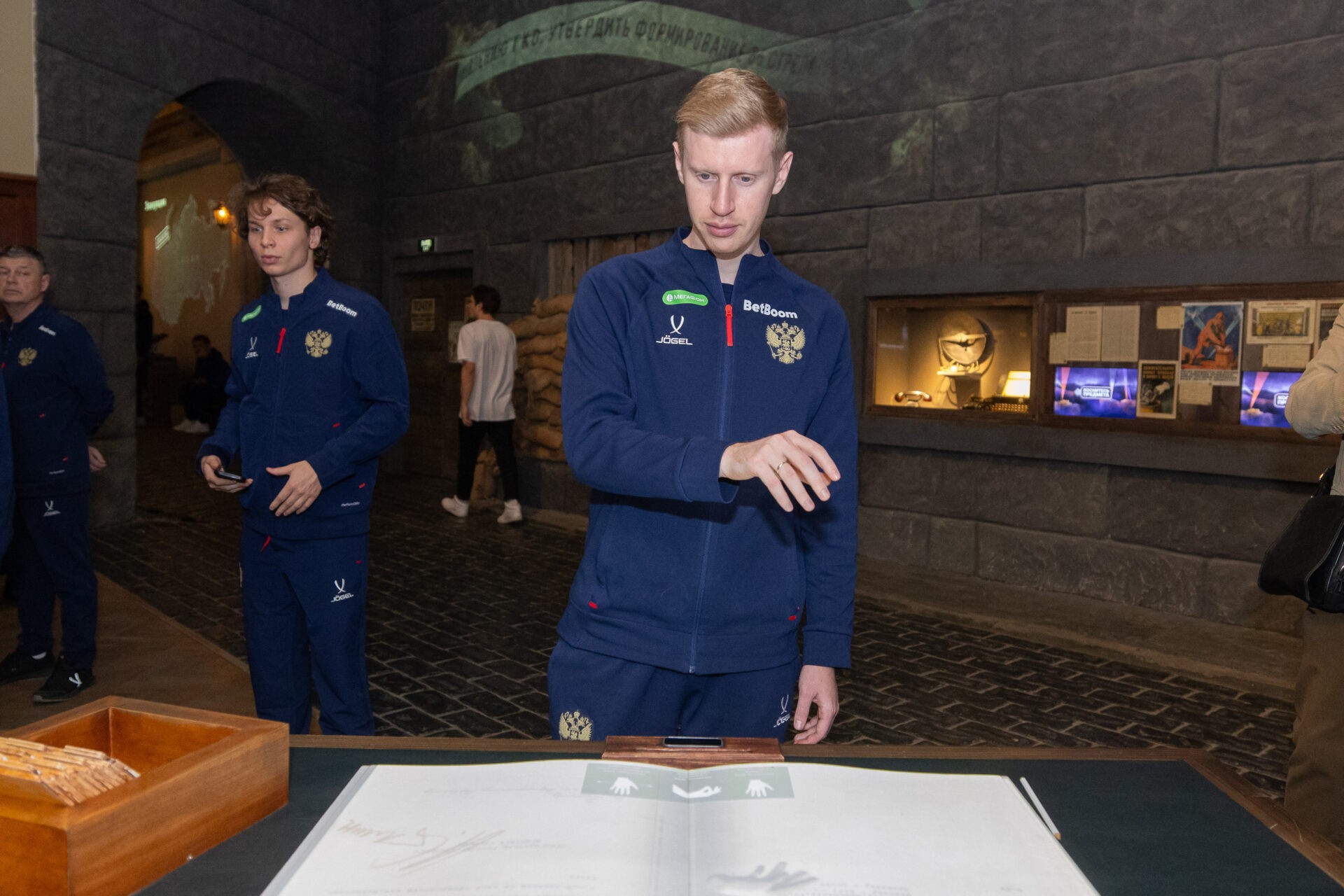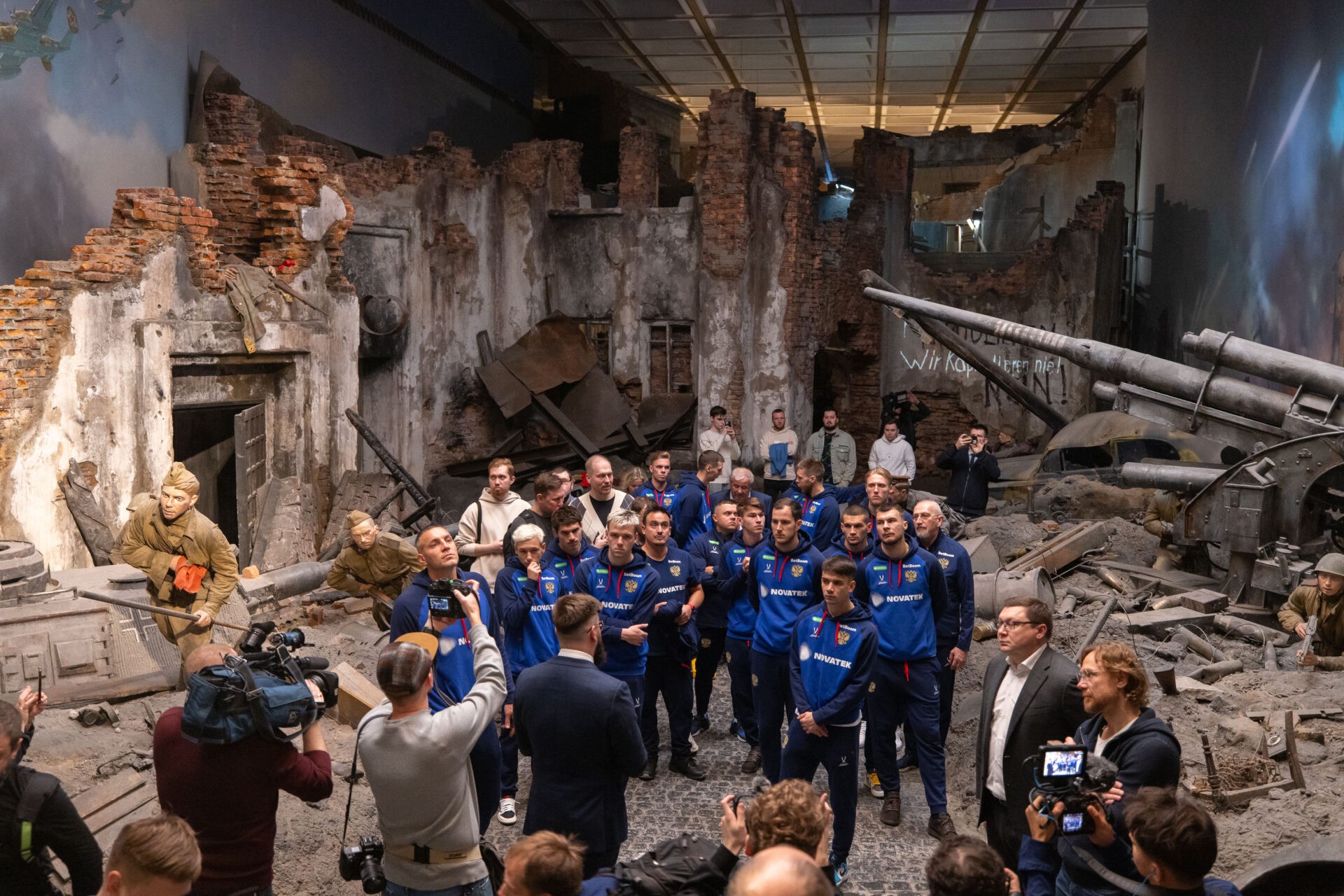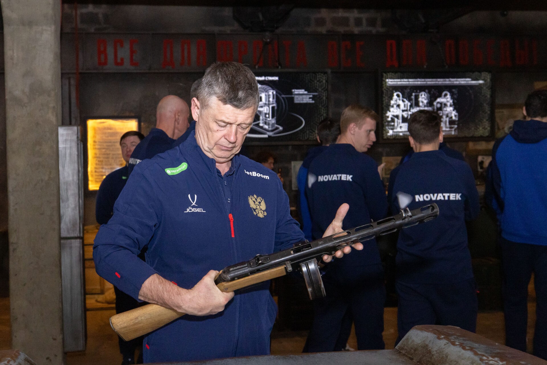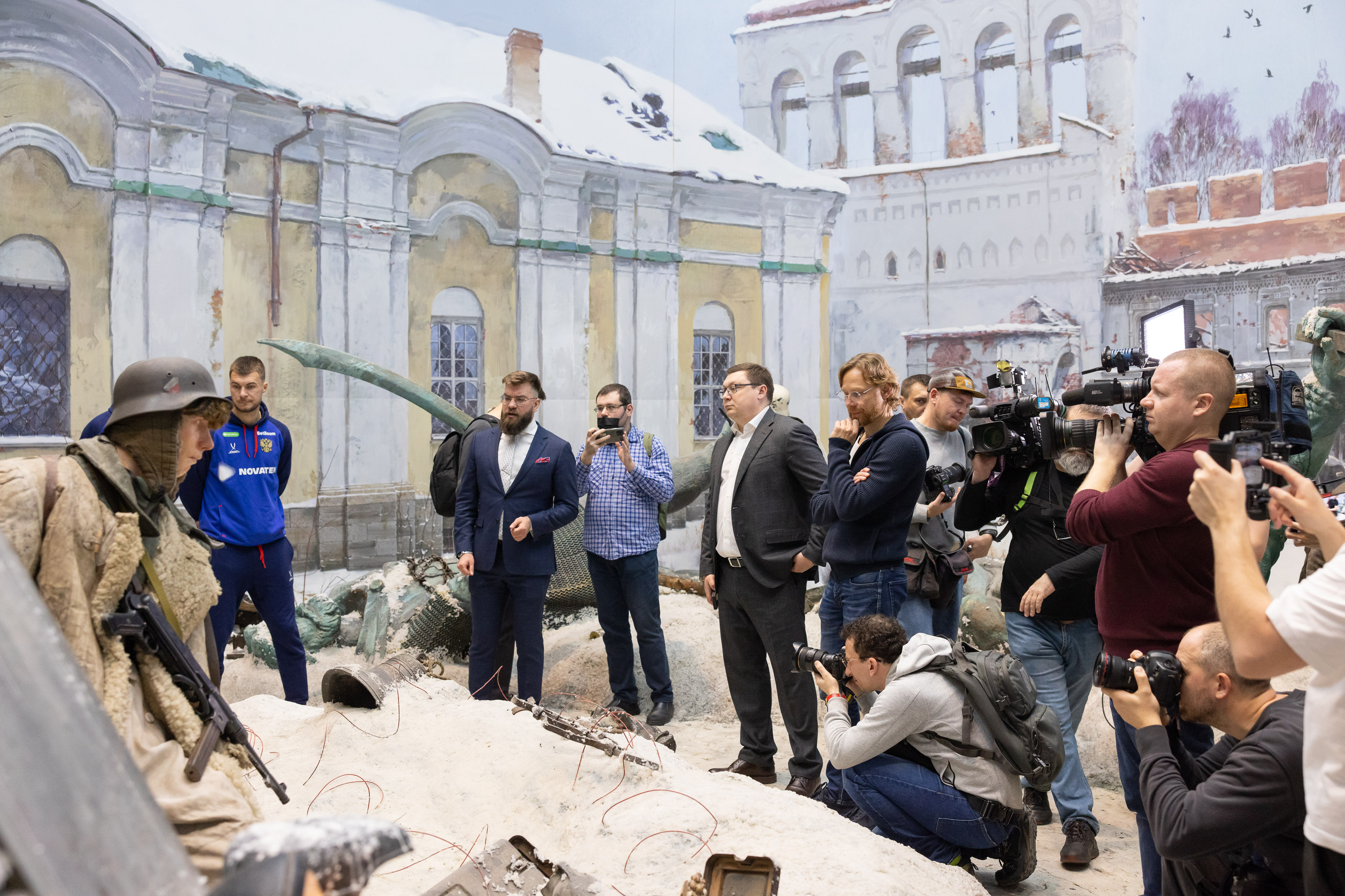 Национальная сборная России по футболу посетила уникальную иммерсивную экспозицию «Подвиг Народа». Вместе со спортсменами в Музее Победы также побывали тренеры. Главный тренер сборной России Валерий Карпин сказал, что этот визит очень важный и приурочен к юбилею Победы.
