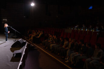 «Мы показали фрагмент литературно-музыкальной композиции «Колокола» по произведениям Эйжена Вевериса. Это латышский поэт, который сам был узником в концлагере Маутхаузен. Он уцелел, он выжил, по воспоминаниям о том, что было там, создал свой поэтический дневник, который был опубликован спустя 20 лет после освобождения. Некоторые фрагменты из этого — настолько живущие, мягкие, говорящие о том времени, дающие понимание того, как жили, в каких условиях существовали, с какими эмоциями, с какими чувствами возникли концлагеря, — мы постарались передать на сцене. И заканчивается все, конечно, их освобождением. Последние слова этой композиции «Гудите, любимого города вещие колокола!», поэтому композиция и носит название этих финальных слов — «Колокола», — рассказала педагог дополнительного образования, руководитель мюзикл-студии «Звуки музыки» Екатерина Кучинская.